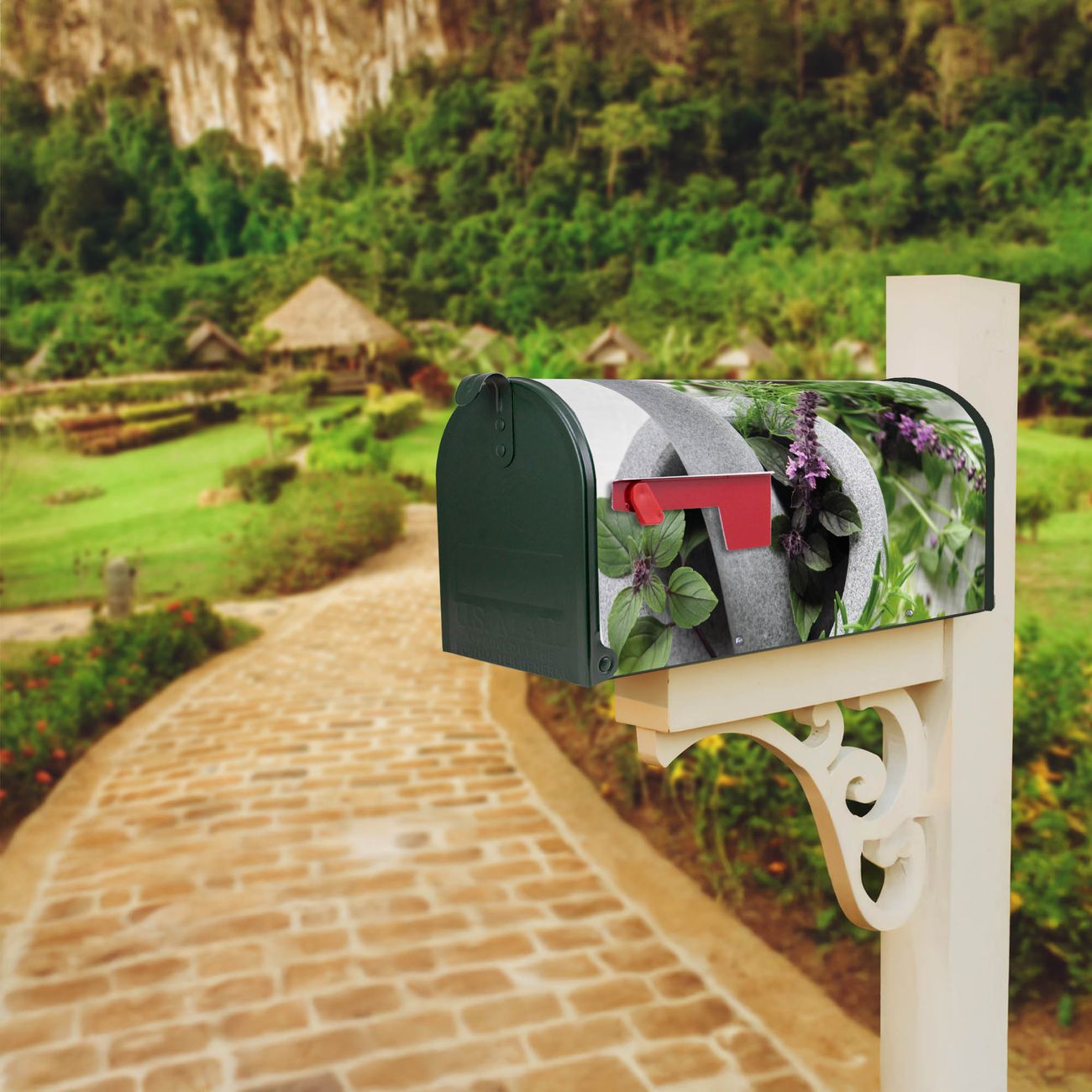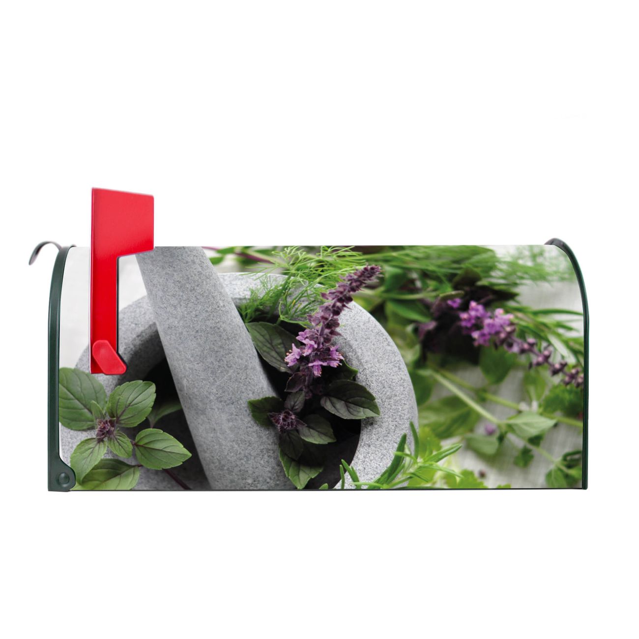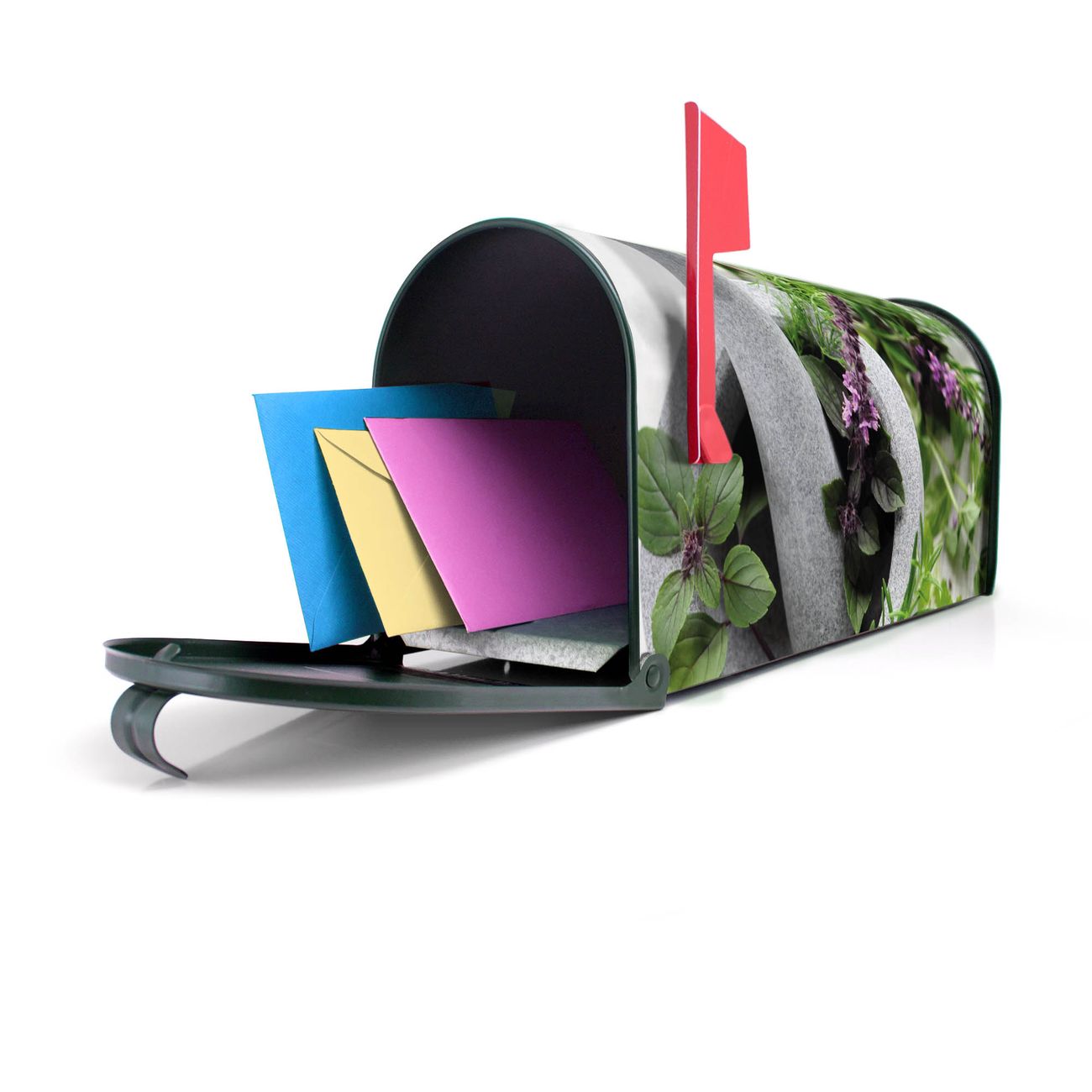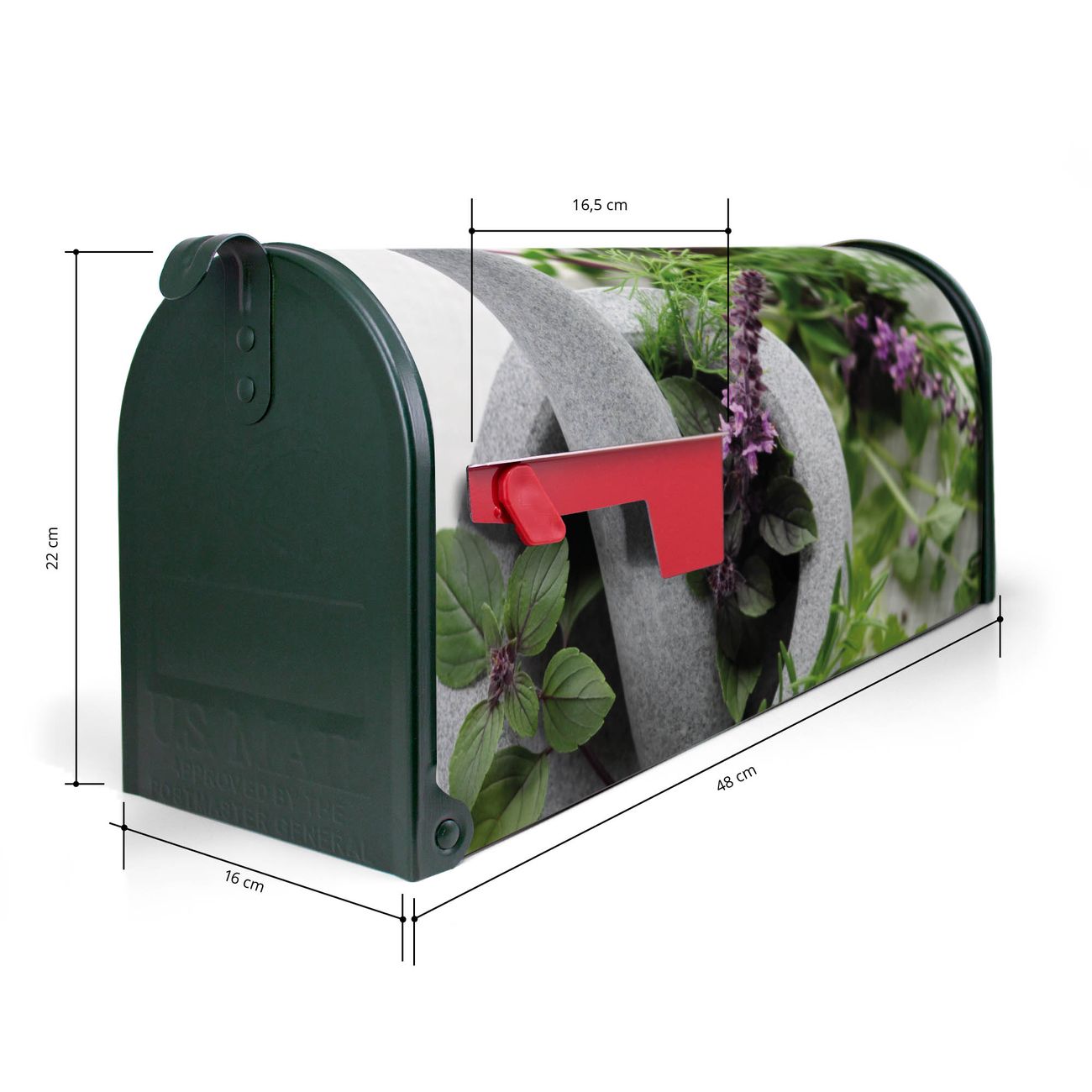Der amerikanische Briefkasten von banjado mit Kräuter Motiv bietet Ihnen ausreichend Fassungsvermögen, um große A4 Sendungen und Zeitschriften zu empfangen. Die typisch amerikanische rote Fahne zeigt Ihnen an, wenn Sie Post erhalten haben. Die US-Mailbox besteht aus verzinktem Stahlblech welches lackiert wurde und ist 48 x 22 x 16 CM (BxHxT) groß. Die Folie mit Motiv Kräuter besteht aus einer wetter- und UV-resistenten Folie, die mit einem Schutzlaminat überzogen ist, sodass die US Mailbox zusätzlich vor Kratzern geschützt ist. An der Unterkante sind 4 Löcher je Seite um die Mailbox, typisch amerikanisch, an einem Holzpfahl oder einem Zaun zu befestigen. Auf Wunsch können Sie bei uns den passenden Standfuß oder die passende Wandhalterung kaufen um die US-Mailbox sicher zu befestigen. Wir bieten Ihnen ebenfalls Namensschilder, bereits beschriftet oder frei zu beschriften, und verschiedene selbst gestaltete Bitte-Keine-Werbung-Aufkleber.