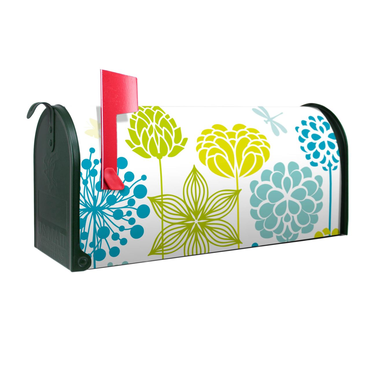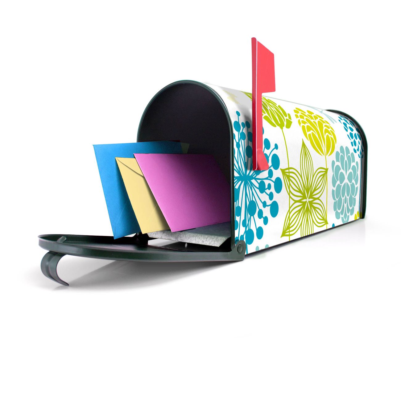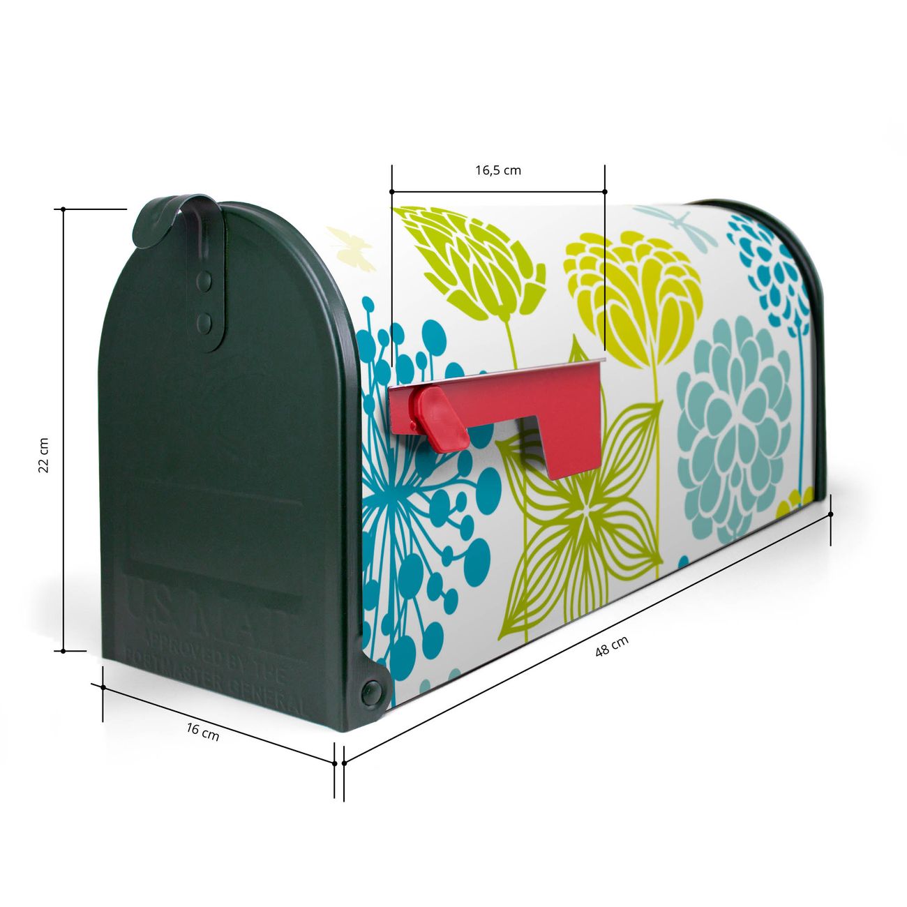 Der amerikanische Briefkasten von banjado mit Kräuterwiese Motiv bietet Ihnen ausreichend Fassungsvermögen, um große A4 Sendungen und Zeitschriften zu empfangen. Die typisch amerikanische rote Fahne zeigt Ihnen an, wenn Sie Post erhalten haben. Die US-Mailbox besteht aus verzinktem Stahlblech welches lackiert wurde und ist 48 x 22 x 16 CM (BxHxT) groß. Die Folie mit Motiv Kräuterwiese besteht aus einer wetter- und UV-resistenten Folie, die mit einem Schutzlaminat überzogen ist, sodass die US Mailbox zusätzlich vor Kratzern geschützt ist. An der Unterkante sind 4 Löcher je Seite um die Mailbox, typisch amerikanisch, an einem Holzpfahl oder einem Zaun zu befestigen. Auf Wunsch können Sie bei uns den passenden Standfuß oder die passende Wandhalterung kaufen um die US-Mailbox sicher zu befestigen. Wir bieten Ihnen ebenfalls Namensschilder, bereits beschriftet oder frei zu beschriften, und verschiedene selbst gestaltete Bitte-Keine-Werbung-Aufkleber.