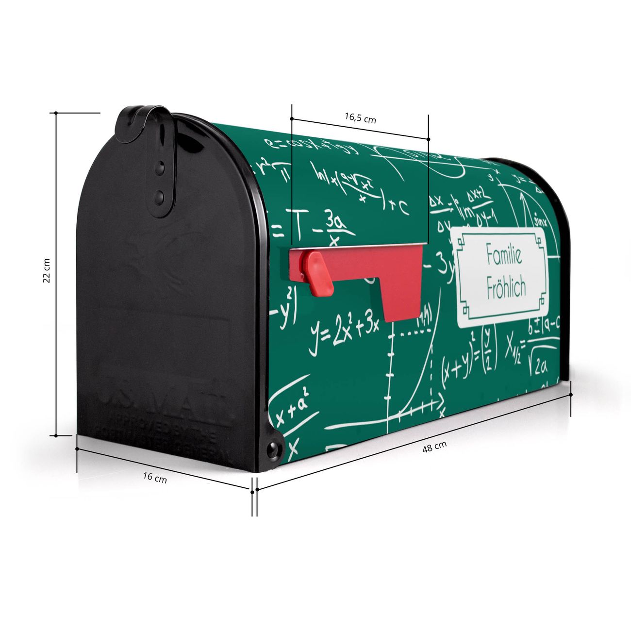 Der amerikanische Briefkasten von banjado mit Kreidetafel Motiv bietet Ihnen ausreichend Fassungsvermögen, um große A4 Sendungen und Zeitschriften zu empfangen. Die typisch amerikanische rote Fahne zeigt Ihnen an, wenn Sie Post erhalten haben. Die US-Mailbox besteht aus verzinktem Stahlblech welches lackiert wurde und ist 48 x 22 x 16 CM (BxHxT) groß. Die Folie mit Motiv Kreidetafel besteht aus einer wetter- und UV-resistenten Folie, die mit einem Schutzlaminat überzogen ist, sodass die US Mailbox zusätzlich vor Kratzern geschützt ist. An der Unterkante sind 4 Löcher je Seite um die Mailbox, typisch amerikanisch, an einem Holzpfahl oder einem Zaun zu befestigen. Auf Wunsch können Sie bei uns den passenden Standfuß oder die passende Wandhalterung kaufen um die US-Mailbox sicher zu befestigen. Wir bieten Ihnen ebenfalls Namensschilder, bereits beschriftet oder frei zu beschriften, und verschiedene selbst gestaltete Bitte-Keine-Werbung-Aufkleber.