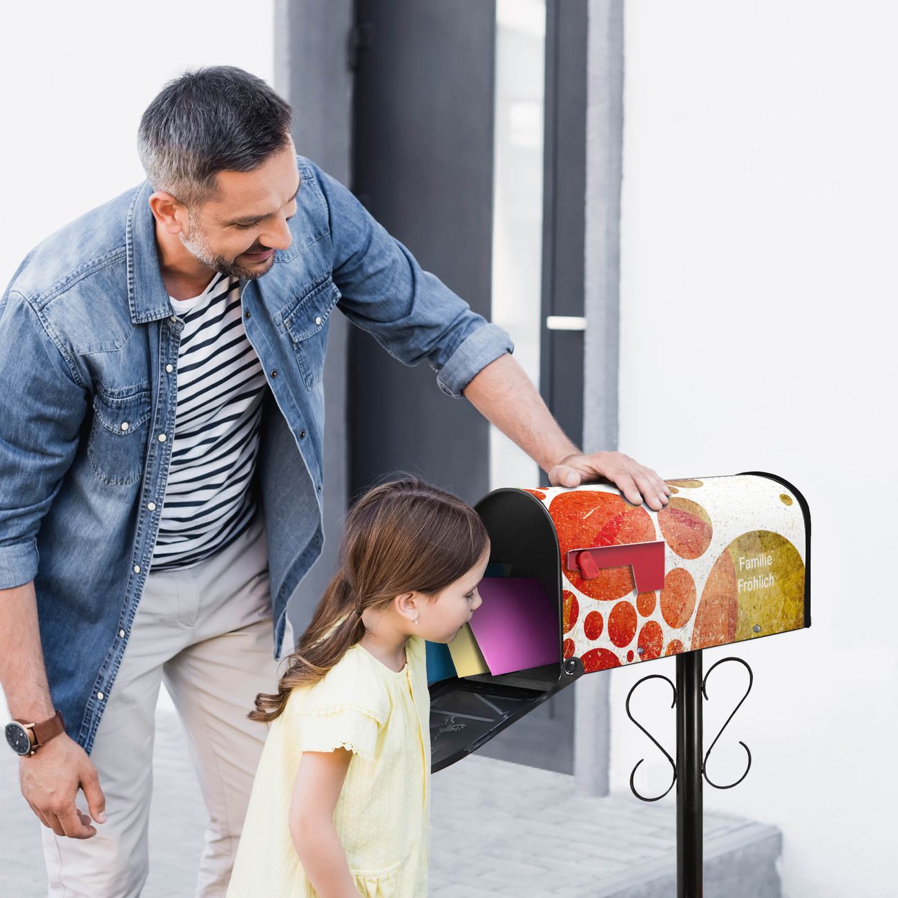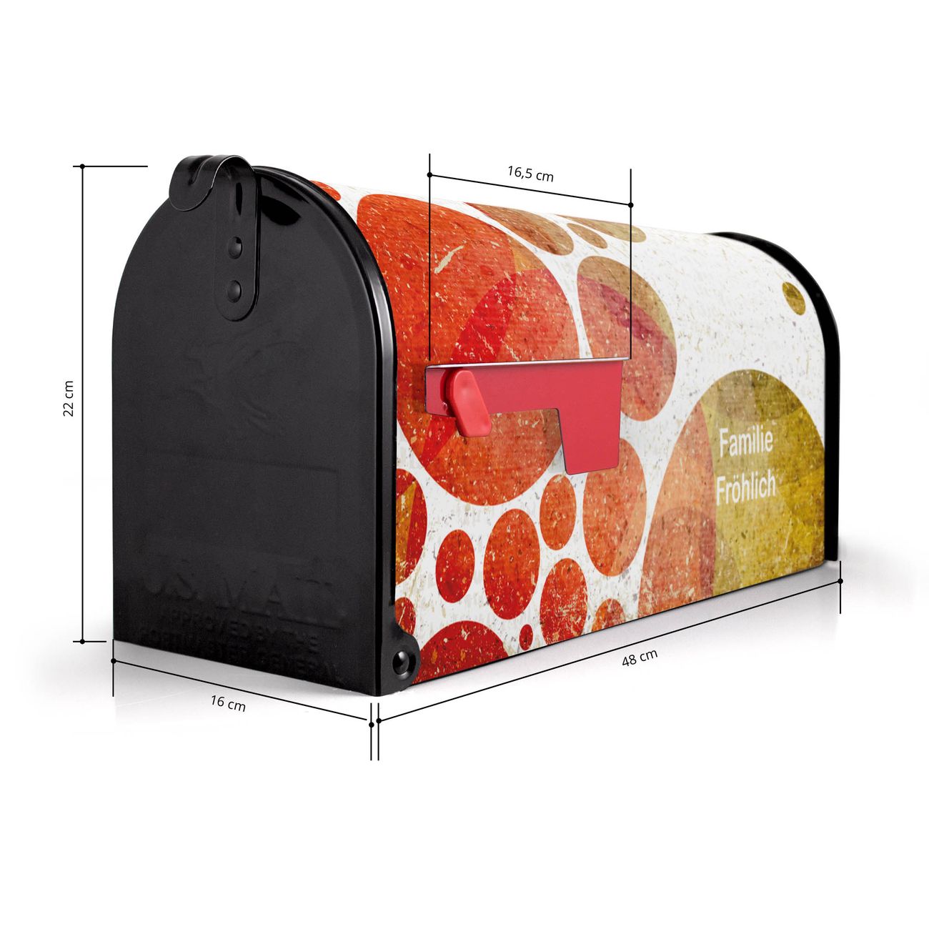 Der amerikanische Briefkasten von banjado mit Kreise Motiv bietet Ihnen ausreichend Fassungsvermögen, um große A4 Sendungen und Zeitschriften zu empfangen. Die typisch amerikanische rote Fahne zeigt Ihnen an, wenn Sie Post erhalten haben. Die US-Mailbox besteht aus verzinktem Stahlblech welches lackiert wurde und ist 48 x 22 x 16 CM (BxHxT) groß. Die Folie mit Motiv Kreise besteht aus einer wetter- und UV-resistenten Folie, die mit einem Schutzlaminat überzogen ist, sodass die US Mailbox zusätzlich vor Kratzern geschützt ist. An der Unterkante sind 4 Löcher je Seite um die Mailbox, typisch amerikanisch, an einem Holzpfahl oder einem Zaun zu befestigen. Auf Wunsch können Sie bei uns den passenden Standfuß oder die passende Wandhalterung kaufen um die US-Mailbox sicher zu befestigen. Wir bieten Ihnen ebenfalls Namensschilder, bereits beschriftet oder frei zu beschriften, und verschiedene selbst gestaltete Bitte-Keine-Werbung-Aufkleber.