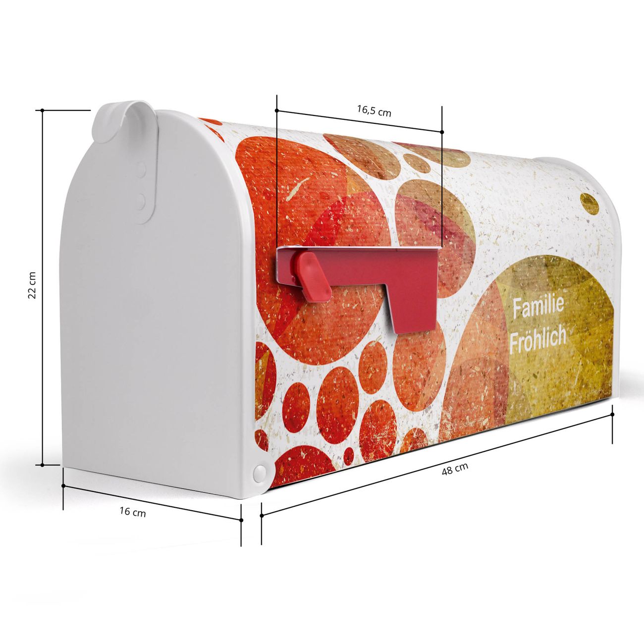 Der amerikanische Briefkasten von banjado mit WT Kreise Motiv bietet Ihnen ausreichend Fassungsvermögen, um große A4 Sendungen und Zeitschriften zu empfangen. Die typisch amerikanische rote Fahne zeigt Ihnen an, wenn Sie Post erhalten haben. Die US-Mailbox besteht aus verzinktem Stahlblech welches lackiert wurde und ist 48 x 22 x 16 CM (BxHxT) groß. Die Folie mit Motiv WT Kreise besteht aus einer wetter- und UV-resistenten Folie, die mit einem Schutzlaminat überzogen ist, sodass die US Mailbox zusätzlich vor Kratzern geschützt ist. An der Unterkante sind 4 Löcher je Seite um die Mailbox, typisch amerikanisch, an einem Holzpfahl oder einem Zaun zu befestigen. Auf Wunsch können Sie bei uns den passenden Standfuß oder die passende Wandhalterung kaufen um die US-Mailbox sicher zu befestigen. Wir bieten Ihnen ebenfalls Namensschilder, bereits beschriftet oder frei zu beschriften, und verschiedene selbst gestaltete Bitte-Keine-Werbung-Aufkleber.