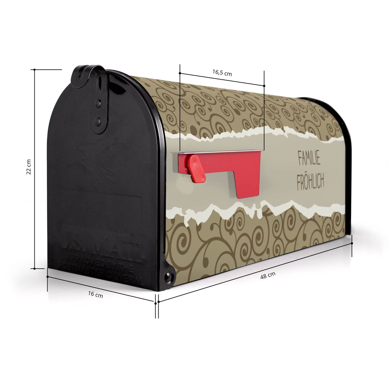 Der amerikanische Briefkasten von banjado mit Kringel Motiv bietet Ihnen ausreichend Fassungsvermögen, um große A4 Sendungen und Zeitschriften zu empfangen. Die typisch amerikanische rote Fahne zeigt Ihnen an, wenn Sie Post erhalten haben. Die US-Mailbox besteht aus verzinktem Stahlblech welches lackiert wurde und ist 48 x 22 x 16 CM (BxHxT) groß. Die Folie mit Motiv Kringel besteht aus einer wetter- und UV-resistenten Folie, die mit einem Schutzlaminat überzogen ist, sodass die US Mailbox zusätzlich vor Kratzern geschützt ist. An der Unterkante sind 4 Löcher je Seite um die Mailbox, typisch amerikanisch, an einem Holzpfahl oder einem Zaun zu befestigen. Auf Wunsch können Sie bei uns den passenden Standfuß oder die passende Wandhalterung kaufen um die US-Mailbox sicher zu befestigen. Wir bieten Ihnen ebenfalls Namensschilder, bereits beschriftet oder frei zu beschriften, und verschiedene selbst gestaltete Bitte-Keine-Werbung-Aufkleber.