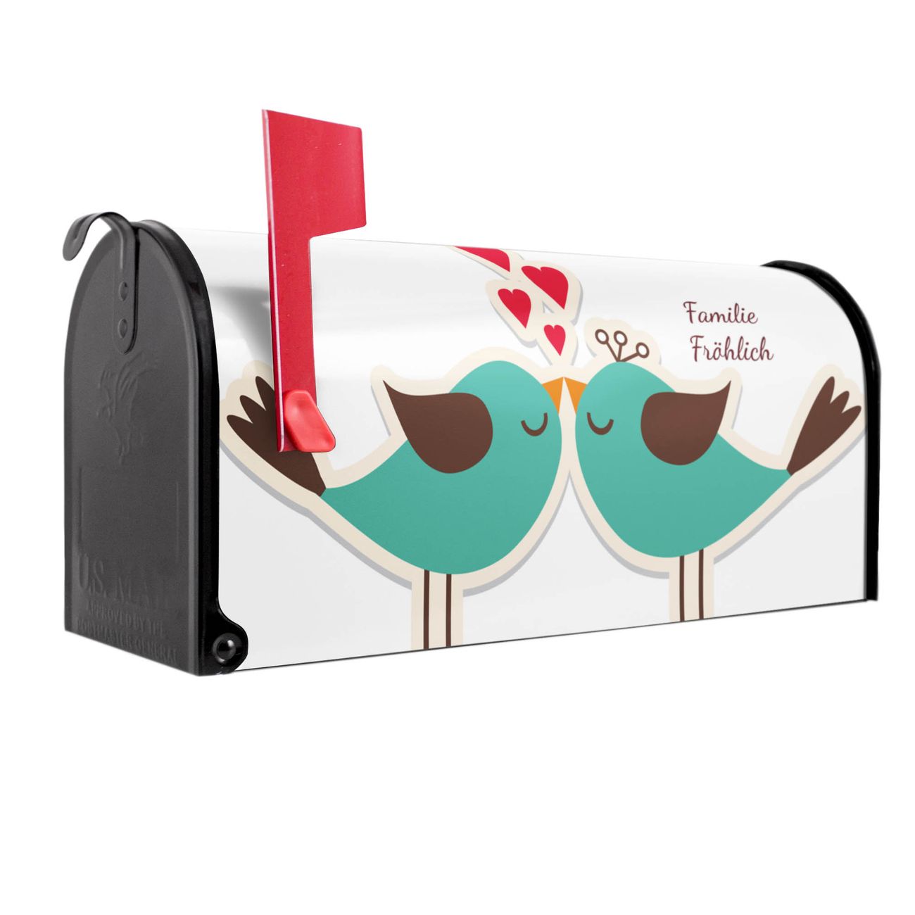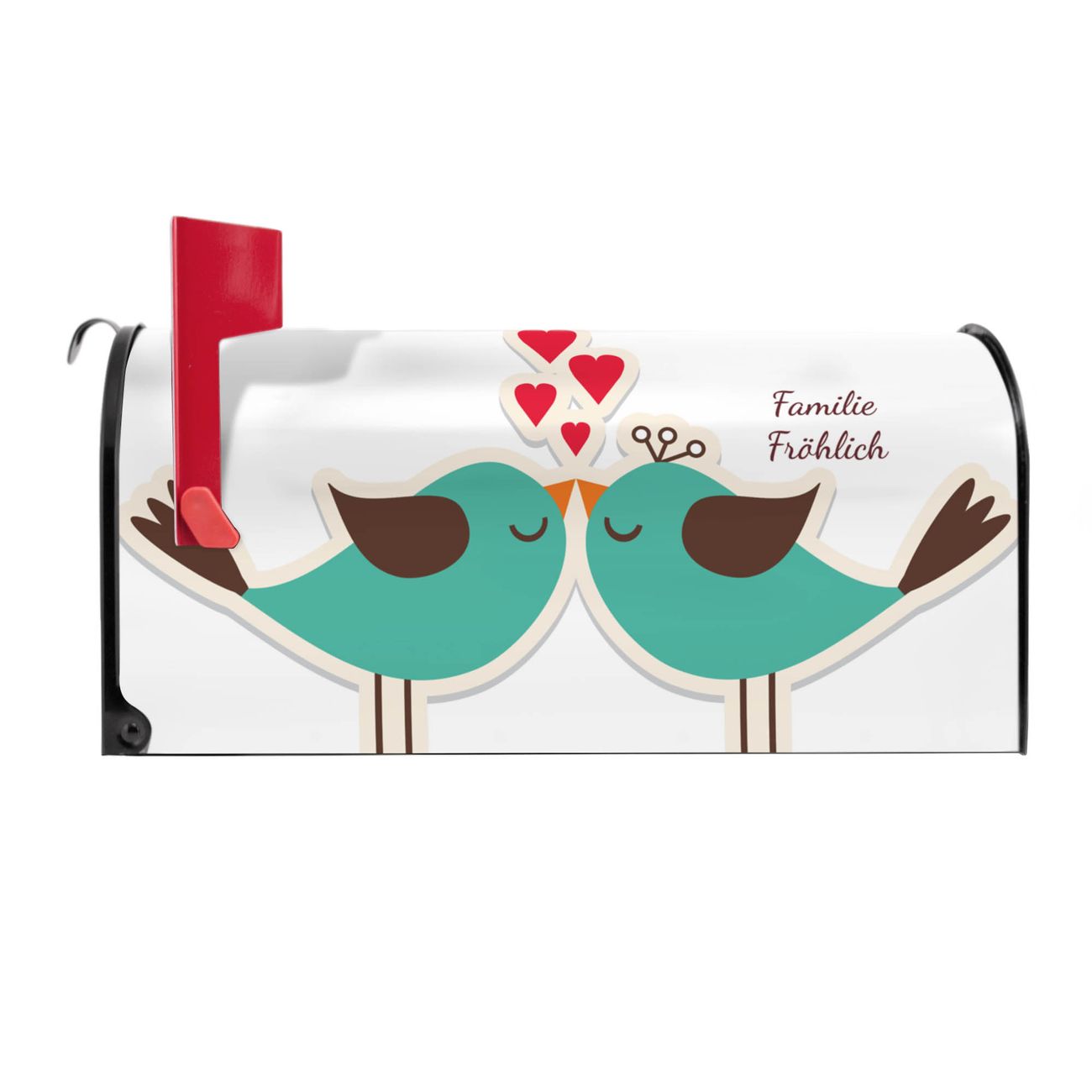 Der amerikanische Briefkasten von banjado mit Küsschen Motiv bietet Ihnen ausreichend Fassungsvermögen, um große A4 Sendungen und Zeitschriften zu empfangen. Die typisch amerikanische rote Fahne zeigt Ihnen an, wenn Sie Post erhalten haben. Die US-Mailbox besteht aus verzinktem Stahlblech welches lackiert wurde und ist 48 x 22 x 16 CM (BxHxT) groß. Die Folie mit Motiv Küsschen besteht aus einer wetter- und UV-resistenten Folie, die mit einem Schutzlaminat überzogen ist, sodass die US Mailbox zusätzlich vor Kratzern geschützt ist. An der Unterkante sind 4 Löcher je Seite um die Mailbox, typisch amerikanisch, an einem Holzpfahl oder einem Zaun zu befestigen. Auf Wunsch können Sie bei uns den passenden Standfuß oder die passende Wandhalterung kaufen um die US-Mailbox sicher zu befestigen. Wir bieten Ihnen ebenfalls Namensschilder, bereits beschriftet oder frei zu beschriften, und verschiedene selbst gestaltete Bitte-Keine-Werbung-Aufkleber.