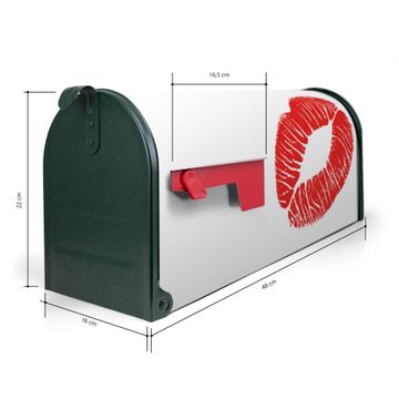 Der amerikanische Briefkasten von banjado mit Kussmund Motiv bietet Ihnen ausreichend Fassungsvermögen, um große A4 Sendungen und Zeitschriften zu empfangen. Die typisch amerikanische rote Fahne zeigt Ihnen an, wenn Sie Post erhalten haben. Die US-Mailbox besteht aus verzinktem Stahlblech welches lackiert wurde und ist 48 x 22 x 16 CM (BxHxT) groß. Die Folie mit Motiv Kussmund besteht aus einer wetter- und UV-resistenten Folie, die mit einem Schutzlaminat überzogen ist, sodass die US Mailbox zusätzlich vor Kratzern geschützt ist. An der Unterkante sind 4 Löcher je Seite um die Mailbox, typisch amerikanisch, an einem Holzpfahl oder einem Zaun zu befestigen. Auf Wunsch können Sie bei uns den passenden Standfuß oder die passende Wandhalterung kaufen um die US-Mailbox sicher zu befestigen. Wir bieten Ihnen ebenfalls Namensschilder, bereits beschriftet oder frei zu beschriften, und verschiedene selbst gestaltete Bitte-Keine-Werbung-Aufkleber.