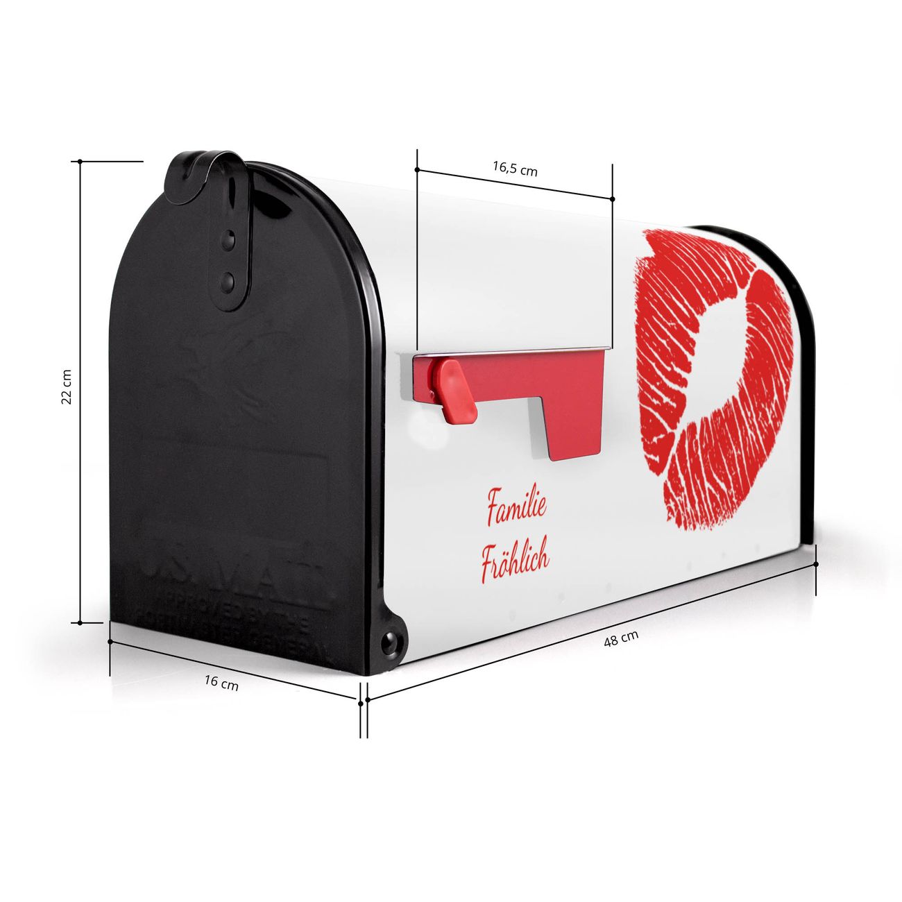 Der amerikanische Briefkasten von banjado mit Kussmund Motiv bietet Ihnen ausreichend Fassungsvermögen, um große A4 Sendungen und Zeitschriften zu empfangen. Die typisch amerikanische rote Fahne zeigt Ihnen an, wenn Sie Post erhalten haben. Die US-Mailbox besteht aus verzinktem Stahlblech welches lackiert wurde und ist 48 x 22 x 16 CM (BxHxT) groß. Die Folie mit Motiv Kussmund besteht aus einer wetter- und UV-resistenten Folie, die mit einem Schutzlaminat überzogen ist, sodass die US Mailbox zusätzlich vor Kratzern geschützt ist. An der Unterkante sind 4 Löcher je Seite um die Mailbox, typisch amerikanisch, an einem Holzpfahl oder einem Zaun zu befestigen. Auf Wunsch können Sie bei uns den passenden Standfuß oder die passende Wandhalterung kaufen um die US-Mailbox sicher zu befestigen. Wir bieten Ihnen ebenfalls Namensschilder, bereits beschriftet oder frei zu beschriften, und verschiedene selbst gestaltete Bitte-Keine-Werbung-Aufkleber.