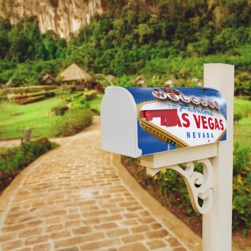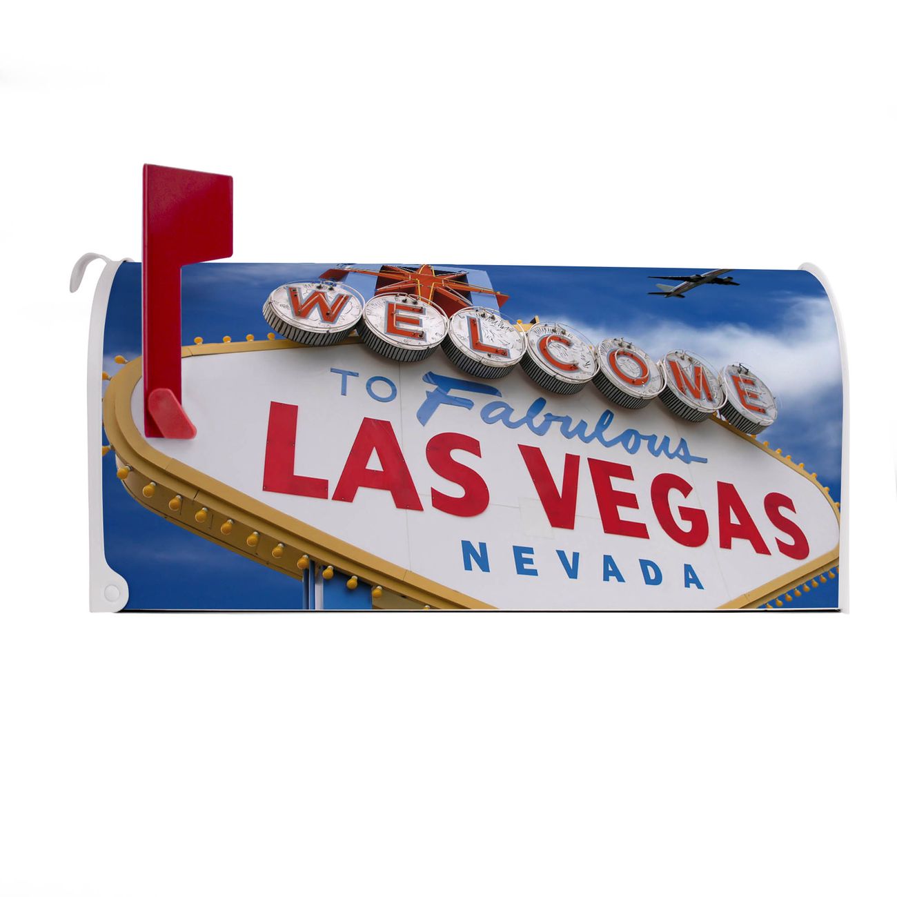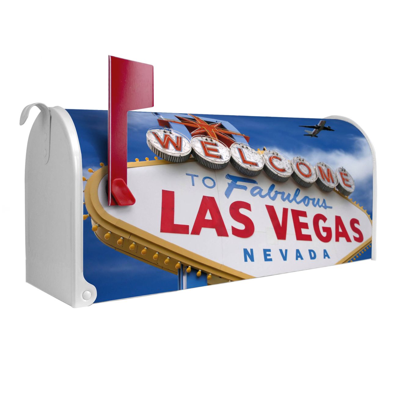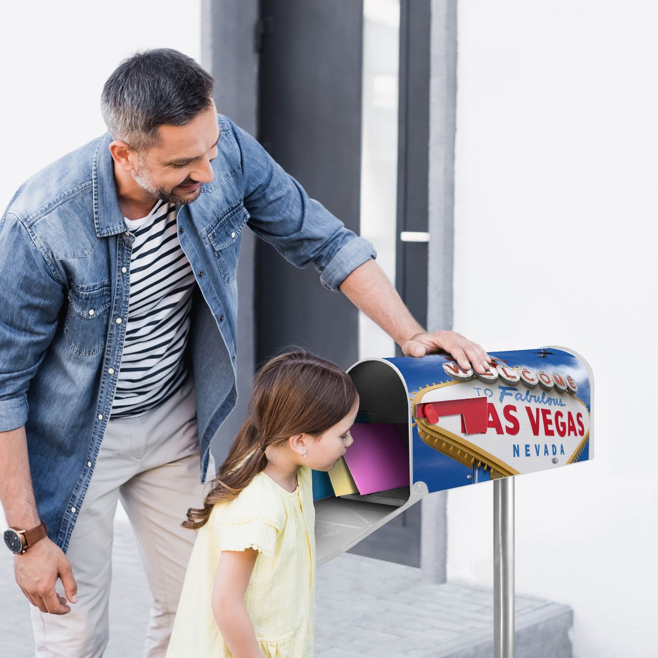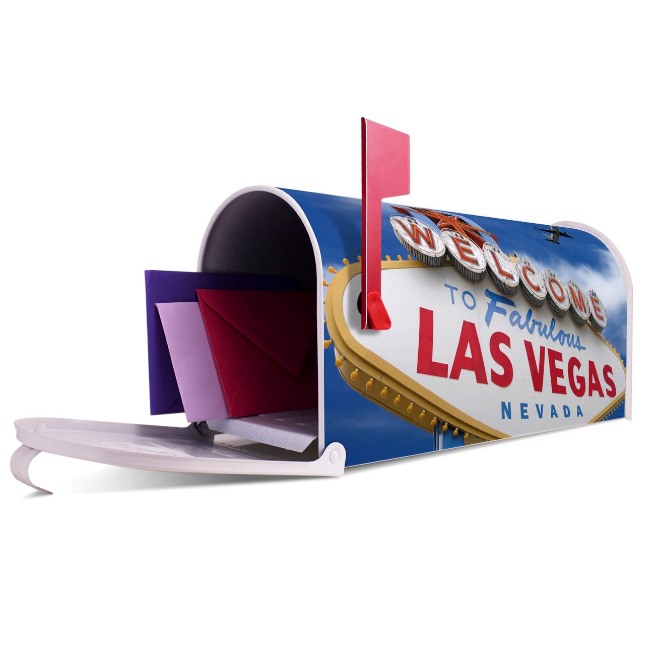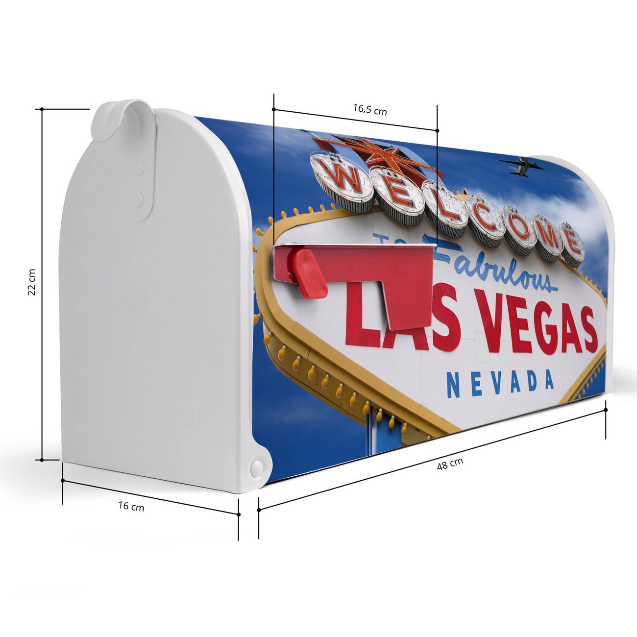 Der amerikanische Briefkasten von banjado mit Las Vegas Motiv bietet Ihnen ausreichend Fassungsvermögen, um große A4 Sendungen und Zeitschriften zu empfangen. Die typisch amerikanische rote Fahne zeigt Ihnen an, wenn Sie Post erhalten haben. Die US-Mailbox besteht aus verzinktem Stahlblech welches lackiert wurde und ist 48 x 22 x 16 CM (BxHxT) groß. Die Folie mit Motiv Las Vegas besteht aus einer wetter- und UV-resistenten Folie, die mit einem Schutzlaminat überzogen ist, sodass die US Mailbox zusätzlich vor Kratzern geschützt ist. An der Unterkante sind 4 Löcher je Seite um die Mailbox, typisch amerikanisch, an einem Holzpfahl oder einem Zaun zu befestigen. Auf Wunsch können Sie bei uns den passenden Standfuß oder die passende Wandhalterung kaufen um die US-Mailbox sicher zu befestigen. Wir bieten Ihnen ebenfalls Namensschilder, bereits beschriftet oder frei zu beschriften, und verschiedene selbst gestaltete Bitte-Keine-Werbung-Aufkleber.