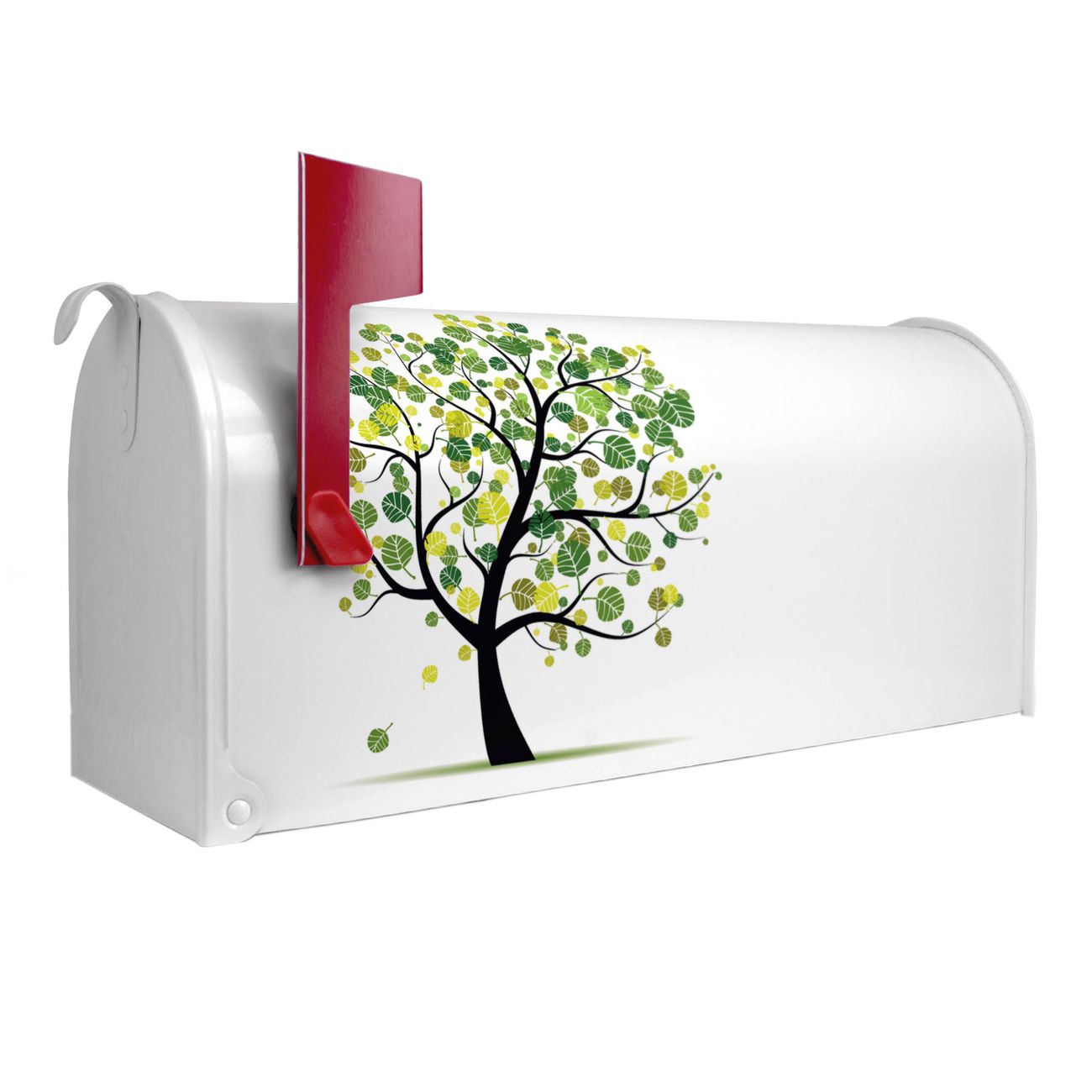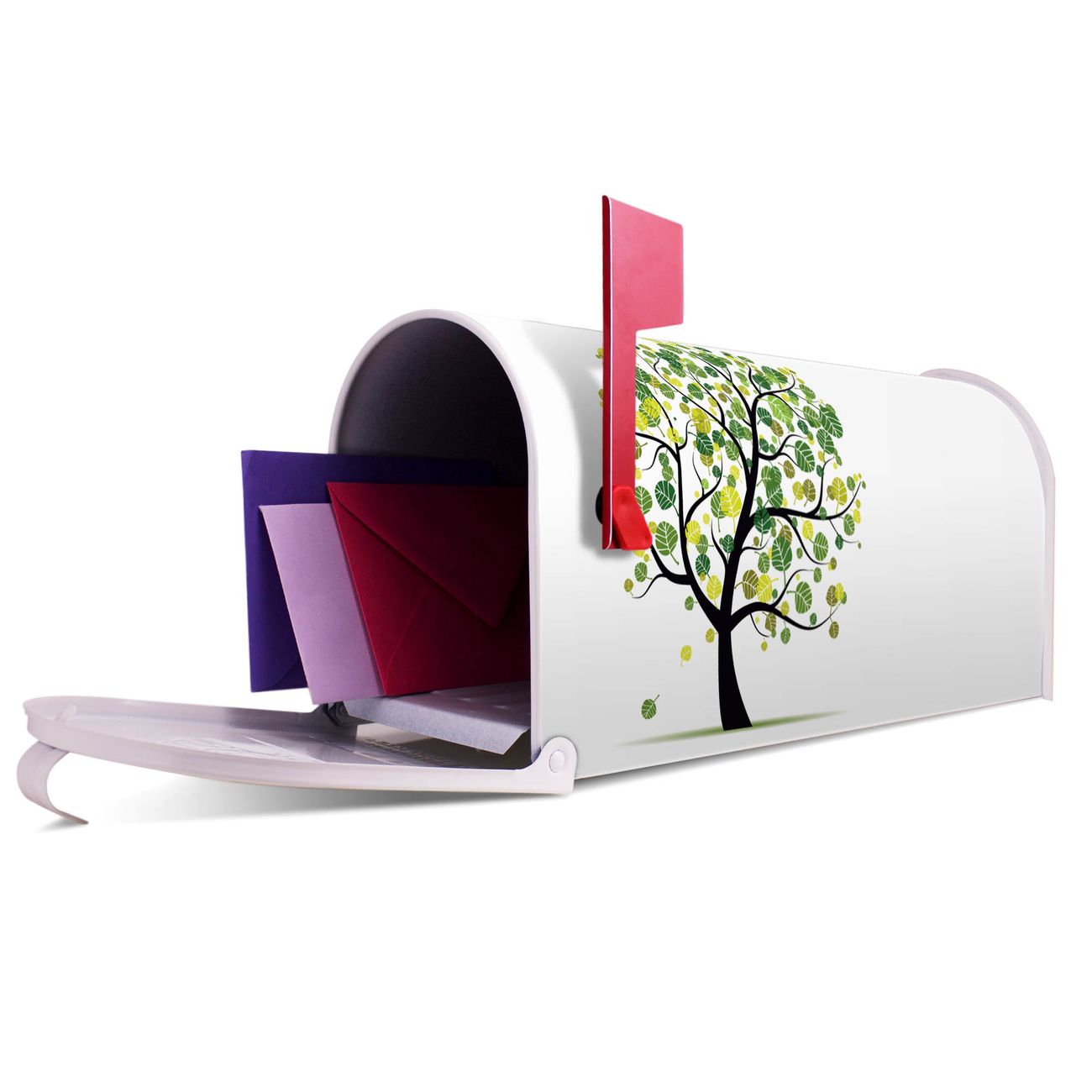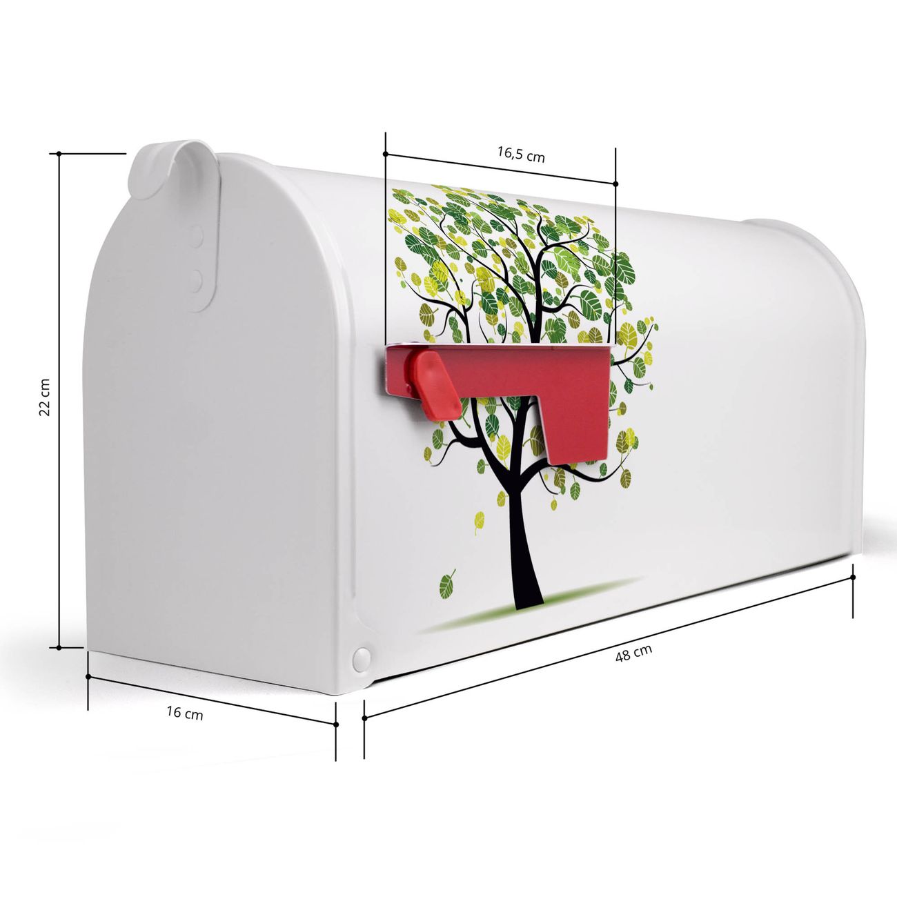 Der amerikanische Briefkasten von banjado mit Laubzauberbaum Motiv bietet Ihnen ausreichend Fassungsvermögen, um große A4 Sendungen und Zeitschriften zu empfangen. Die typisch amerikanische rote Fahne zeigt Ihnen an, wenn Sie Post erhalten haben. Die US-Mailbox besteht aus verzinktem Stahlblech welches lackiert wurde und ist 48 x 22 x 16 CM (BxHxT) groß. Die Folie mit Motiv Laubzauberbaum besteht aus einer wetter- und UV-resistenten Folie, die mit einem Schutzlaminat überzogen ist, sodass die US Mailbox zusätzlich vor Kratzern geschützt ist. An der Unterkante sind 4 Löcher je Seite um die Mailbox, typisch amerikanisch, an einem Holzpfahl oder einem Zaun zu befestigen. Auf Wunsch können Sie bei uns den passenden Standfuß oder die passende Wandhalterung kaufen um die US-Mailbox sicher zu befestigen. Wir bieten Ihnen ebenfalls Namensschilder, bereits beschriftet oder frei zu beschriften, und verschiedene selbst gestaltete Bitte-Keine-Werbung-Aufkleber.