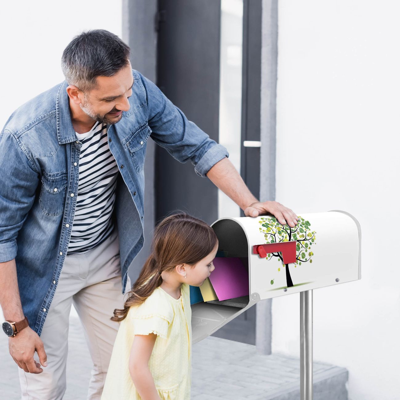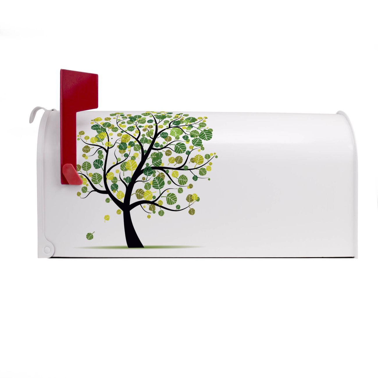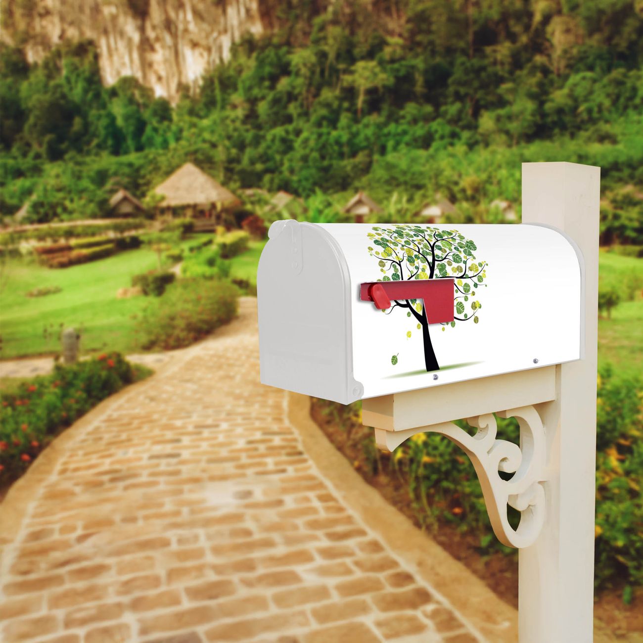 Der amerikanische Briefkasten von banjado mit Laubzauberbaum Motiv bietet Ihnen ausreichend Fassungsvermögen, um große A4 Sendungen und Zeitschriften zu empfangen. Die typisch amerikanische rote Fahne zeigt Ihnen an, wenn Sie Post erhalten haben. Die US-Mailbox besteht aus verzinktem Stahlblech welches lackiert wurde und ist 48 x 22 x 16 CM (BxHxT) groß. Die Folie mit Motiv Laubzauberbaum besteht aus einer wetter- und UV-resistenten Folie, die mit einem Schutzlaminat überzogen ist, sodass die US Mailbox zusätzlich vor Kratzern geschützt ist. An der Unterkante sind 4 Löcher je Seite um die Mailbox, typisch amerikanisch, an einem Holzpfahl oder einem Zaun zu befestigen. Auf Wunsch können Sie bei uns den passenden Standfuß oder die passende Wandhalterung kaufen um die US-Mailbox sicher zu befestigen. Wir bieten Ihnen ebenfalls Namensschilder, bereits beschriftet oder frei zu beschriften, und verschiedene selbst gestaltete Bitte-Keine-Werbung-Aufkleber.