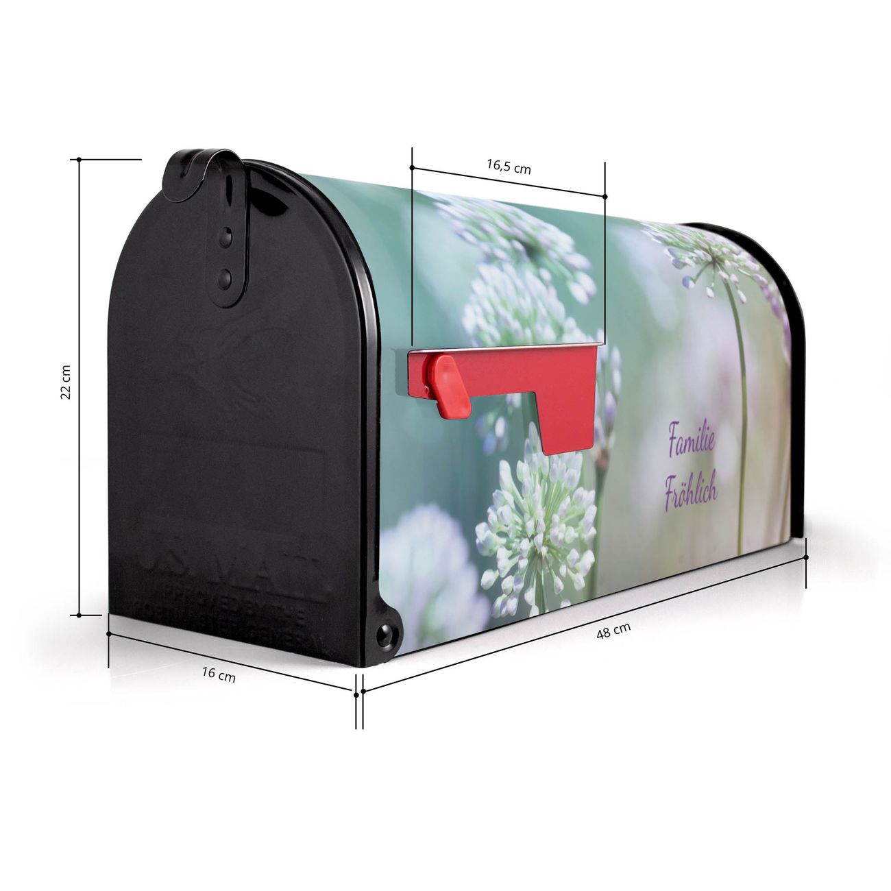 Der amerikanische Briefkasten von banjado mit Lauchblüte Motiv bietet Ihnen ausreichend Fassungsvermögen, um große A4 Sendungen und Zeitschriften zu empfangen. Die typisch amerikanische rote Fahne zeigt Ihnen an, wenn Sie Post erhalten haben. Die US-Mailbox besteht aus verzinktem Stahlblech welches lackiert wurde und ist 48 x 22 x 16 CM (BxHxT) groß. Die Folie mit Motiv Lauchblüte besteht aus einer wetter- und UV-resistenten Folie, die mit einem Schutzlaminat überzogen ist, sodass die US Mailbox zusätzlich vor Kratzern geschützt ist. An der Unterkante sind 4 Löcher je Seite um die Mailbox, typisch amerikanisch, an einem Holzpfahl oder einem Zaun zu befestigen. Auf Wunsch können Sie bei uns den passenden Standfuß oder die passende Wandhalterung kaufen um die US-Mailbox sicher zu befestigen. Wir bieten Ihnen ebenfalls Namensschilder, bereits beschriftet oder frei zu beschriften, und verschiedene selbst gestaltete Bitte-Keine-Werbung-Aufkleber.