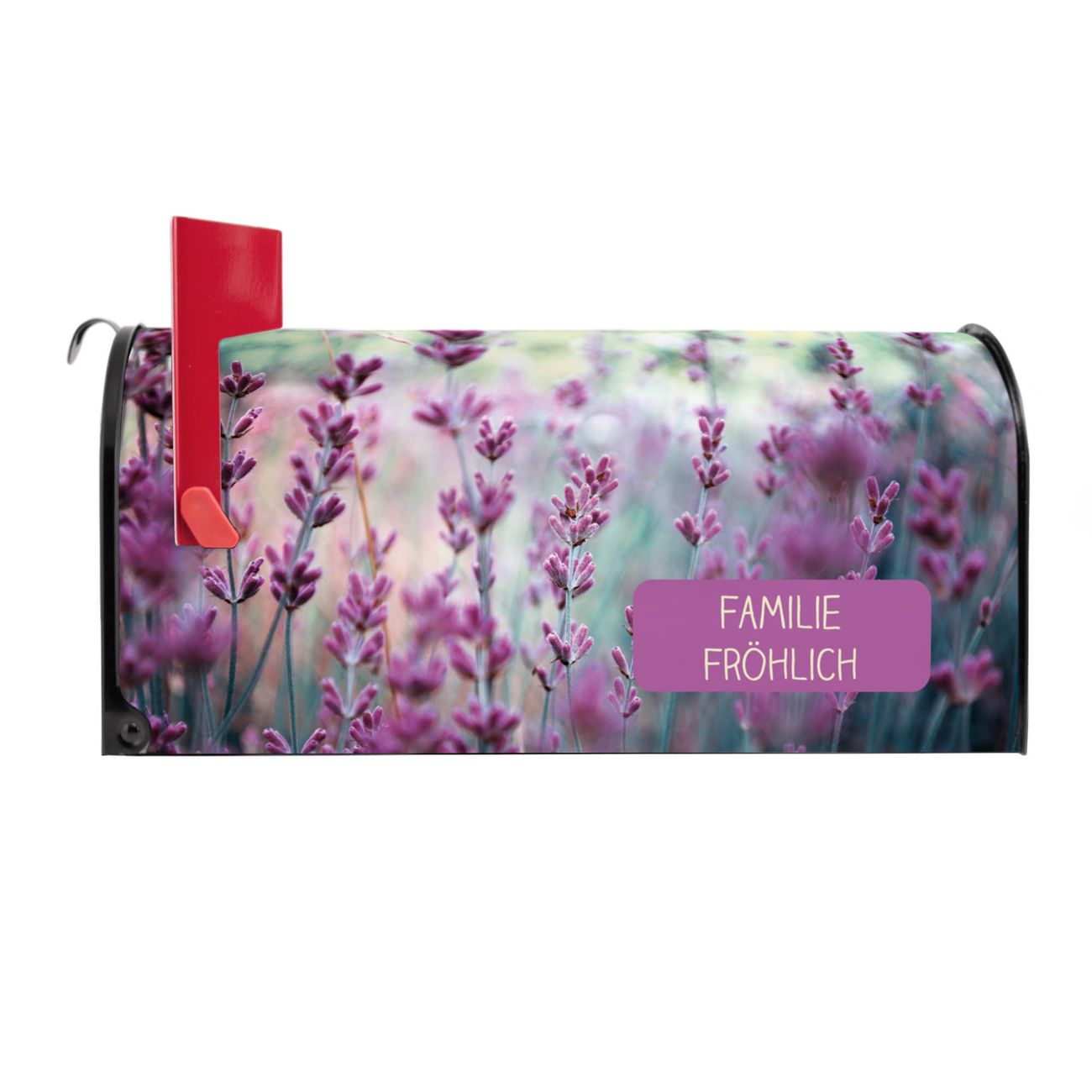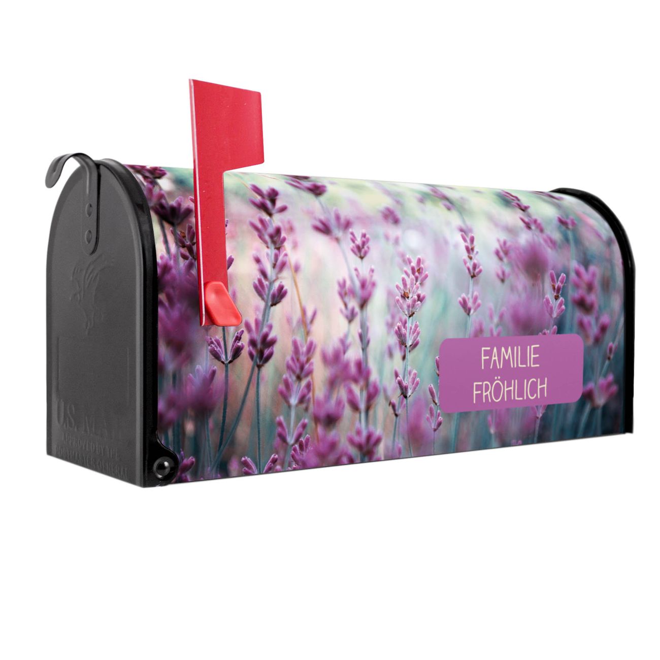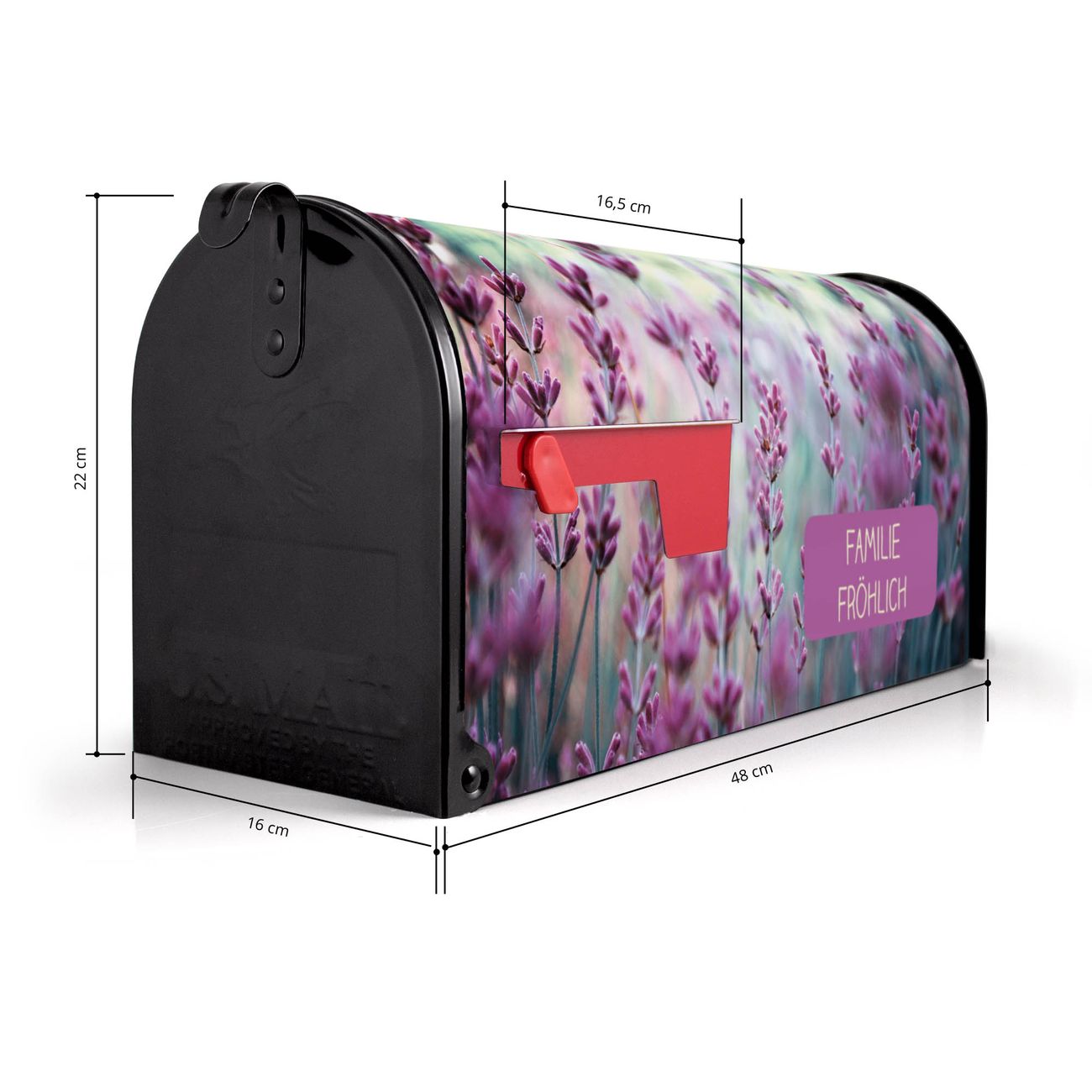 Der amerikanische Briefkasten von banjado mit Lavendel 2 Motiv bietet Ihnen ausreichend Fassungsvermögen, um große A4 Sendungen und Zeitschriften zu empfangen. Die typisch amerikanische rote Fahne zeigt Ihnen an, wenn Sie Post erhalten haben. Die US-Mailbox besteht aus verzinktem Stahlblech welches lackiert wurde und ist 48 x 22 x 16 CM (BxHxT) groß. Die Folie mit Motiv Lavendel 2 besteht aus einer wetter- und UV-resistenten Folie, die mit einem Schutzlaminat überzogen ist, sodass die US Mailbox zusätzlich vor Kratzern geschützt ist. An der Unterkante sind 4 Löcher je Seite um die Mailbox, typisch amerikanisch, an einem Holzpfahl oder einem Zaun zu befestigen. Auf Wunsch können Sie bei uns den passenden Standfuß oder die passende Wandhalterung kaufen um die US-Mailbox sicher zu befestigen. Wir bieten Ihnen ebenfalls Namensschilder, bereits beschriftet oder frei zu beschriften, und verschiedene selbst gestaltete Bitte-Keine-Werbung-Aufkleber.