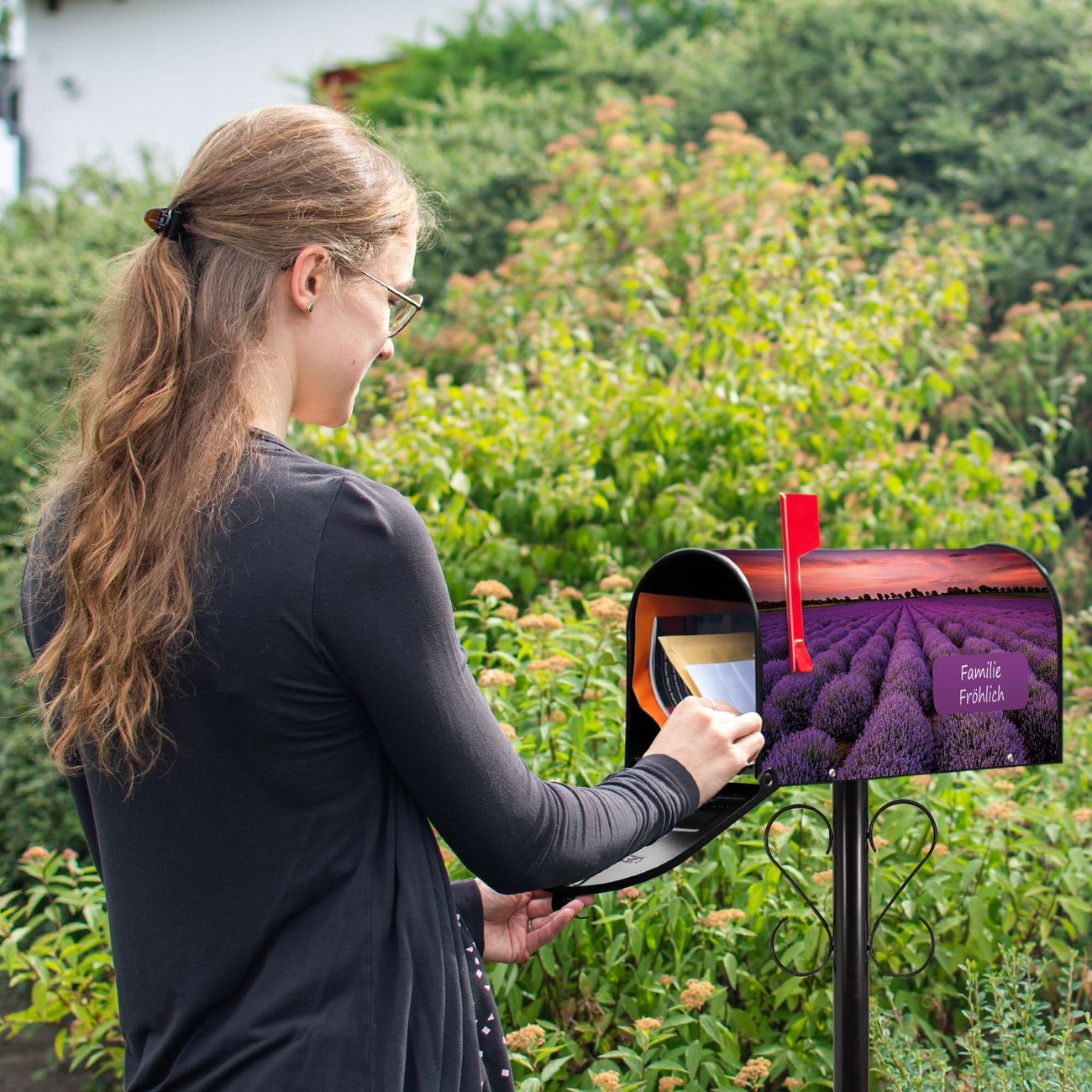 Unser amerikanischer Briefkasten mit dem Motiv Lavendelfeld hat ein sehr ansprechendes und ausgefallenes Design, ist in der Grundfarbe weiß, grün oder schwarz erhältlich. Damit entlocken Sie Ihren Nachbarn und dem Postboten immer wieder ein Lächeln. Die Mailbox ist ein Original Import aus Mississippi USA und wird von unserer kleinen Manufaktur in Sachsen von Hand veredelt. Die US-Mailbox bietet ausreichend Platz auch für große Sendungen, eine Fahne die Ihnen Post anzeigt, wetterfestes und äußerst stabiles Material - so macht Post empfangen Freude.