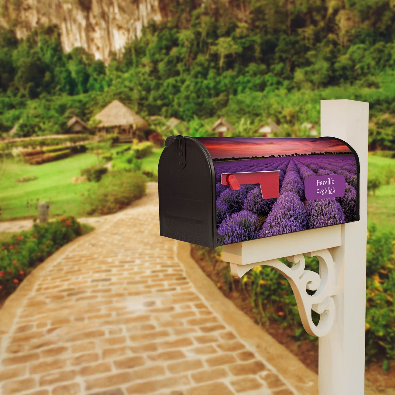 Der amerikanische Briefkasten von banjado mit Lavendelfeld Motiv bietet Ihnen ausreichend Fassungsvermögen, um große A4 Sendungen und Zeitschriften zu empfangen. Die typisch amerikanische rote Fahne zeigt Ihnen an, wenn Sie Post erhalten haben. Die US-Mailbox besteht aus verzinktem Stahlblech welches lackiert wurde und ist 48 x 22 x 16 CM (BxHxT) groß. Die Folie mit Motiv Lavendelfeld besteht aus einer wetter- und UV-resistenten Folie, die mit einem Schutzlaminat überzogen ist, sodass die US Mailbox zusätzlich vor Kratzern geschützt ist. An der Unterkante sind 4 Löcher je Seite um die Mailbox, typisch amerikanisch, an einem Holzpfahl oder einem Zaun zu befestigen. Auf Wunsch können Sie bei uns den passenden Standfuß oder die passende Wandhalterung kaufen um die US-Mailbox sicher zu befestigen. Wir bieten Ihnen ebenfalls Namensschilder, bereits beschriftet oder frei zu beschriften, und verschiedene selbst gestaltete Bitte-Keine-Werbung-Aufkleber.