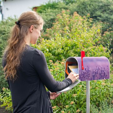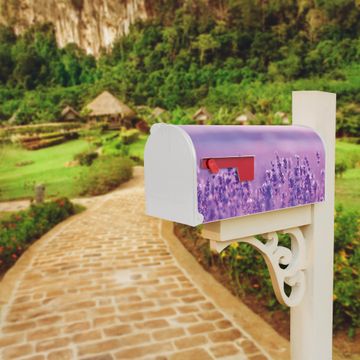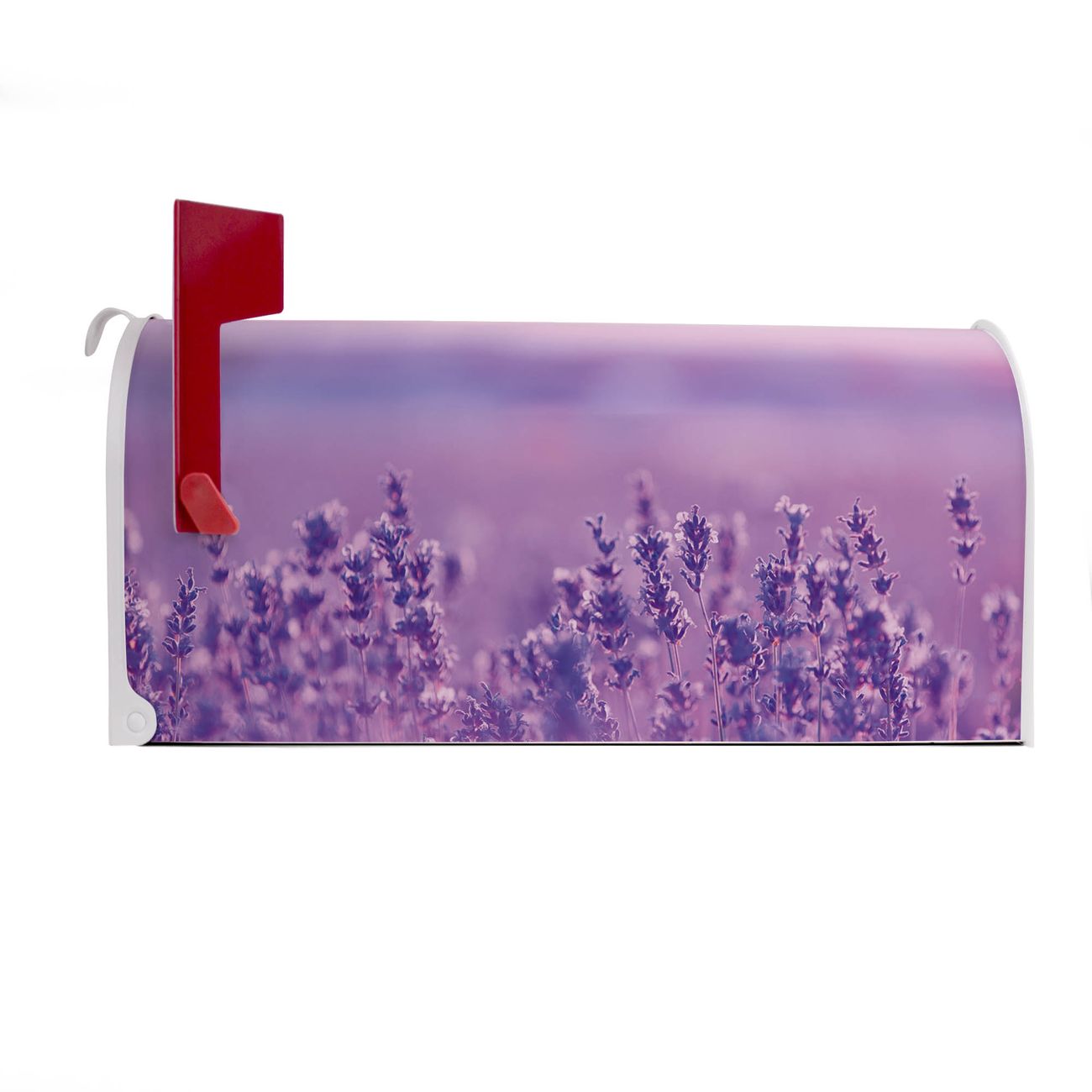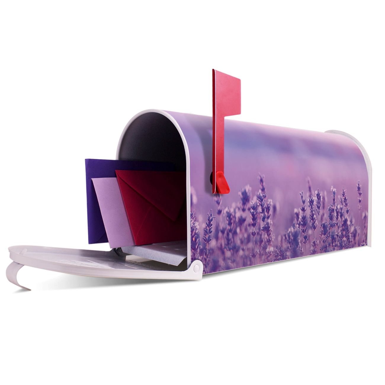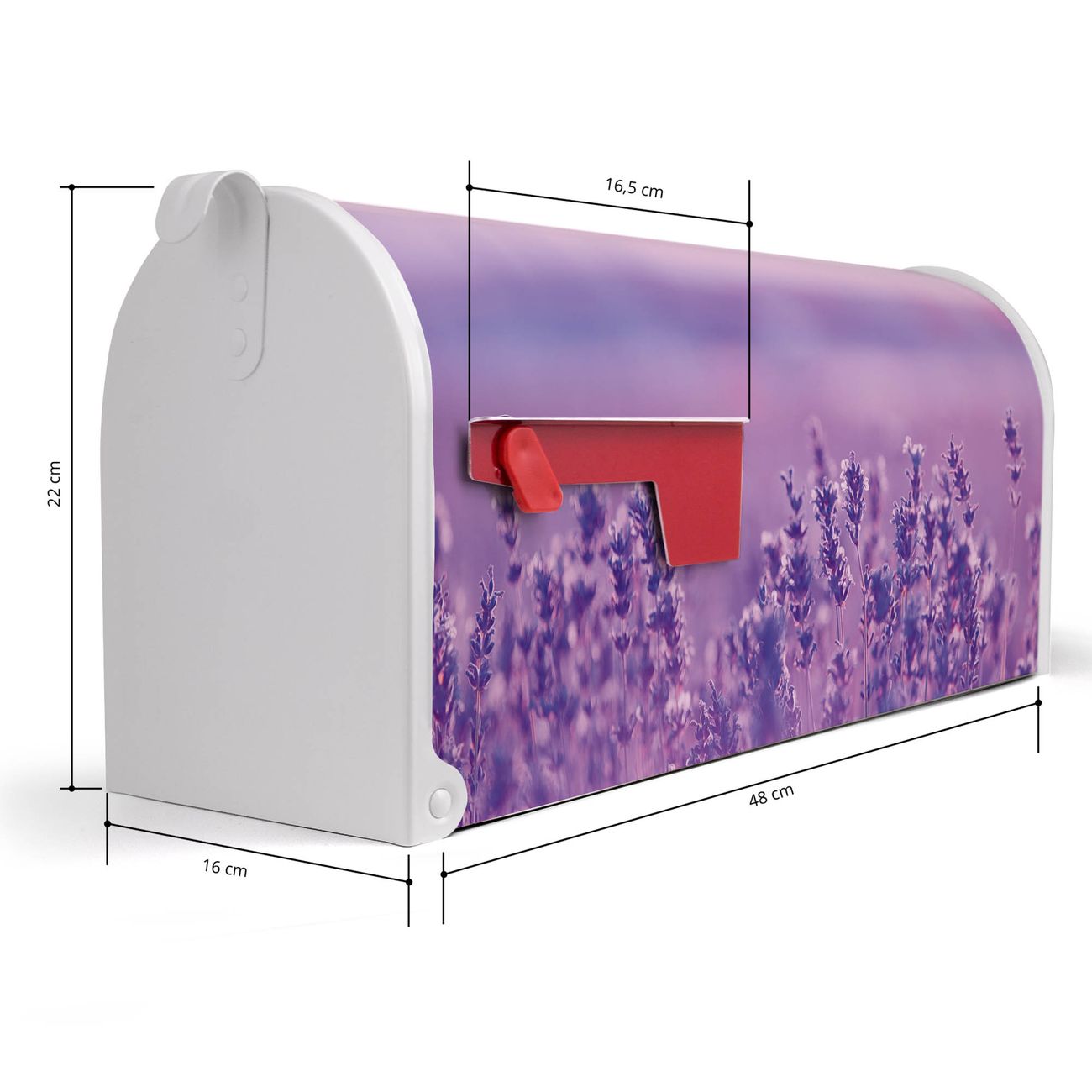 Der amerikanische Briefkasten von banjado mit Lavendelmeer Motiv bietet Ihnen ausreichend Fassungsvermögen, um große A4 Sendungen und Zeitschriften zu empfangen. Die typisch amerikanische rote Fahne zeigt Ihnen an, wenn Sie Post erhalten haben. Die US-Mailbox besteht aus verzinktem Stahlblech welches lackiert wurde und ist 48 x 22 x 16 CM (BxHxT) groß. Die Folie mit Motiv Lavendelmeer besteht aus einer wetter- und UV-resistenten Folie, die mit einem Schutzlaminat überzogen ist, sodass die US Mailbox zusätzlich vor Kratzern geschützt ist. An der Unterkante sind 4 Löcher je Seite um die Mailbox, typisch amerikanisch, an einem Holzpfahl oder einem Zaun zu befestigen. Auf Wunsch können Sie bei uns den passenden Standfuß oder die passende Wandhalterung kaufen um die US-Mailbox sicher zu befestigen. Wir bieten Ihnen ebenfalls Namensschilder, bereits beschriftet oder frei zu beschriften, und verschiedene selbst gestaltete Bitte-Keine-Werbung-Aufkleber.