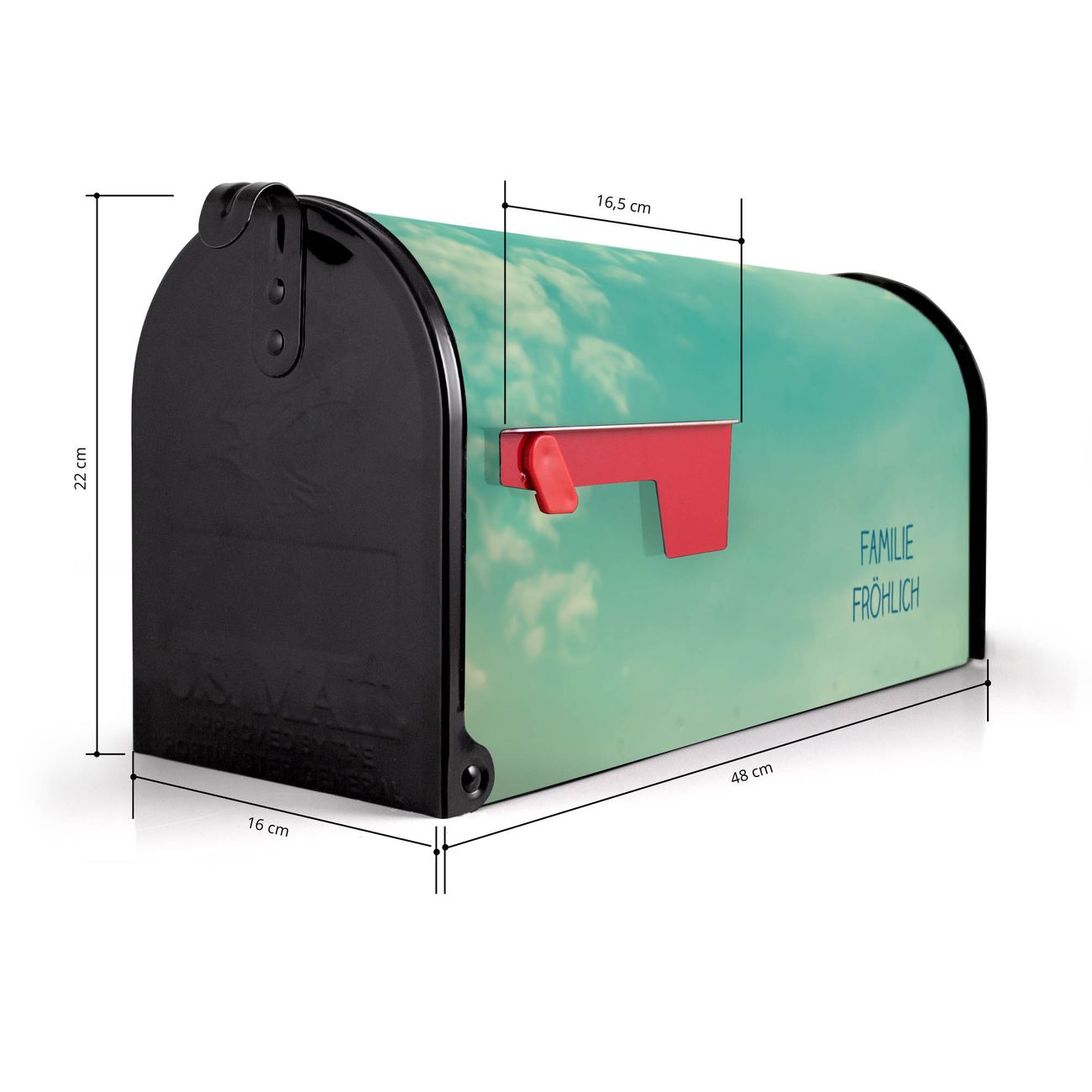 Der amerikanische Briefkasten von banjado mit Leicht Bewölkt Motiv bietet Ihnen ausreichend Fassungsvermögen, um große A4 Sendungen und Zeitschriften zu empfangen. Die typisch amerikanische rote Fahne zeigt Ihnen an, wenn Sie Post erhalten haben. Die US-Mailbox besteht aus verzinktem Stahlblech welches lackiert wurde und ist 48 x 22 x 16 CM (BxHxT) groß. Die Folie mit Motiv Leicht Bewölkt besteht aus einer wetter- und UV-resistenten Folie, die mit einem Schutzlaminat überzogen ist, sodass die US Mailbox zusätzlich vor Kratzern geschützt ist. An der Unterkante sind 4 Löcher je Seite um die Mailbox, typisch amerikanisch, an einem Holzpfahl oder einem Zaun zu befestigen. Auf Wunsch können Sie bei uns den passenden Standfuß oder die passende Wandhalterung kaufen um die US-Mailbox sicher zu befestigen. Wir bieten Ihnen ebenfalls Namensschilder, bereits beschriftet oder frei zu beschriften, und verschiedene selbst gestaltete Bitte-Keine-Werbung-Aufkleber.