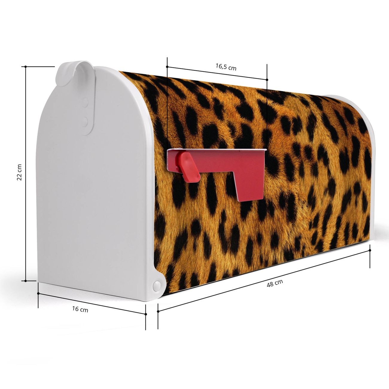 Der amerikanische Briefkasten von banjado mit Leopard Motiv bietet Ihnen ausreichend Fassungsvermögen, um große A4 Sendungen und Zeitschriften zu empfangen. Die typisch amerikanische rote Fahne zeigt Ihnen an, wenn Sie Post erhalten haben. Die US-Mailbox besteht aus verzinktem Stahlblech welches lackiert wurde und ist 48 x 22 x 16 CM (BxHxT) groß. Die Folie mit Motiv Leopard besteht aus einer wetter- und UV-resistenten Folie, die mit einem Schutzlaminat überzogen ist, sodass die US Mailbox zusätzlich vor Kratzern geschützt ist. An der Unterkante sind 4 Löcher je Seite um die Mailbox, typisch amerikanisch, an einem Holzpfahl oder einem Zaun zu befestigen. Auf Wunsch können Sie bei uns den passenden Standfuß oder die passende Wandhalterung kaufen um die US-Mailbox sicher zu befestigen. Wir bieten Ihnen ebenfalls Namensschilder, bereits beschriftet oder frei zu beschriften, und verschiedene selbst gestaltete Bitte-Keine-Werbung-Aufkleber.