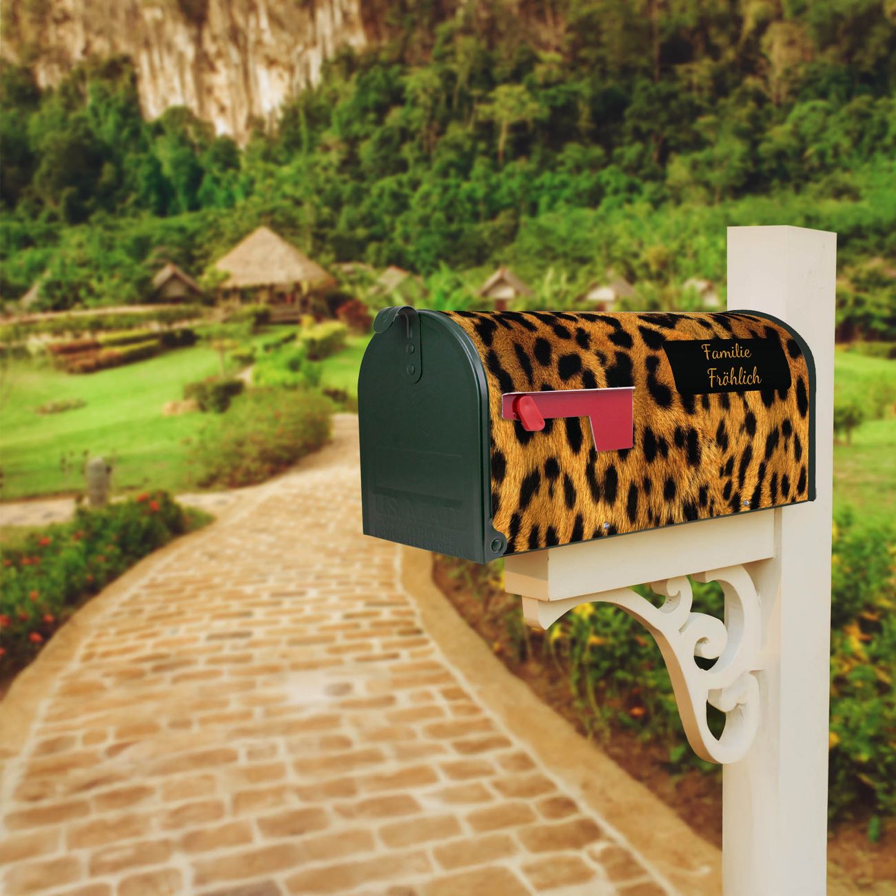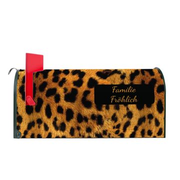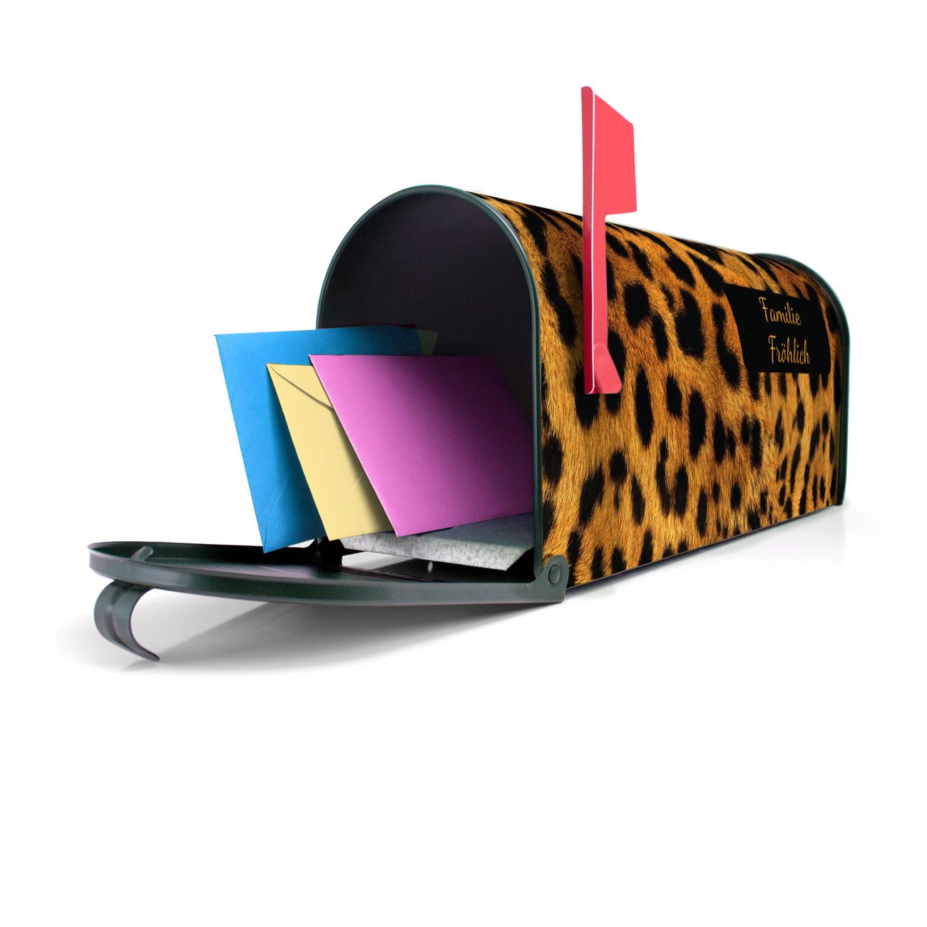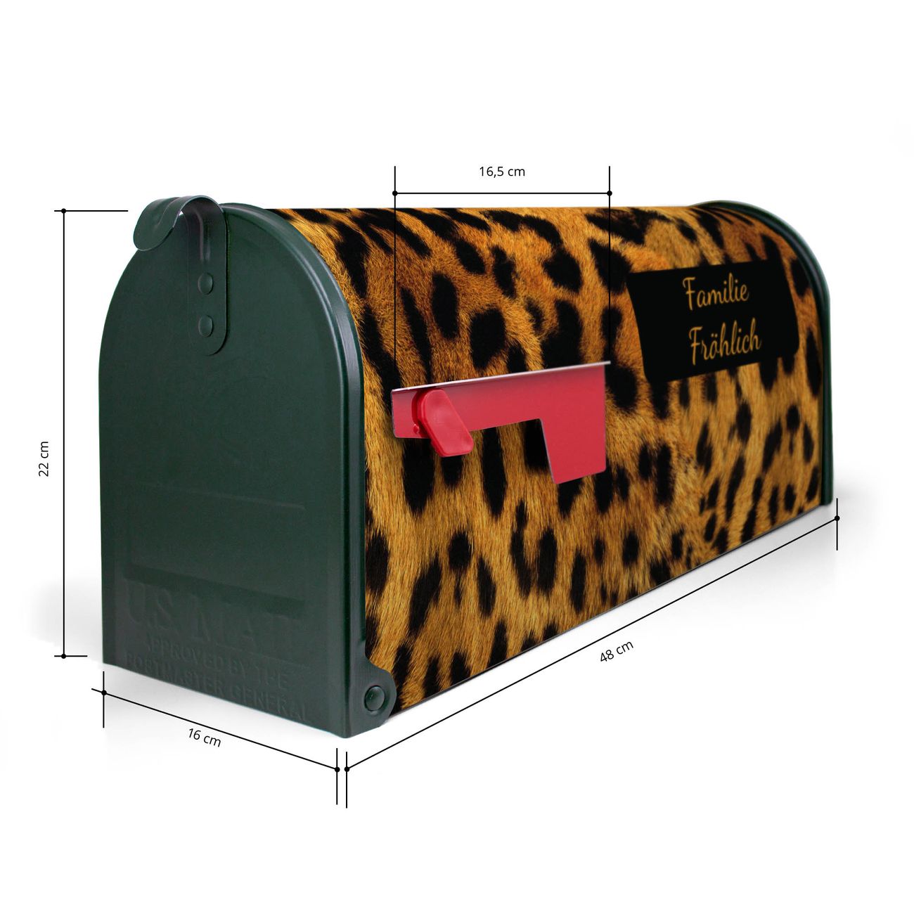 Der amerikanische Briefkasten von banjado mit Leopard Motiv bietet Ihnen ausreichend Fassungsvermögen, um große A4 Sendungen und Zeitschriften zu empfangen. Die typisch amerikanische rote Fahne zeigt Ihnen an, wenn Sie Post erhalten haben. Die US-Mailbox besteht aus verzinktem Stahlblech welches lackiert wurde und ist 48 x 22 x 16 CM (BxHxT) groß. Die Folie mit Motiv Leopard besteht aus einer wetter- und UV-resistenten Folie, die mit einem Schutzlaminat überzogen ist, sodass die US Mailbox zusätzlich vor Kratzern geschützt ist. An der Unterkante sind 4 Löcher je Seite um die Mailbox, typisch amerikanisch, an einem Holzpfahl oder einem Zaun zu befestigen. Auf Wunsch können Sie bei uns den passenden Standfuß oder die passende Wandhalterung kaufen um die US-Mailbox sicher zu befestigen. Wir bieten Ihnen ebenfalls Namensschilder, bereits beschriftet oder frei zu beschriften, und verschiedene selbst gestaltete Bitte-Keine-Werbung-Aufkleber.