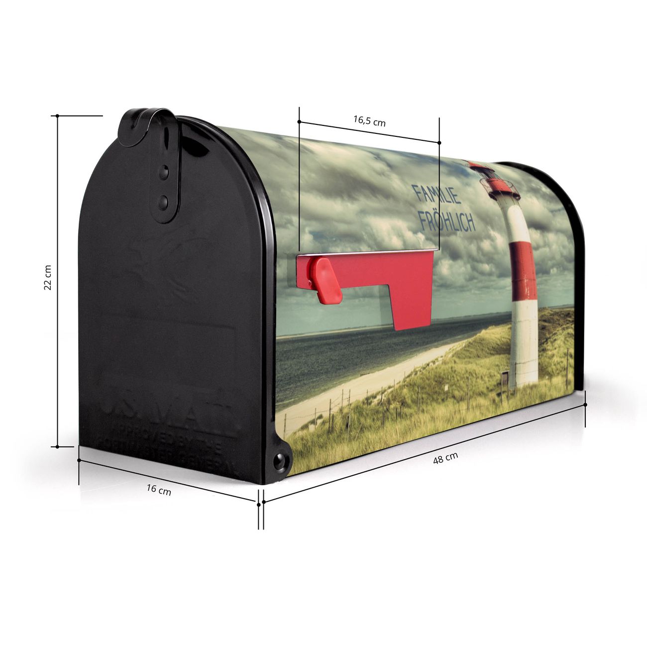 Der amerikanische Briefkasten von banjado mit Leuchtturm Sylt Motiv bietet Ihnen ausreichend Fassungsvermögen, um große A4 Sendungen und Zeitschriften zu empfangen. Die typisch amerikanische rote Fahne zeigt Ihnen an, wenn Sie Post erhalten haben. Die US-Mailbox besteht aus verzinktem Stahlblech welches lackiert wurde und ist 48 x 22 x 16 CM (BxHxT) groß. Die Folie mit Motiv Leuchtturm Sylt besteht aus einer wetter- und UV-resistenten Folie, die mit einem Schutzlaminat überzogen ist, sodass die US Mailbox zusätzlich vor Kratzern geschützt ist. An der Unterkante sind 4 Löcher je Seite um die Mailbox, typisch amerikanisch, an einem Holzpfahl oder einem Zaun zu befestigen. Auf Wunsch können Sie bei uns den passenden Standfuß oder die passende Wandhalterung kaufen um die US-Mailbox sicher zu befestigen. Wir bieten Ihnen ebenfalls Namensschilder, bereits beschriftet oder frei zu beschriften, und verschiedene selbst gestaltete Bitte-Keine-Werbung-Aufkleber.