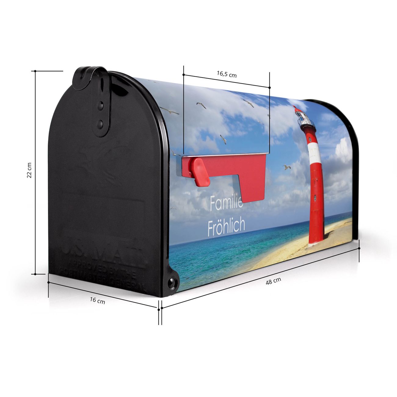 Der amerikanische Briefkasten von banjado mit Leuchtturm Westkapelle Motiv bietet Ihnen ausreichend Fassungsvermögen, um große A4 Sendungen und Zeitschriften zu empfangen. Die typisch amerikanische rote Fahne zeigt Ihnen an, wenn Sie Post erhalten haben. Die US-Mailbox besteht aus verzinktem Stahlblech welches lackiert wurde und ist 48 x 22 x 16 CM (BxHxT) groß. Die Folie mit Motiv Leuchtturm Westkapelle besteht aus einer wetter- und UV-resistenten Folie, die mit einem Schutzlaminat überzogen ist, sodass die US Mailbox zusätzlich vor Kratzern geschützt ist. An der Unterkante sind 4 Löcher je Seite um die Mailbox, typisch amerikanisch, an einem Holzpfahl oder einem Zaun zu befestigen. Auf Wunsch können Sie bei uns den passenden Standfuß oder die passende Wandhalterung kaufen um die US-Mailbox sicher zu befestigen. Wir bieten Ihnen ebenfalls Namensschilder, bereits beschriftet oder frei zu beschriften, und verschiedene selbst gestaltete Bitte-Keine-Werbung-Aufkleber.