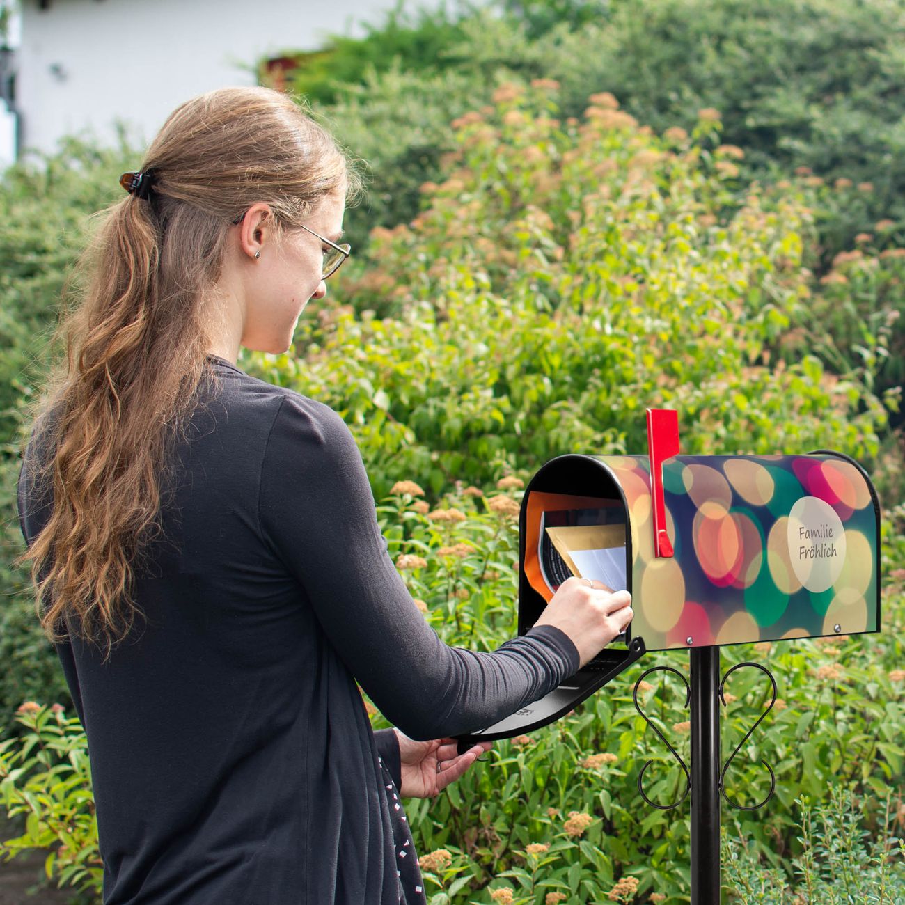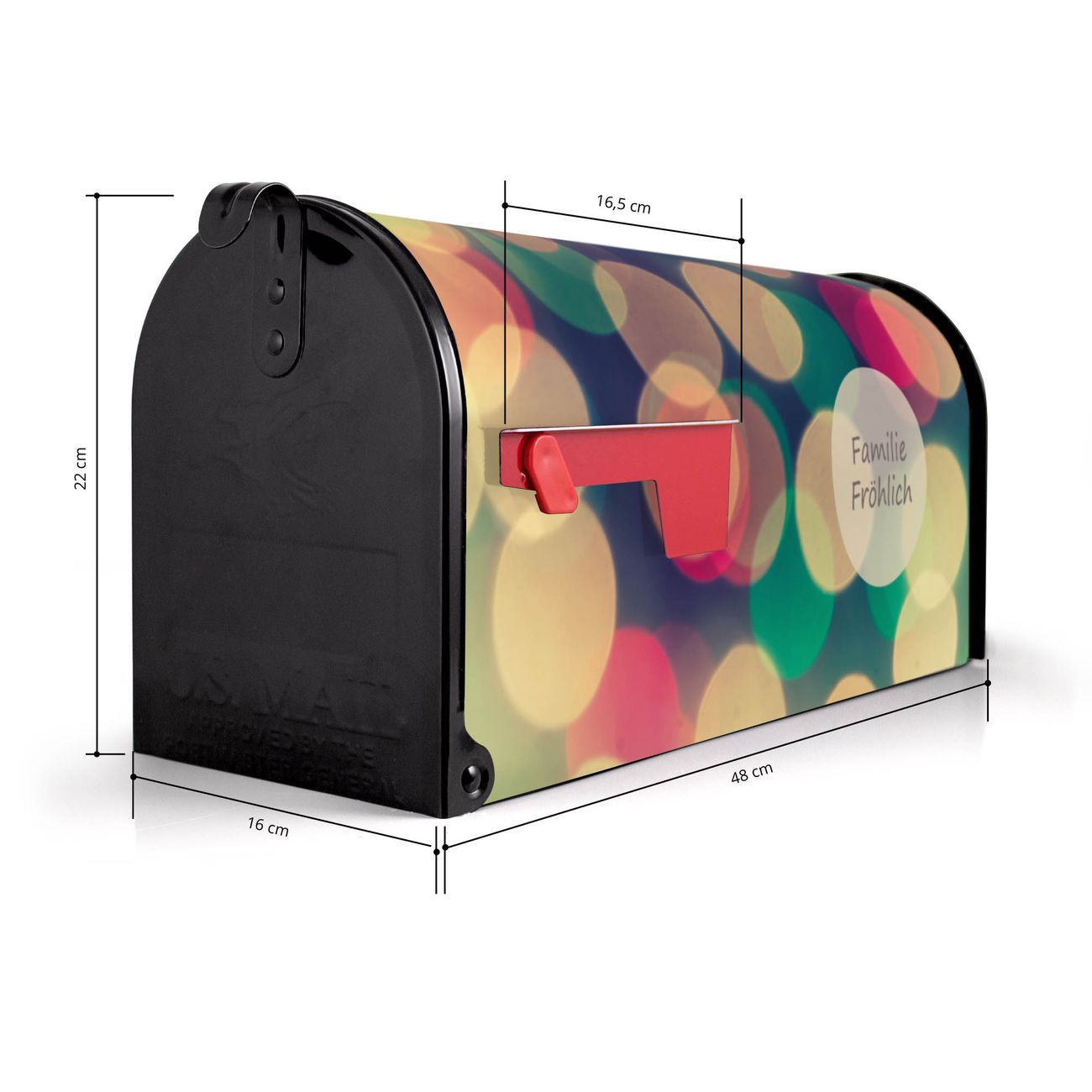 Der amerikanische Briefkasten von banjado mit Lichtpunkte Weiß Grün Rot Motiv bietet Ihnen ausreichend Fassungsvermögen, um große A4 Sendungen und Zeitschriften zu empfangen. Die typisch amerikanische rote Fahne zeigt Ihnen an, wenn Sie Post erhalten haben. Die US-Mailbox besteht aus verzinktem Stahlblech welches lackiert wurde und ist 48 x 22 x 16 CM (BxHxT) groß. Die Folie mit Motiv Lichtpunkte Weiß Grün Rot besteht aus einer wetter- und UV-resistenten Folie, die mit einem Schutzlaminat überzogen ist, sodass die US Mailbox zusätzlich vor Kratzern geschützt ist. An der Unterkante sind 4 Löcher je Seite um die Mailbox, typisch amerikanisch, an einem Holzpfahl oder einem Zaun zu befestigen. Auf Wunsch können Sie bei uns den passenden Standfuß oder die passende Wandhalterung kaufen um die US-Mailbox sicher zu befestigen. Wir bieten Ihnen ebenfalls Namensschilder, bereits beschriftet oder frei zu beschriften, und verschiedene selbst gestaltete Bitte-Keine-Werbung-Aufkleber.