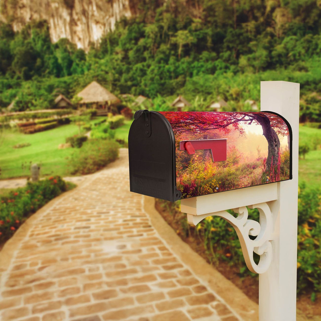 Der amerikanische Briefkasten von banjado mit Lichtung Im Herbst Motiv bietet Ihnen ausreichend Fassungsvermögen, um große A4 Sendungen und Zeitschriften zu empfangen. Die typisch amerikanische rote Fahne zeigt Ihnen an, wenn Sie Post erhalten haben. Die US-Mailbox besteht aus verzinktem Stahlblech welches lackiert wurde und ist 48 x 22 x 16 CM (BxHxT) groß. Die Folie mit Motiv Lichtung Im Herbst besteht aus einer wetter- und UV-resistenten Folie, die mit einem Schutzlaminat überzogen ist, sodass die US Mailbox zusätzlich vor Kratzern geschützt ist. An der Unterkante sind 4 Löcher je Seite um die Mailbox, typisch amerikanisch, an einem Holzpfahl oder einem Zaun zu befestigen. Auf Wunsch können Sie bei uns den passenden Standfuß oder die passende Wandhalterung kaufen um die US-Mailbox sicher zu befestigen. Wir bieten Ihnen ebenfalls Namensschilder, bereits beschriftet oder frei zu beschriften, und verschiedene selbst gestaltete Bitte-Keine-Werbung-Aufkleber.
