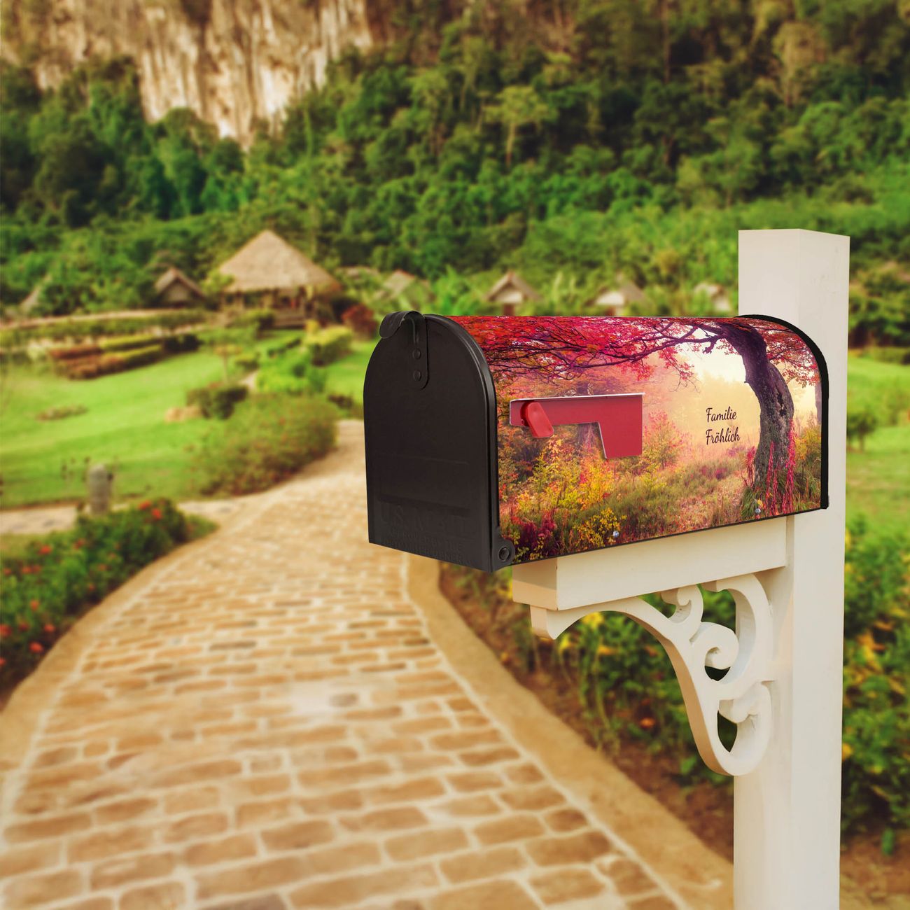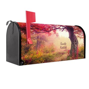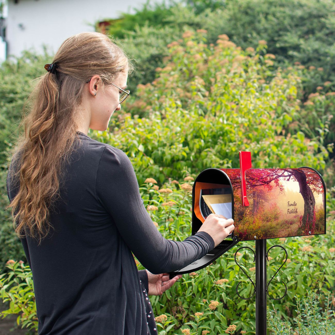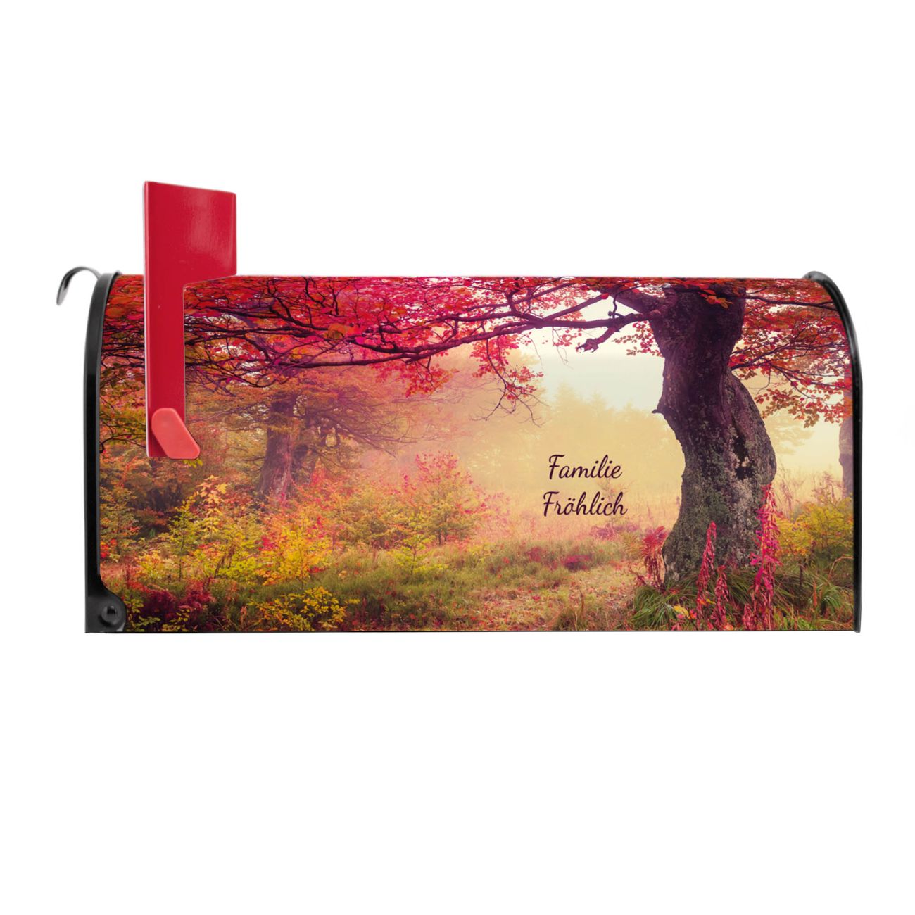 Der amerikanische Briefkasten von banjado mit Lichtung Im Herbst Motiv bietet Ihnen ausreichend Fassungsvermögen, um große A4 Sendungen und Zeitschriften zu empfangen. Die typisch amerikanische rote Fahne zeigt Ihnen an, wenn Sie Post erhalten haben. Die US-Mailbox besteht aus verzinktem Stahlblech welches lackiert wurde und ist 48 x 22 x 16 CM (BxHxT) groß. Die Folie mit Motiv Lichtung Im Herbst besteht aus einer wetter- und UV-resistenten Folie, die mit einem Schutzlaminat überzogen ist, sodass die US Mailbox zusätzlich vor Kratzern geschützt ist. An der Unterkante sind 4 Löcher je Seite um die Mailbox, typisch amerikanisch, an einem Holzpfahl oder einem Zaun zu befestigen. Auf Wunsch können Sie bei uns den passenden Standfuß oder die passende Wandhalterung kaufen um die US-Mailbox sicher zu befestigen. Wir bieten Ihnen ebenfalls Namensschilder, bereits beschriftet oder frei zu beschriften, und verschiedene selbst gestaltete Bitte-Keine-Werbung-Aufkleber.