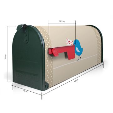Der amerikanische Briefkasten von banjado mit Liebesbrief Motiv bietet Ihnen ausreichend Fassungsvermögen, um große A4 Sendungen und Zeitschriften zu empfangen. Die typisch amerikanische rote Fahne zeigt Ihnen an, wenn Sie Post erhalten haben. Die US-Mailbox besteht aus verzinktem Stahlblech welches lackiert wurde und ist 48 x 22 x 16 CM (BxHxT) groß. Die Folie mit Motiv Liebesbrief besteht aus einer wetter- und UV-resistenten Folie, die mit einem Schutzlaminat überzogen ist, sodass die US Mailbox zusätzlich vor Kratzern geschützt ist. An der Unterkante sind 4 Löcher je Seite um die Mailbox, typisch amerikanisch, an einem Holzpfahl oder einem Zaun zu befestigen. Auf Wunsch können Sie bei uns den passenden Standfuß oder die passende Wandhalterung kaufen um die US-Mailbox sicher zu befestigen. Wir bieten Ihnen ebenfalls Namensschilder, bereits beschriftet oder frei zu beschriften, und verschiedene selbst gestaltete Bitte-Keine-Werbung-Aufkleber.