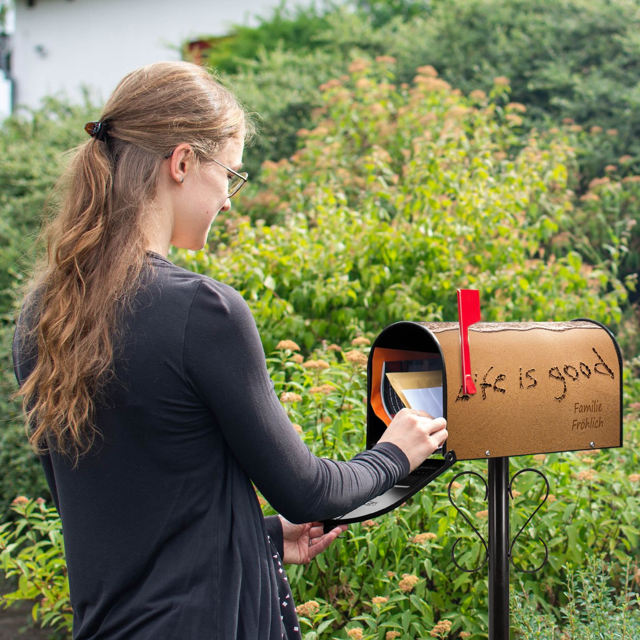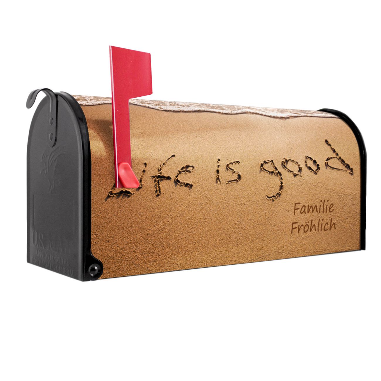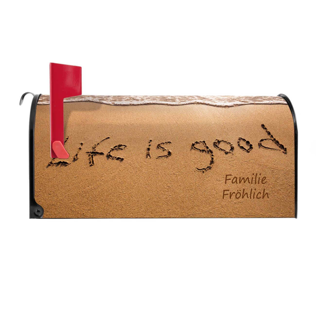 Der amerikanische Briefkasten von banjado mit Life Is Good Motiv bietet Ihnen ausreichend Fassungsvermögen, um große A4 Sendungen und Zeitschriften zu empfangen. Die typisch amerikanische rote Fahne zeigt Ihnen an, wenn Sie Post erhalten haben. Die US-Mailbox besteht aus verzinktem Stahlblech welches lackiert wurde und ist 48 x 22 x 16 CM (BxHxT) groß. Die Folie mit Motiv Life Is Good besteht aus einer wetter- und UV-resistenten Folie, die mit einem Schutzlaminat überzogen ist, sodass die US Mailbox zusätzlich vor Kratzern geschützt ist. An der Unterkante sind 4 Löcher je Seite um die Mailbox, typisch amerikanisch, an einem Holzpfahl oder einem Zaun zu befestigen. Auf Wunsch können Sie bei uns den passenden Standfuß oder die passende Wandhalterung kaufen um die US-Mailbox sicher zu befestigen. Wir bieten Ihnen ebenfalls Namensschilder, bereits beschriftet oder frei zu beschriften, und verschiedene selbst gestaltete Bitte-Keine-Werbung-Aufkleber.