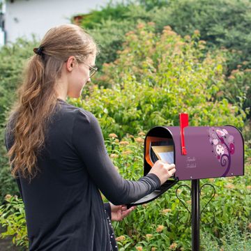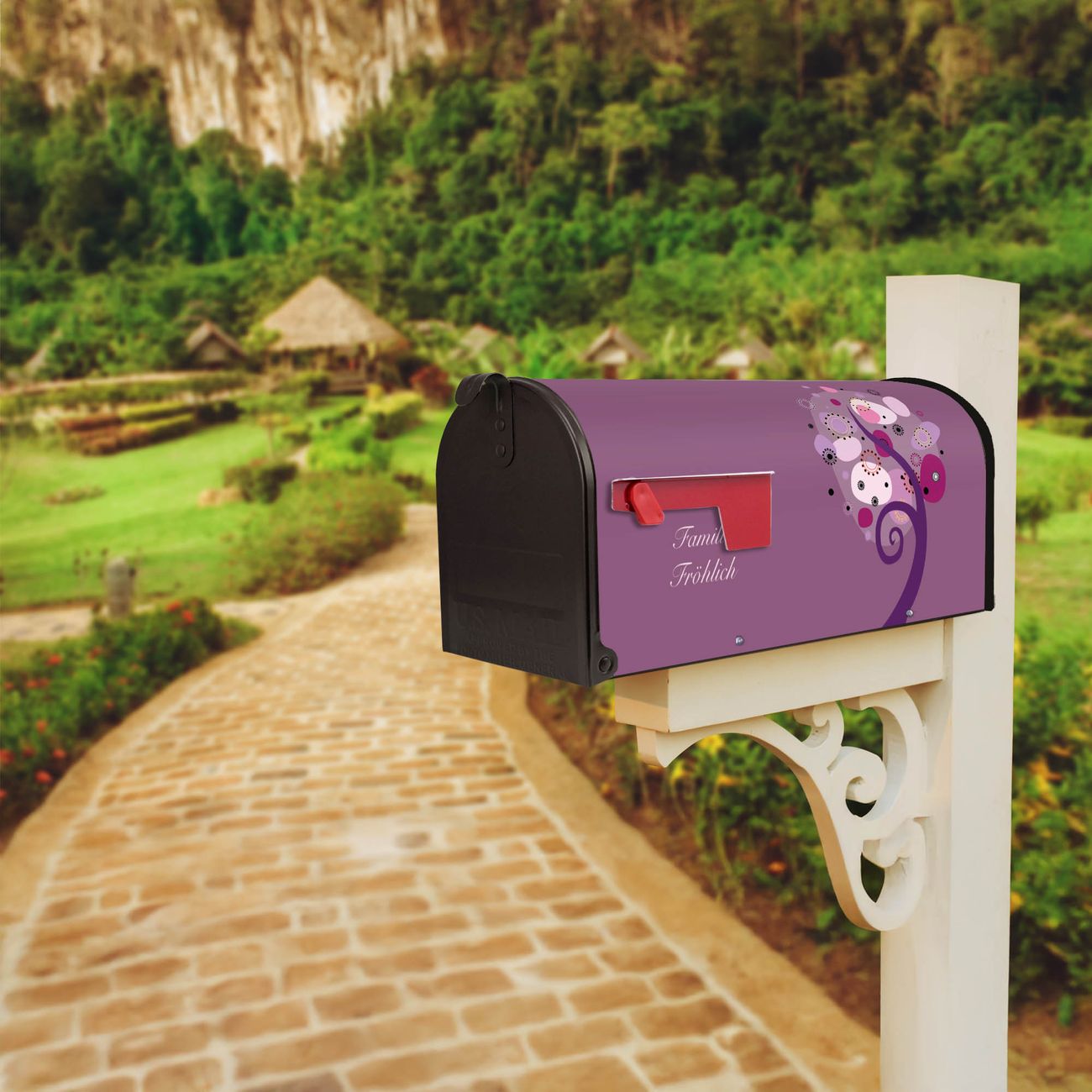 Der amerikanische Briefkasten von banjado mit Lila Baum Motiv bietet Ihnen ausreichend Fassungsvermögen, um große A4 Sendungen und Zeitschriften zu empfangen. Die typisch amerikanische rote Fahne zeigt Ihnen an, wenn Sie Post erhalten haben. Die US-Mailbox besteht aus verzinktem Stahlblech welches lackiert wurde und ist 48 x 22 x 16 CM (BxHxT) groß. Die Folie mit Motiv Lila Baum besteht aus einer wetter- und UV-resistenten Folie, die mit einem Schutzlaminat überzogen ist, sodass die US Mailbox zusätzlich vor Kratzern geschützt ist. An der Unterkante sind 4 Löcher je Seite um die Mailbox, typisch amerikanisch, an einem Holzpfahl oder einem Zaun zu befestigen. Auf Wunsch können Sie bei uns den passenden Standfuß oder die passende Wandhalterung kaufen um die US-Mailbox sicher zu befestigen. Wir bieten Ihnen ebenfalls Namensschilder, bereits beschriftet oder frei zu beschriften, und verschiedene selbst gestaltete Bitte-Keine-Werbung-Aufkleber.