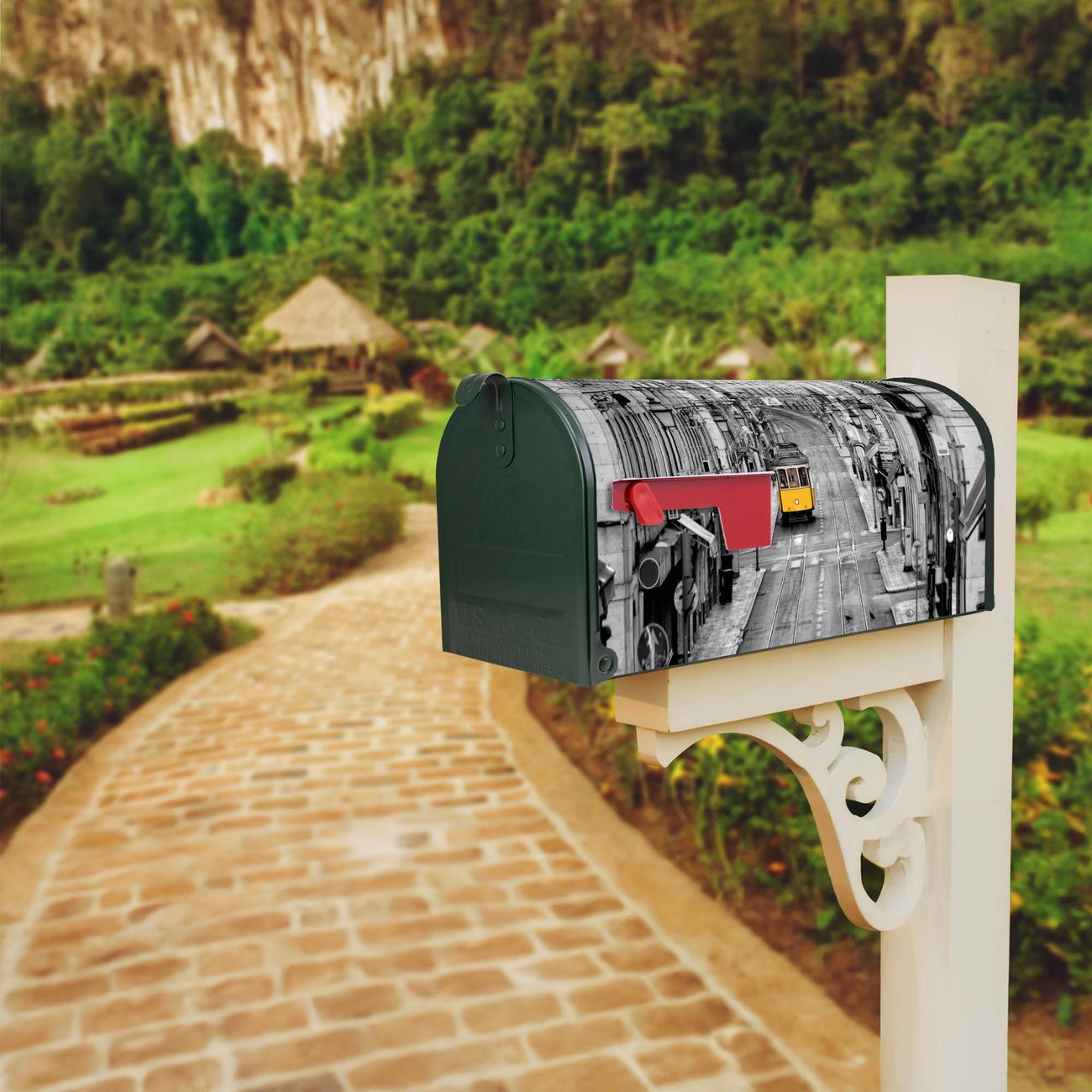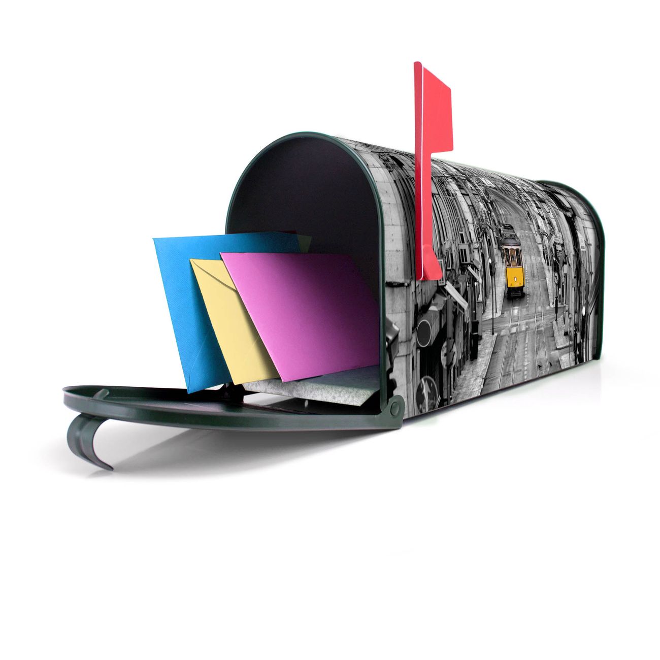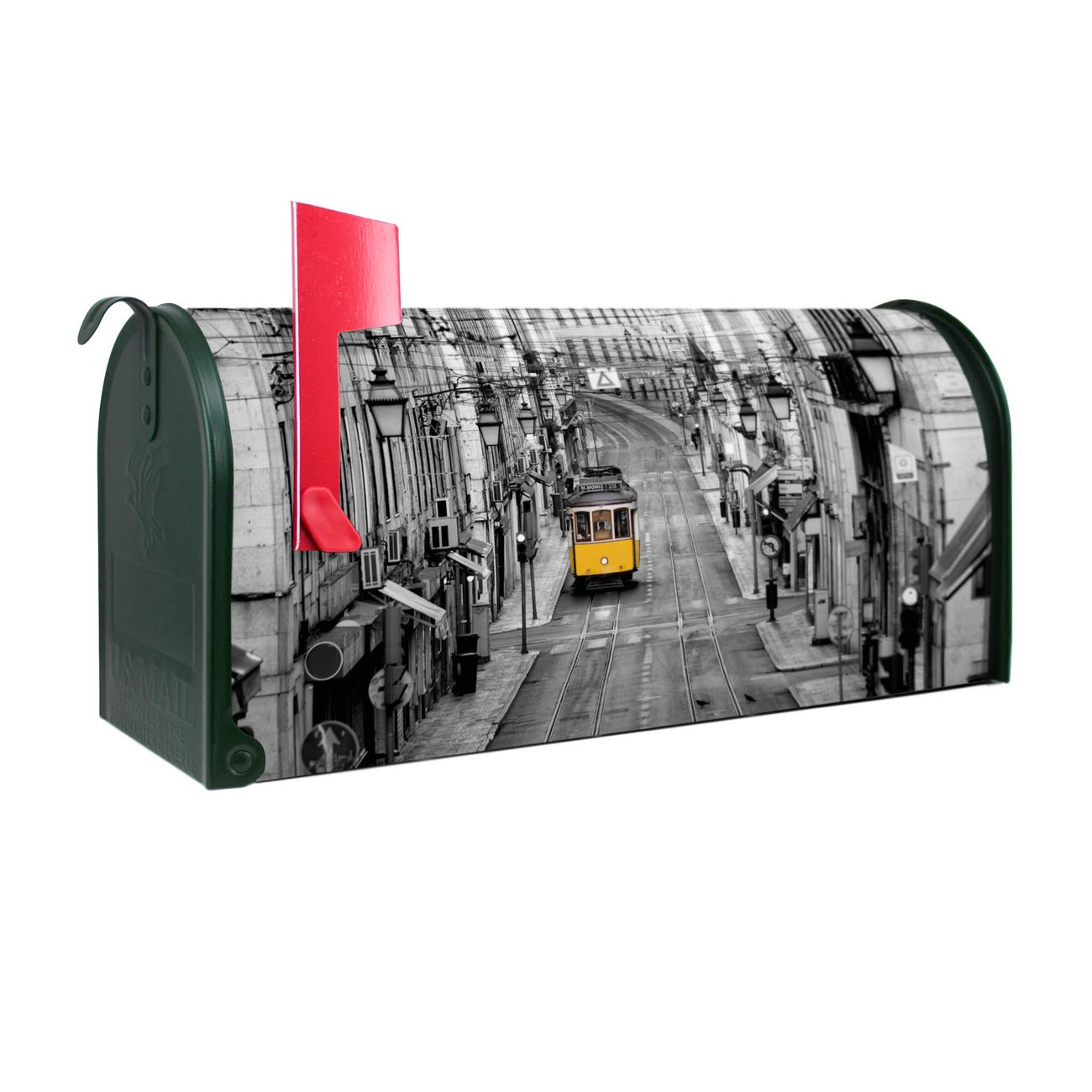 Unser amerikanischer Briefkasten mit dem Motiv Lissabon hat ein sehr ansprechendes und ausgefallenes Design, ist in der Grundfarbe weiß, grün oder schwarz erhältlich. Damit entlocken Sie Ihren Nachbarn und dem Postboten immer wieder ein Lächeln. Die Mailbox ist ein Original Import aus Mississippi USA und wird von unserer kleinen Manufaktur in Sachsen von Hand veredelt. Die US-Mailbox bietet ausreichend Platz auch für große Sendungen, eine Fahne die Ihnen Post anzeigt, wetterfestes und äußerst stabiles Material - so macht Post empfangen Freude.