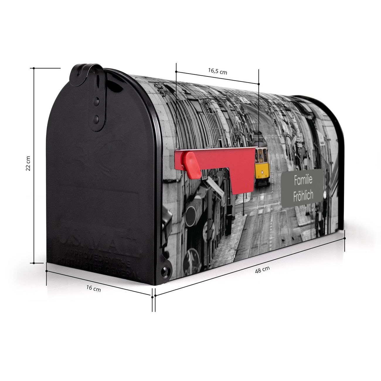 Der amerikanische Briefkasten von banjado mit Lissabon Motiv bietet Ihnen ausreichend Fassungsvermögen, um große A4 Sendungen und Zeitschriften zu empfangen. Die typisch amerikanische rote Fahne zeigt Ihnen an, wenn Sie Post erhalten haben. Die US-Mailbox besteht aus verzinktem Stahlblech welches lackiert wurde und ist 48 x 22 x 16 CM (BxHxT) groß. Die Folie mit Motiv Lissabon besteht aus einer wetter- und UV-resistenten Folie, die mit einem Schutzlaminat überzogen ist, sodass die US Mailbox zusätzlich vor Kratzern geschützt ist. An der Unterkante sind 4 Löcher je Seite um die Mailbox, typisch amerikanisch, an einem Holzpfahl oder einem Zaun zu befestigen. Auf Wunsch können Sie bei uns den passenden Standfuß oder die passende Wandhalterung kaufen um die US-Mailbox sicher zu befestigen. Wir bieten Ihnen ebenfalls Namensschilder, bereits beschriftet oder frei zu beschriften, und verschiedene selbst gestaltete Bitte-Keine-Werbung-Aufkleber.