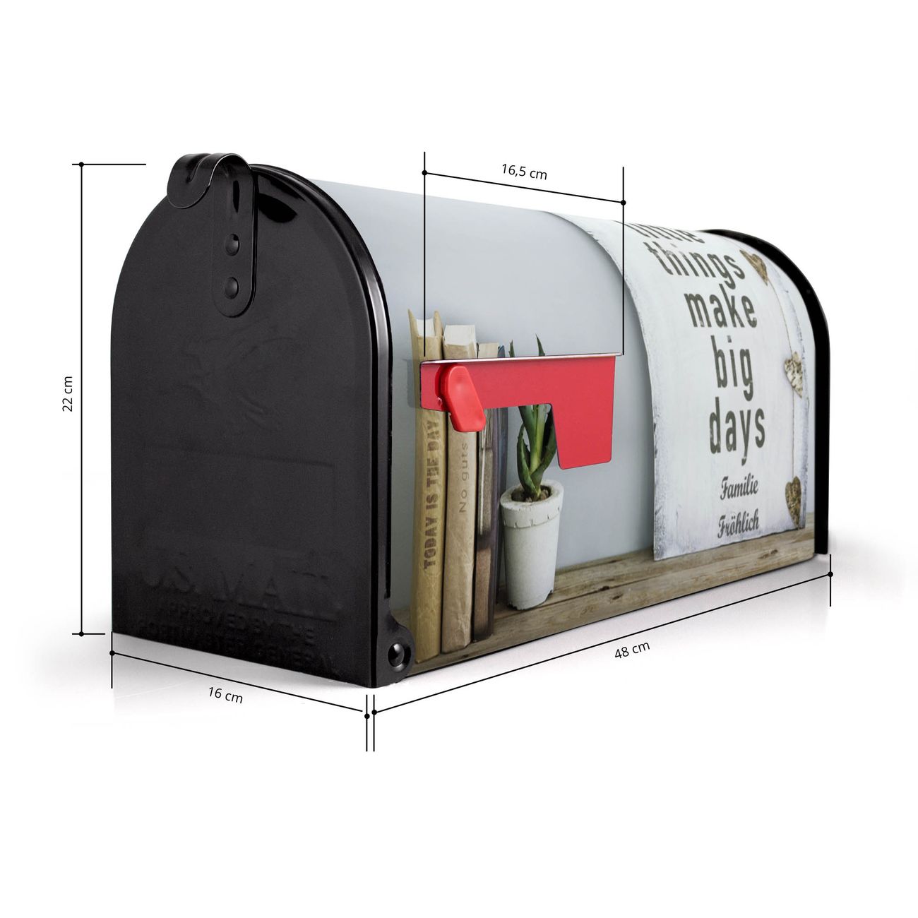 Der amerikanische Briefkasten von banjado mit Little Things Motiv bietet Ihnen ausreichend Fassungsvermögen, um große A4 Sendungen und Zeitschriften zu empfangen. Die typisch amerikanische rote Fahne zeigt Ihnen an, wenn Sie Post erhalten haben. Die US-Mailbox besteht aus verzinktem Stahlblech welches lackiert wurde und ist 48 x 22 x 16 CM (BxHxT) groß. Die Folie mit Motiv Little Things besteht aus einer wetter- und UV-resistenten Folie, die mit einem Schutzlaminat überzogen ist, sodass die US Mailbox zusätzlich vor Kratzern geschützt ist. An der Unterkante sind 4 Löcher je Seite um die Mailbox, typisch amerikanisch, an einem Holzpfahl oder einem Zaun zu befestigen. Auf Wunsch können Sie bei uns den passenden Standfuß oder die passende Wandhalterung kaufen um die US-Mailbox sicher zu befestigen. Wir bieten Ihnen ebenfalls Namensschilder, bereits beschriftet oder frei zu beschriften, und verschiedene selbst gestaltete Bitte-Keine-Werbung-Aufkleber.