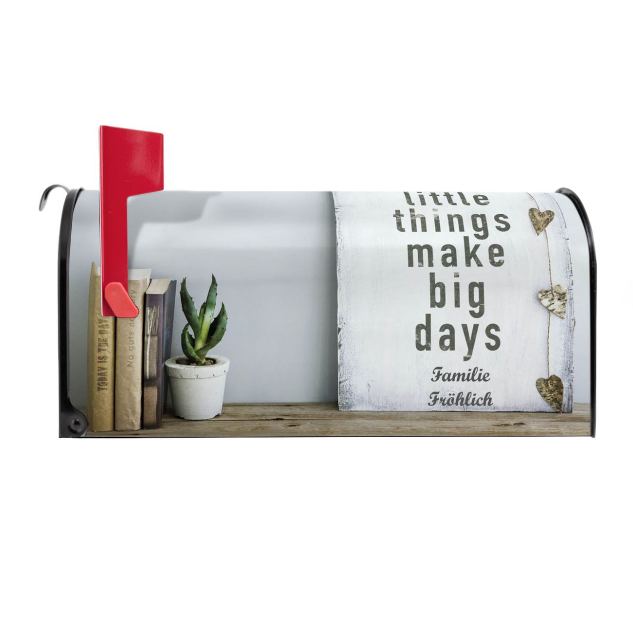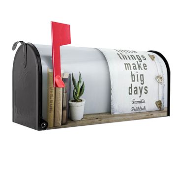 Unser amerikanischer Briefkasten mit dem Motiv Little Things hat ein sehr ansprechendes und ausgefallenes Design, ist in der Grundfarbe weiß, grün oder schwarz erhältlich. Damit entlocken Sie Ihren Nachbarn und dem Postboten immer wieder ein Lächeln. Die Mailbox ist ein Original Import aus Mississippi USA und wird von unserer kleinen Manufaktur in Sachsen von Hand veredelt. Die US-Mailbox bietet ausreichend Platz auch für große Sendungen, eine Fahne die Ihnen Post anzeigt, wetterfestes und äußerst stabiles Material - so macht Post empfangen Freude.