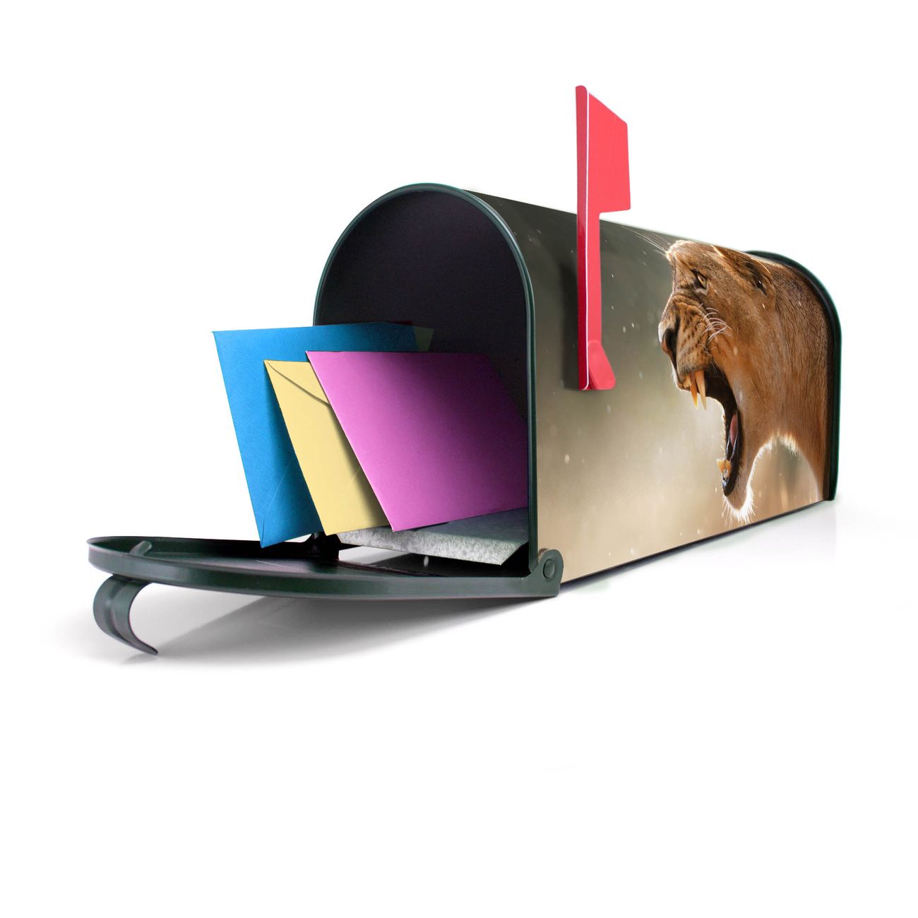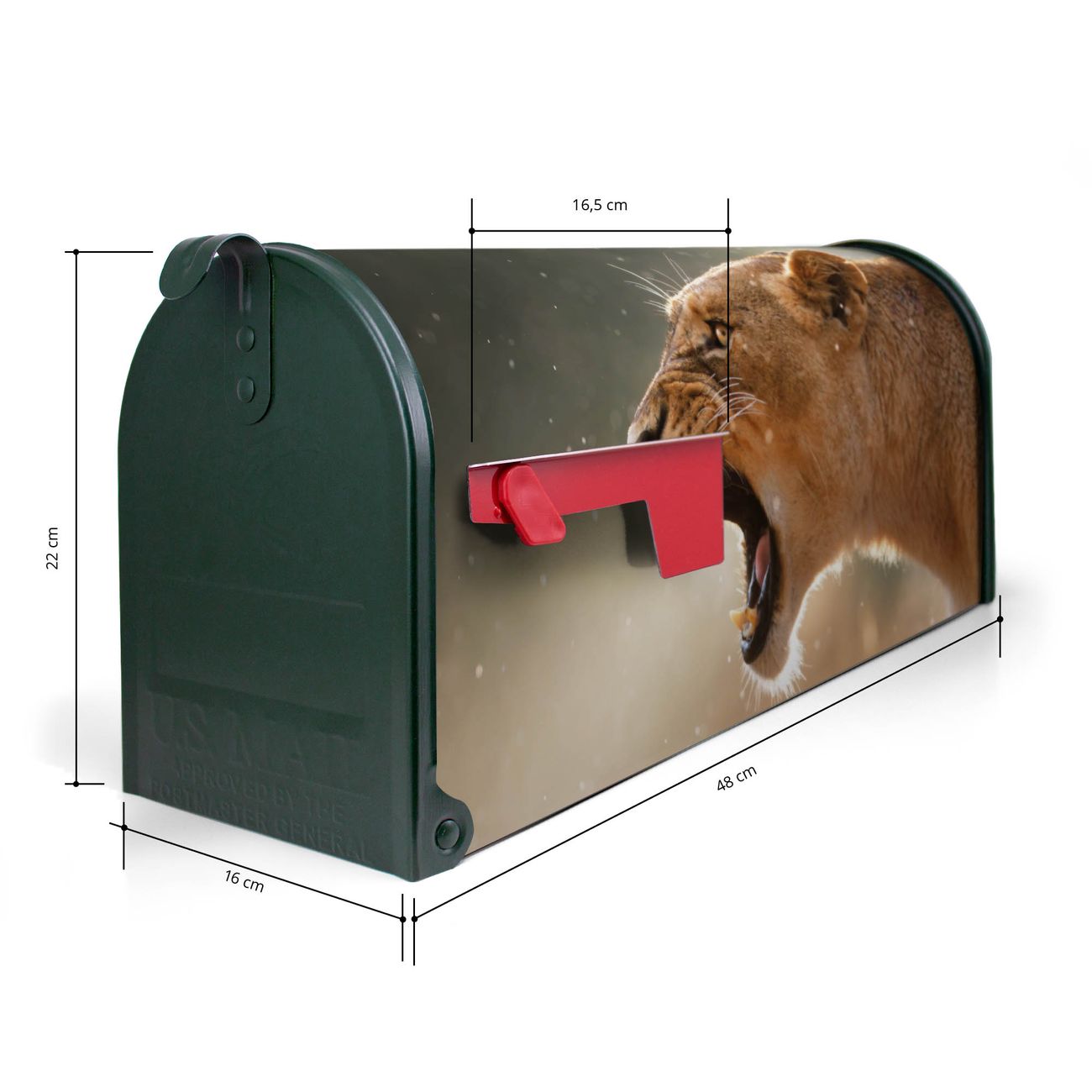 Der amerikanische Briefkasten von banjado mit Löwin Motiv bietet Ihnen ausreichend Fassungsvermögen, um große A4 Sendungen und Zeitschriften zu empfangen. Die typisch amerikanische rote Fahne zeigt Ihnen an, wenn Sie Post erhalten haben. Die US-Mailbox besteht aus verzinktem Stahlblech welches lackiert wurde und ist 48 x 22 x 16 CM (BxHxT) groß. Die Folie mit Motiv Löwin besteht aus einer wetter- und UV-resistenten Folie, die mit einem Schutzlaminat überzogen ist, sodass die US Mailbox zusätzlich vor Kratzern geschützt ist. An der Unterkante sind 4 Löcher je Seite um die Mailbox, typisch amerikanisch, an einem Holzpfahl oder einem Zaun zu befestigen. Auf Wunsch können Sie bei uns den passenden Standfuß oder die passende Wandhalterung kaufen um die US-Mailbox sicher zu befestigen. Wir bieten Ihnen ebenfalls Namensschilder, bereits beschriftet oder frei zu beschriften, und verschiedene selbst gestaltete Bitte-Keine-Werbung-Aufkleber.
