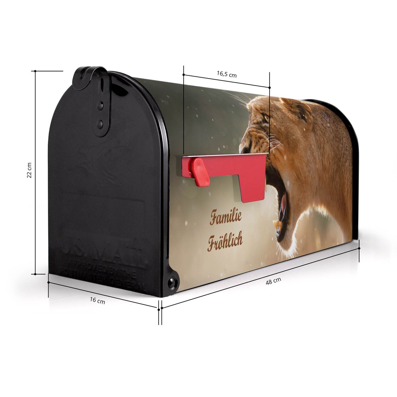 Der amerikanische Briefkasten von banjado mit Löwin Motiv bietet Ihnen ausreichend Fassungsvermögen, um große A4 Sendungen und Zeitschriften zu empfangen. Die typisch amerikanische rote Fahne zeigt Ihnen an, wenn Sie Post erhalten haben. Die US-Mailbox besteht aus verzinktem Stahlblech welches lackiert wurde und ist 48 x 22 x 16 CM (BxHxT) groß. Die Folie mit Motiv Löwin besteht aus einer wetter- und UV-resistenten Folie, die mit einem Schutzlaminat überzogen ist, sodass die US Mailbox zusätzlich vor Kratzern geschützt ist. An der Unterkante sind 4 Löcher je Seite um die Mailbox, typisch amerikanisch, an einem Holzpfahl oder einem Zaun zu befestigen. Auf Wunsch können Sie bei uns den passenden Standfuß oder die passende Wandhalterung kaufen um die US-Mailbox sicher zu befestigen. Wir bieten Ihnen ebenfalls Namensschilder, bereits beschriftet oder frei zu beschriften, und verschiedene selbst gestaltete Bitte-Keine-Werbung-Aufkleber.