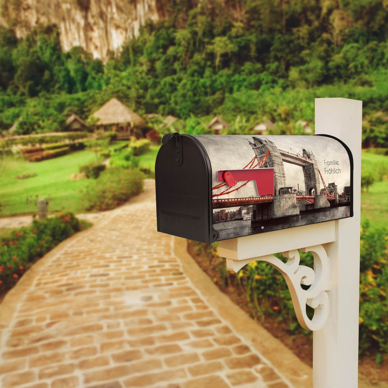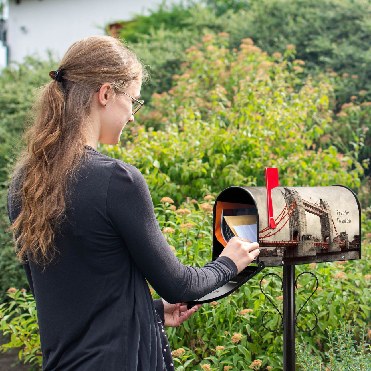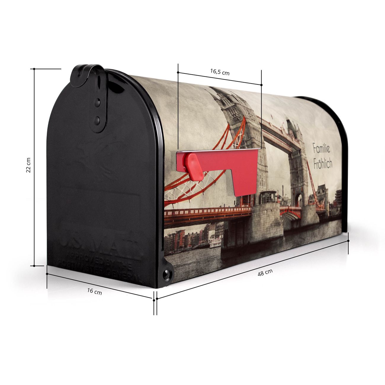 Der amerikanische Briefkasten von banjado mit London Bridge Motiv bietet Ihnen ausreichend Fassungsvermögen, um große A4 Sendungen und Zeitschriften zu empfangen. Die typisch amerikanische rote Fahne zeigt Ihnen an, wenn Sie Post erhalten haben. Die US-Mailbox besteht aus verzinktem Stahlblech welches lackiert wurde und ist 48 x 22 x 16 CM (BxHxT) groß. Die Folie mit Motiv London Bridge besteht aus einer wetter- und UV-resistenten Folie, die mit einem Schutzlaminat überzogen ist, sodass die US Mailbox zusätzlich vor Kratzern geschützt ist. An der Unterkante sind 4 Löcher je Seite um die Mailbox, typisch amerikanisch, an einem Holzpfahl oder einem Zaun zu befestigen. Auf Wunsch können Sie bei uns den passenden Standfuß oder die passende Wandhalterung kaufen um die US-Mailbox sicher zu befestigen. Wir bieten Ihnen ebenfalls Namensschilder, bereits beschriftet oder frei zu beschriften, und verschiedene selbst gestaltete Bitte-Keine-Werbung-Aufkleber.