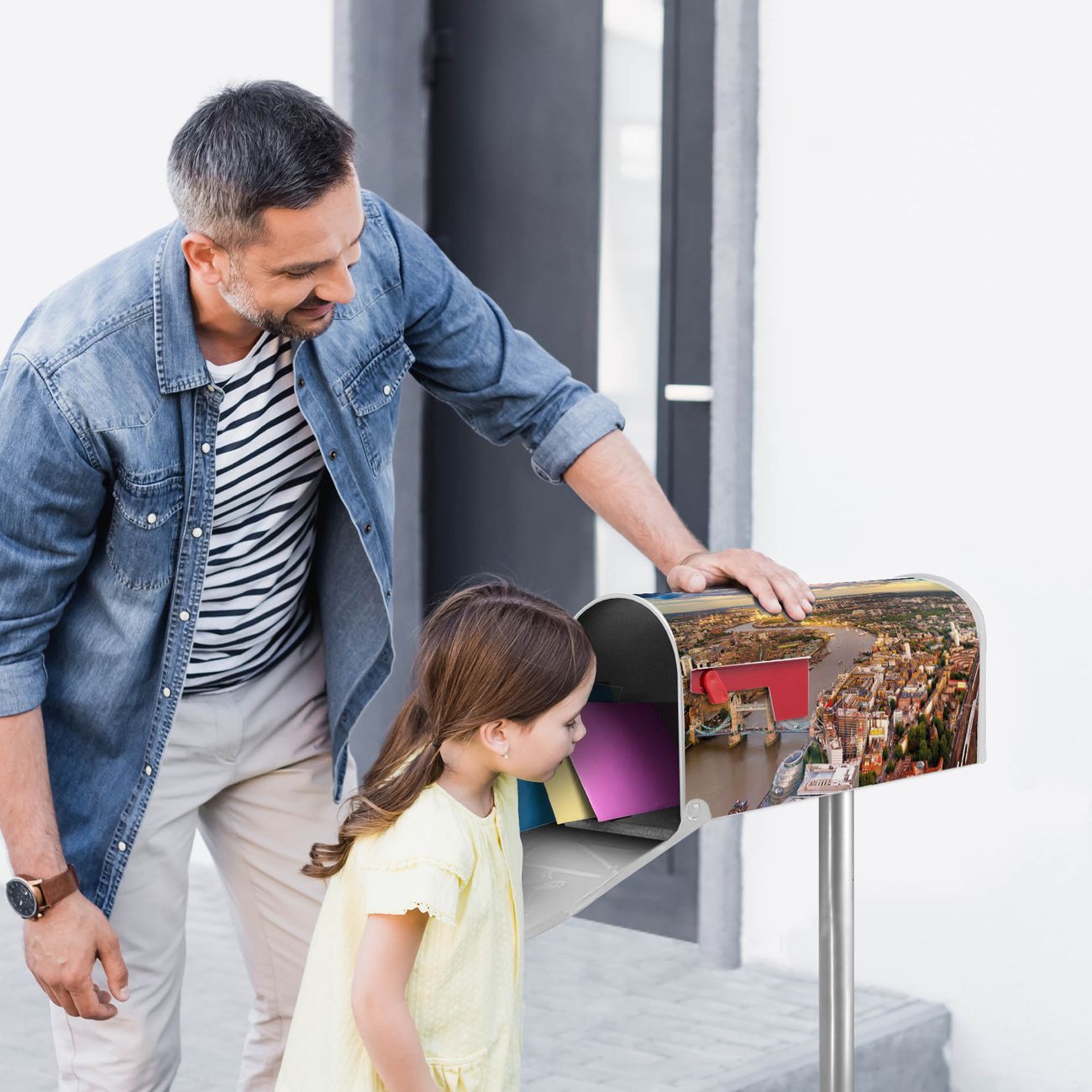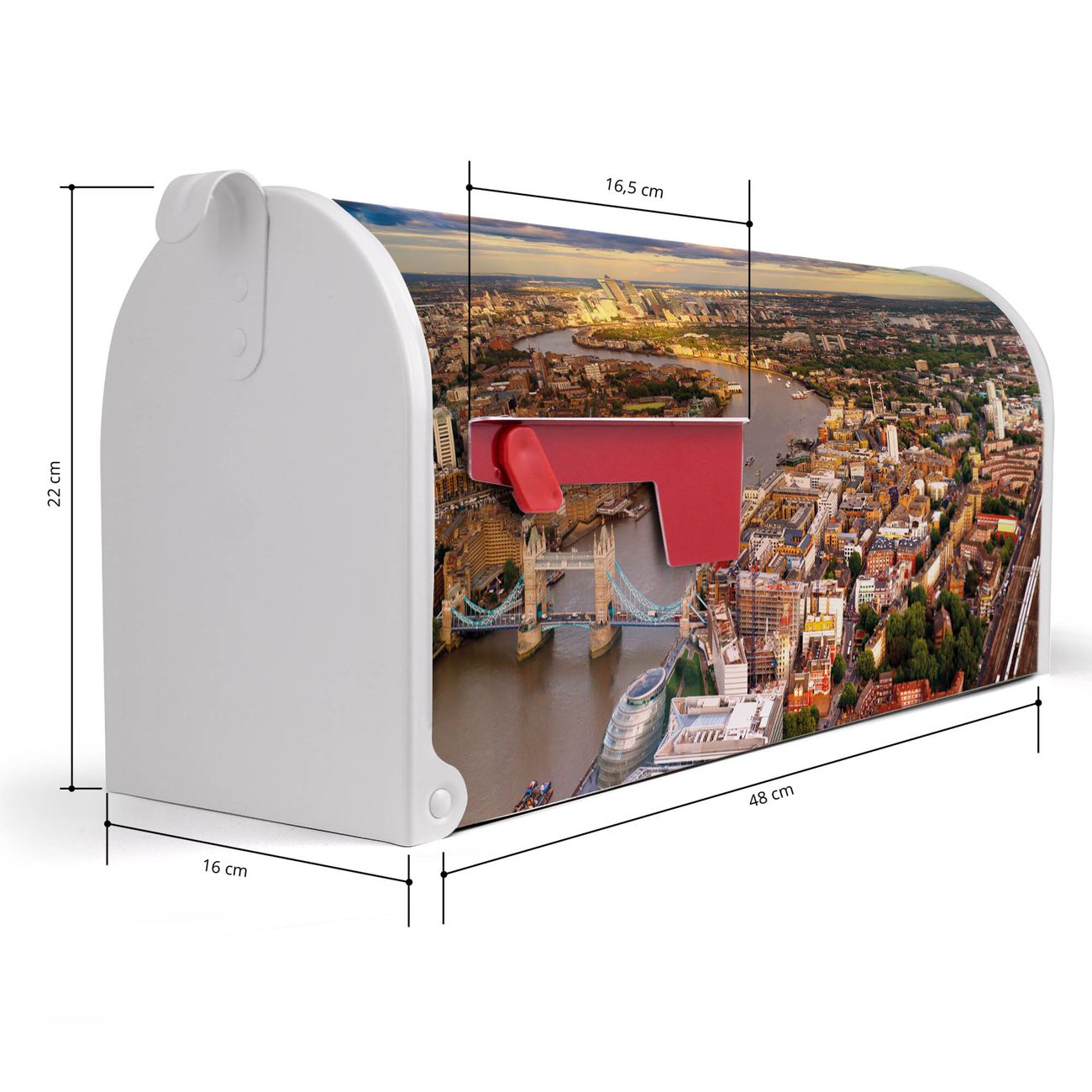 Der amerikanische Briefkasten von banjado mit London Motiv bietet Ihnen ausreichend Fassungsvermögen, um große A4 Sendungen und Zeitschriften zu empfangen. Die typisch amerikanische rote Fahne zeigt Ihnen an, wenn Sie Post erhalten haben. Die US-Mailbox besteht aus verzinktem Stahlblech welches lackiert wurde und ist 48 x 22 x 16 CM (BxHxT) groß. Die Folie mit Motiv London besteht aus einer wetter- und UV-resistenten Folie, die mit einem Schutzlaminat überzogen ist, sodass die US Mailbox zusätzlich vor Kratzern geschützt ist. An der Unterkante sind 4 Löcher je Seite um die Mailbox, typisch amerikanisch, an einem Holzpfahl oder einem Zaun zu befestigen. Auf Wunsch können Sie bei uns den passenden Standfuß oder die passende Wandhalterung kaufen um die US-Mailbox sicher zu befestigen. Wir bieten Ihnen ebenfalls Namensschilder, bereits beschriftet oder frei zu beschriften, und verschiedene selbst gestaltete Bitte-Keine-Werbung-Aufkleber.