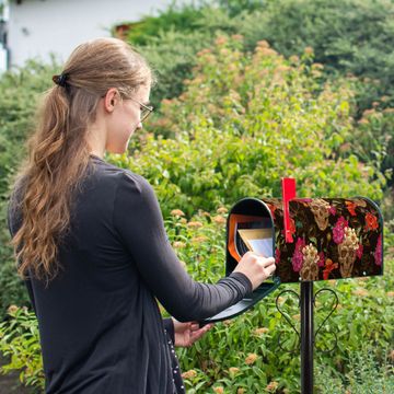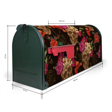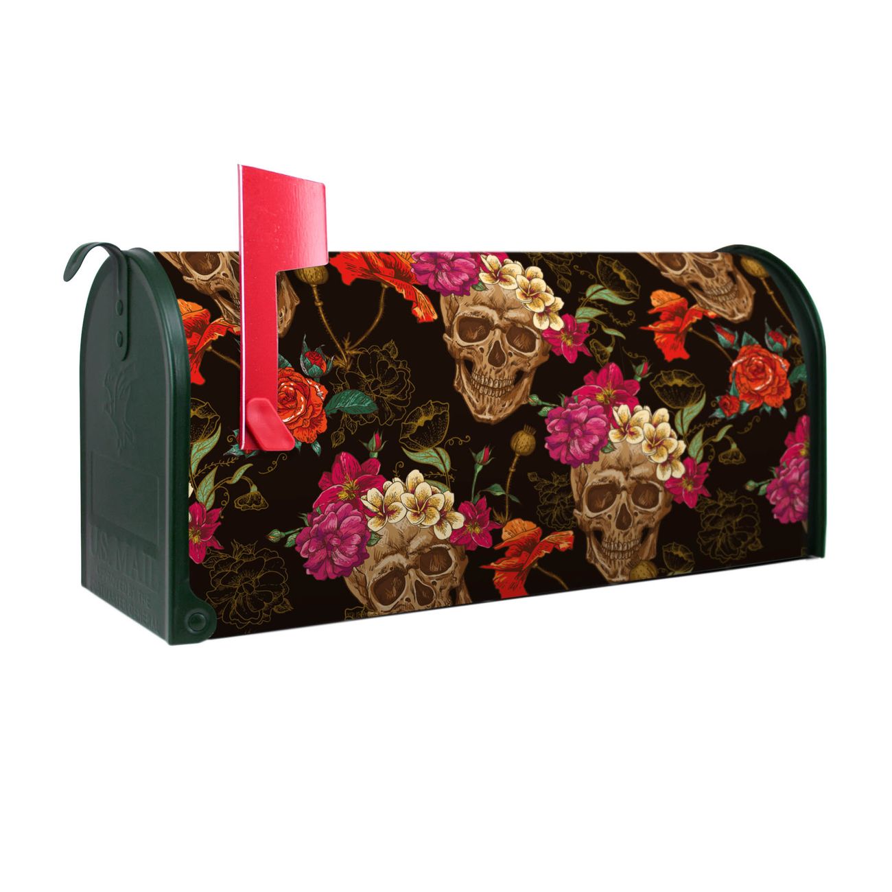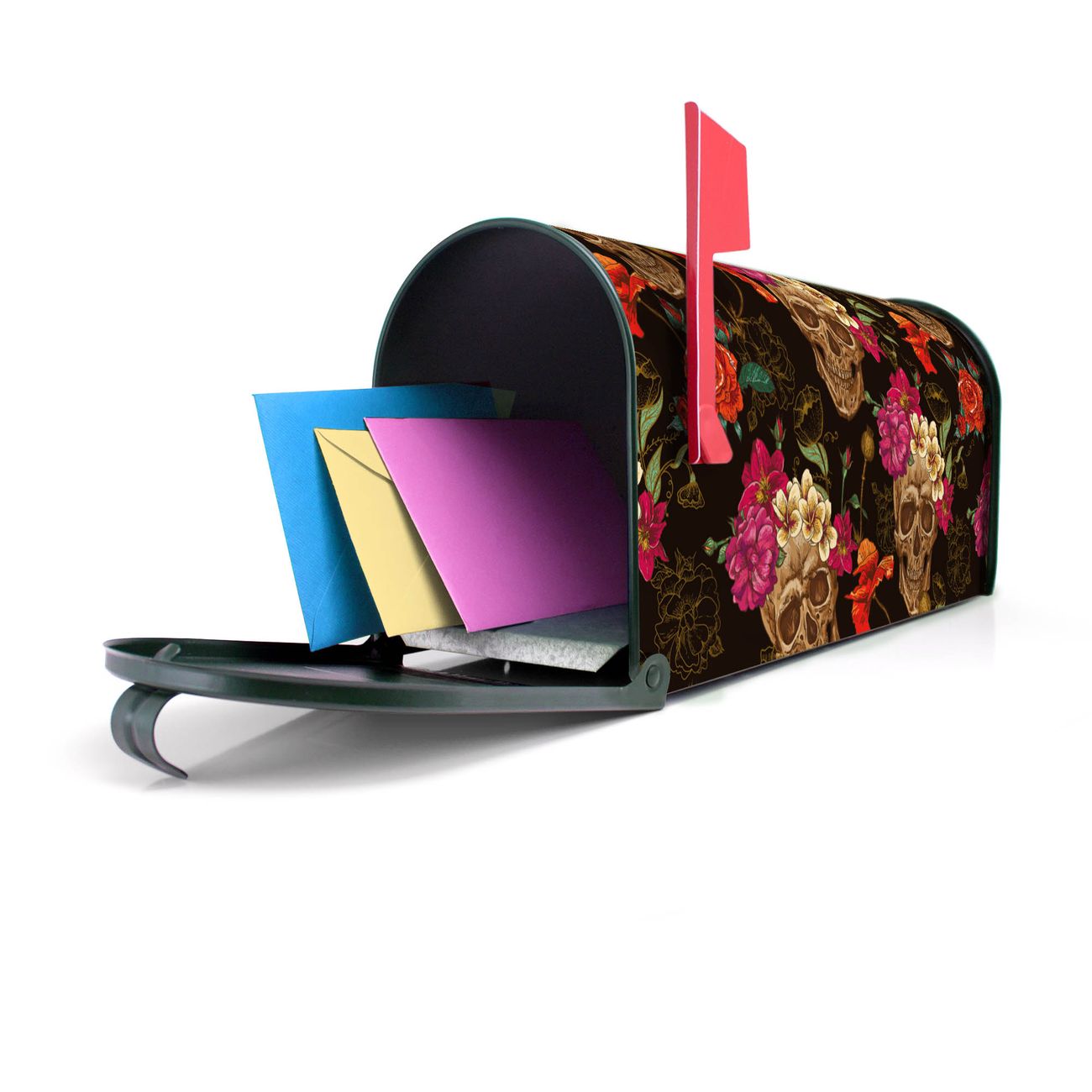 Der amerikanische Briefkasten von banjado mit Los Dias de Muertos Motiv bietet Ihnen ausreichend Fassungsvermögen, um große A4 Sendungen und Zeitschriften zu empfangen. Die typisch amerikanische rote Fahne zeigt Ihnen an, wenn Sie Post erhalten haben. Die US-Mailbox besteht aus verzinktem Stahlblech welches lackiert wurde und ist 48 x 22 x 16 CM (BxHxT) groß. Die Folie mit Motiv Los Dias de Muertos besteht aus einer wetter- und UV-resistenten Folie, die mit einem Schutzlaminat überzogen ist, sodass die US Mailbox zusätzlich vor Kratzern geschützt ist. An der Unterkante sind 4 Löcher je Seite um die Mailbox, typisch amerikanisch, an einem Holzpfahl oder einem Zaun zu befestigen. Auf Wunsch können Sie bei uns den passenden Standfuß oder die passende Wandhalterung kaufen um die US-Mailbox sicher zu befestigen. Wir bieten Ihnen ebenfalls Namensschilder, bereits beschriftet oder frei zu beschriften, und verschiedene selbst gestaltete Bitte-Keine-Werbung-Aufkleber.