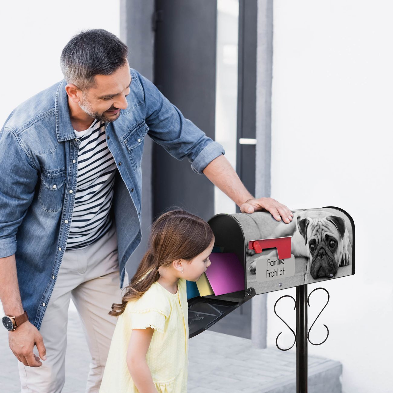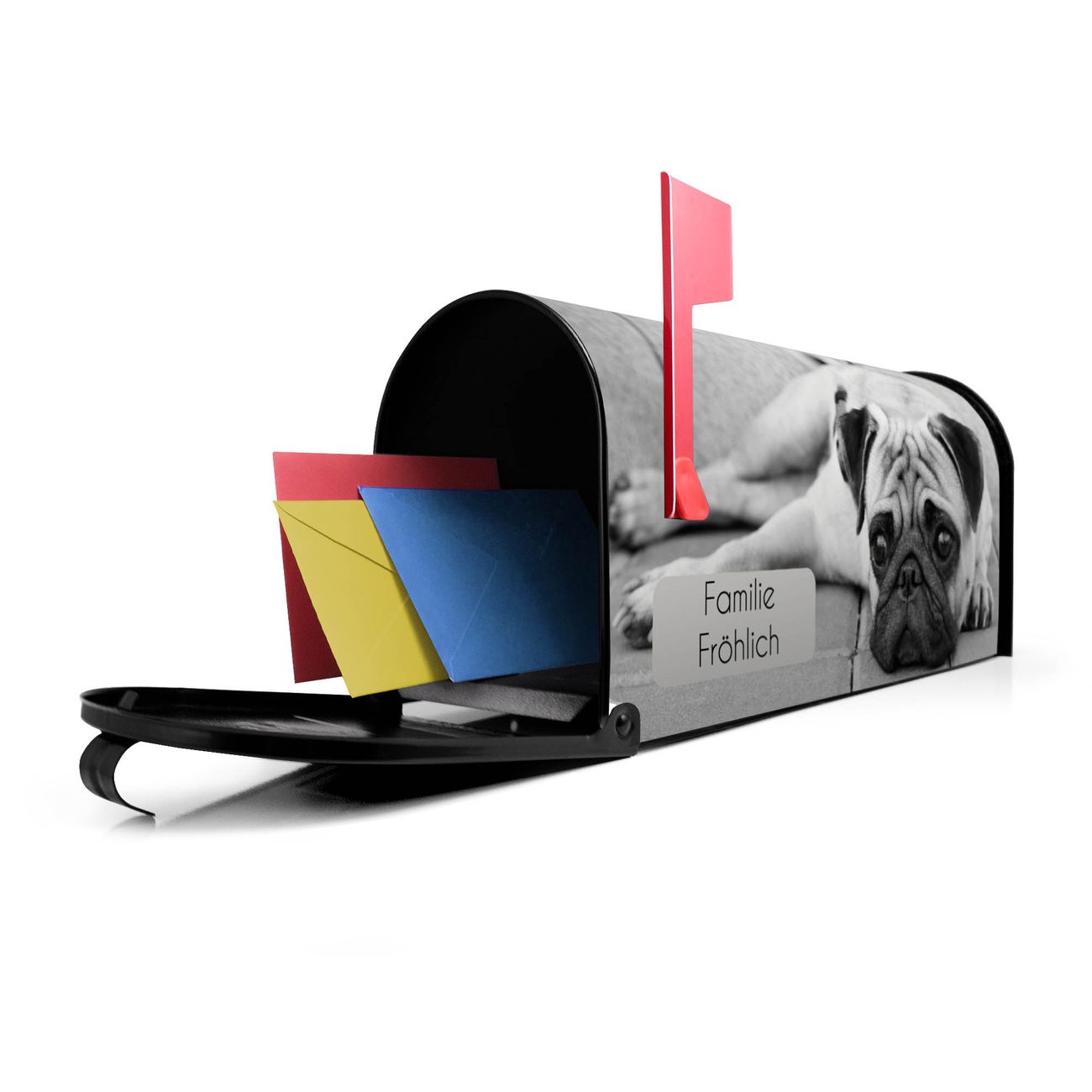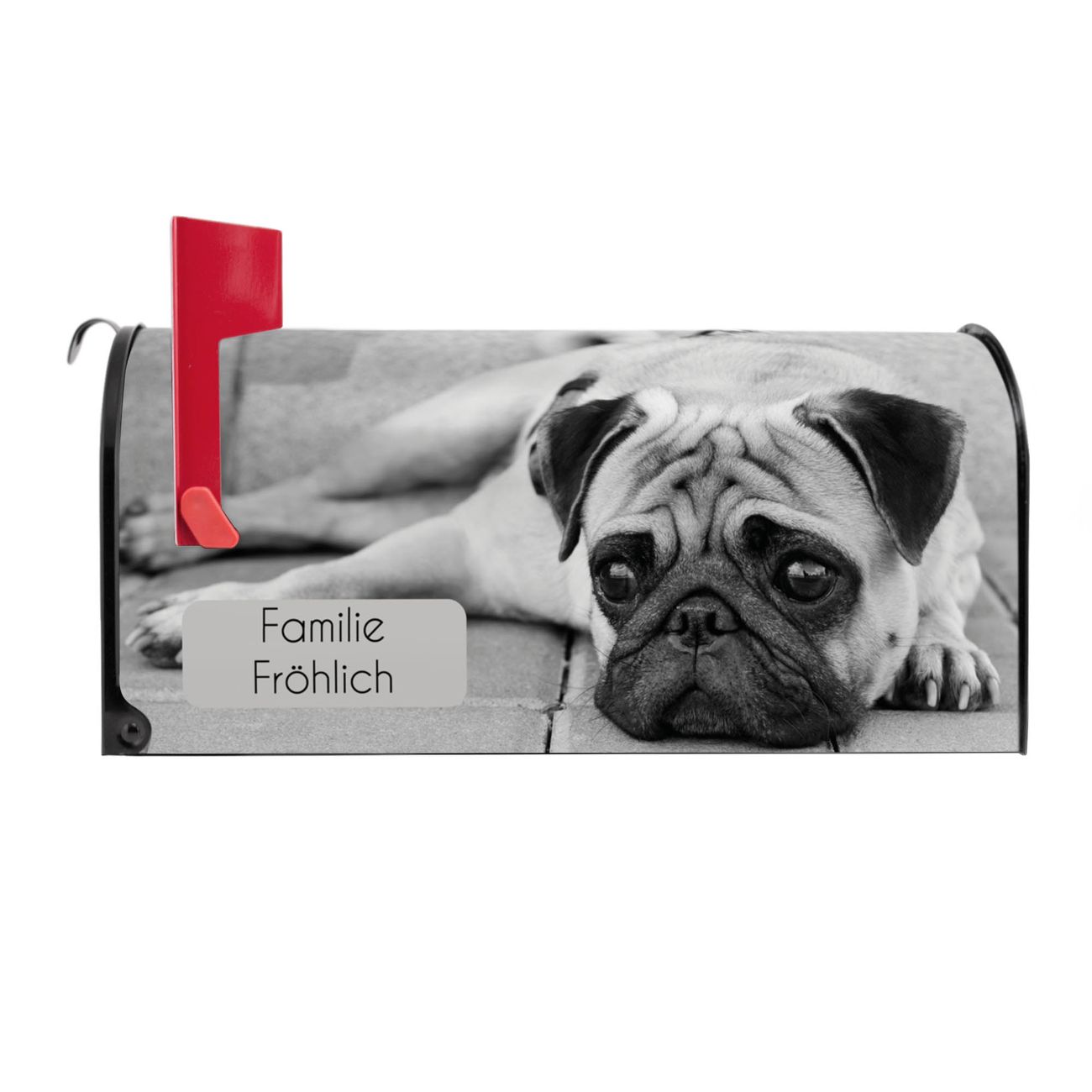 Der amerikanische Briefkasten von banjado mit Lotty Motiv bietet Ihnen ausreichend Fassungsvermögen, um große A4 Sendungen und Zeitschriften zu empfangen. Die typisch amerikanische rote Fahne zeigt Ihnen an, wenn Sie Post erhalten haben. Die US-Mailbox besteht aus verzinktem Stahlblech welches lackiert wurde und ist 48 x 22 x 16 CM (BxHxT) groß. Die Folie mit Motiv Lotty besteht aus einer wetter- und UV-resistenten Folie, die mit einem Schutzlaminat überzogen ist, sodass die US Mailbox zusätzlich vor Kratzern geschützt ist. An der Unterkante sind 4 Löcher je Seite um die Mailbox, typisch amerikanisch, an einem Holzpfahl oder einem Zaun zu befestigen. Auf Wunsch können Sie bei uns den passenden Standfuß oder die passende Wandhalterung kaufen um die US-Mailbox sicher zu befestigen. Wir bieten Ihnen ebenfalls Namensschilder, bereits beschriftet oder frei zu beschriften, und verschiedene selbst gestaltete Bitte-Keine-Werbung-Aufkleber.