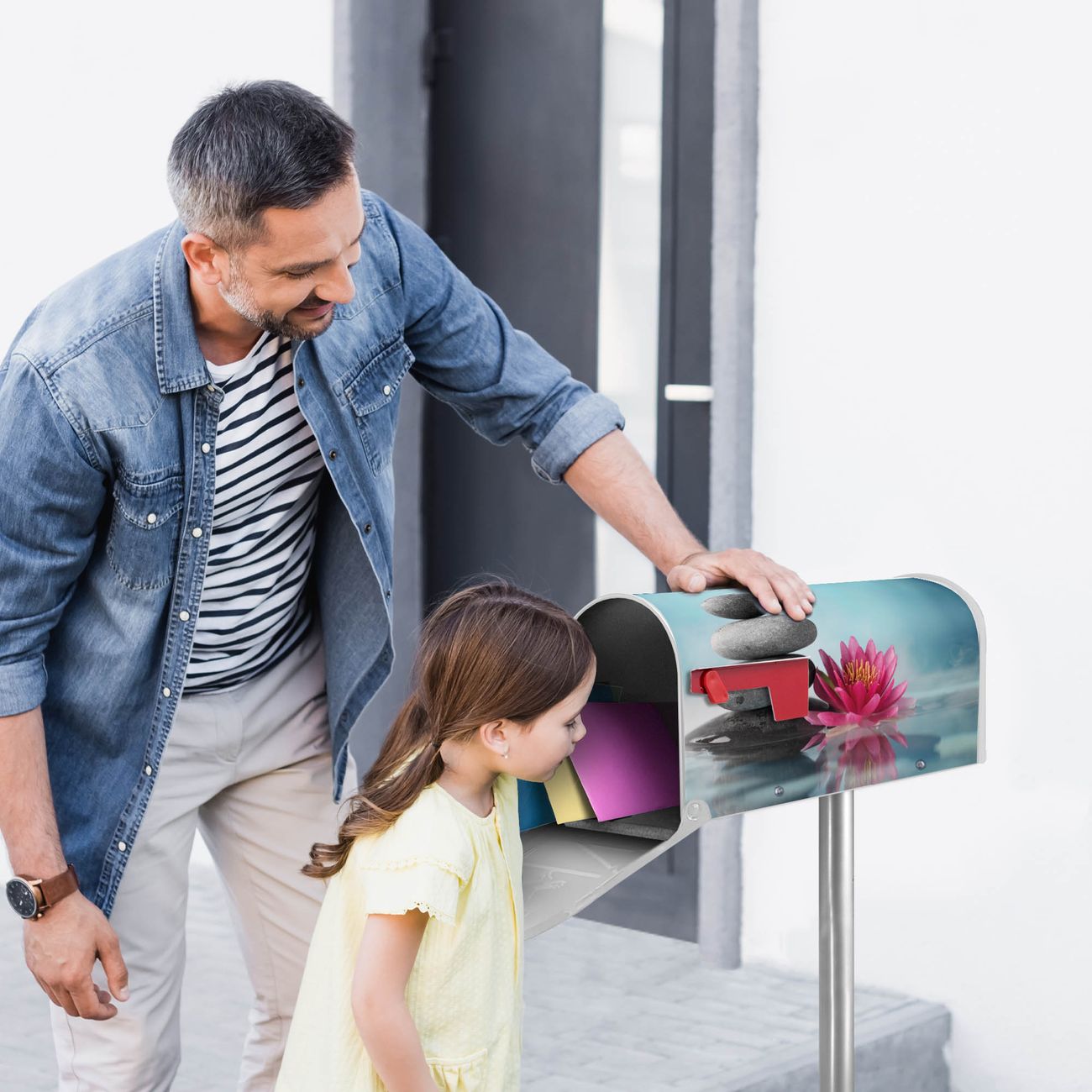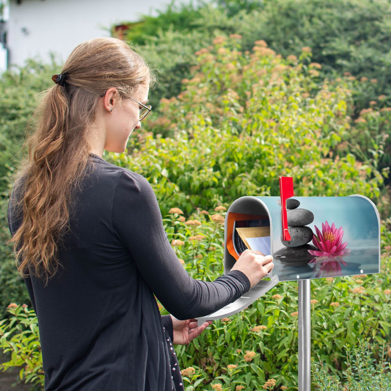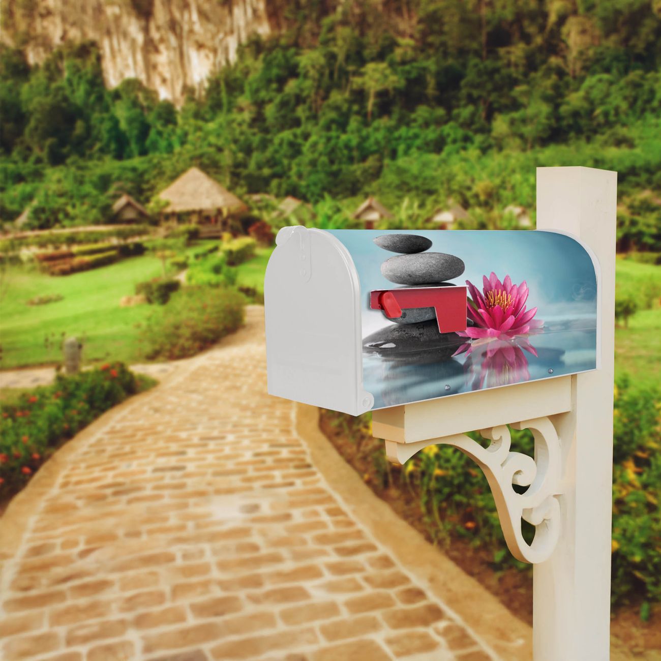 Der amerikanische Briefkasten von banjado mit Lotus Und Steine Motiv bietet Ihnen ausreichend Fassungsvermögen, um große A4 Sendungen und Zeitschriften zu empfangen. Die typisch amerikanische rote Fahne zeigt Ihnen an, wenn Sie Post erhalten haben. Die US-Mailbox besteht aus verzinktem Stahlblech welches lackiert wurde und ist 48 x 22 x 16 CM (BxHxT) groß. Die Folie mit Motiv Lotus Und Steine besteht aus einer wetter- und UV-resistenten Folie, die mit einem Schutzlaminat überzogen ist, sodass die US Mailbox zusätzlich vor Kratzern geschützt ist. An der Unterkante sind 4 Löcher je Seite um die Mailbox, typisch amerikanisch, an einem Holzpfahl oder einem Zaun zu befestigen. Auf Wunsch können Sie bei uns den passenden Standfuß oder die passende Wandhalterung kaufen um die US-Mailbox sicher zu befestigen. Wir bieten Ihnen ebenfalls Namensschilder, bereits beschriftet oder frei zu beschriften, und verschiedene selbst gestaltete Bitte-Keine-Werbung-Aufkleber.