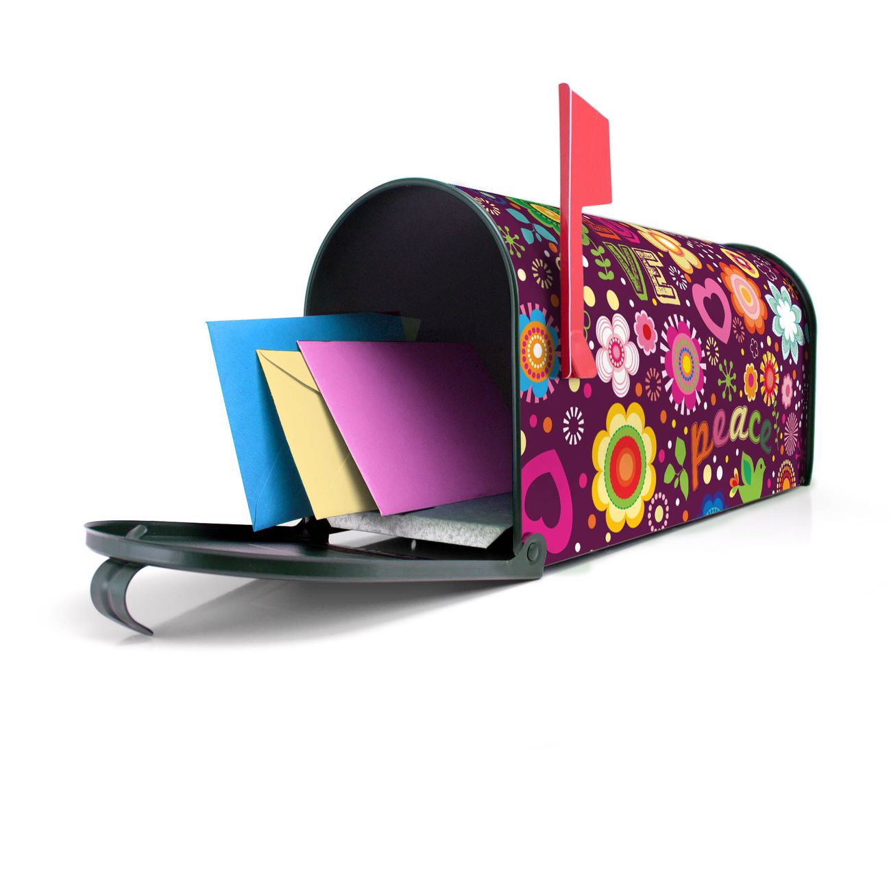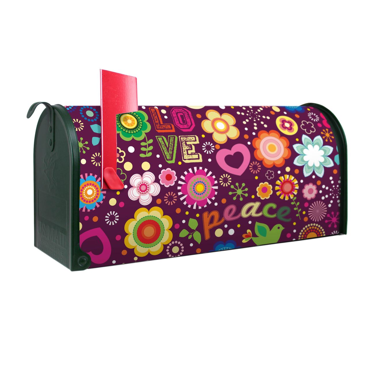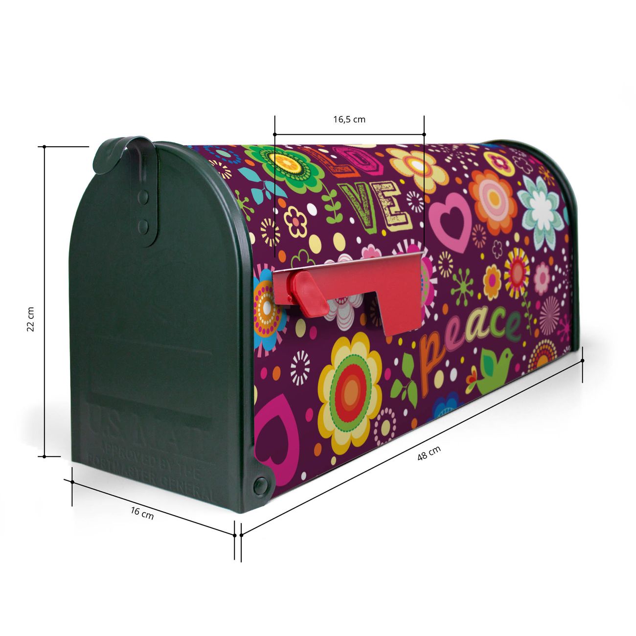 Der amerikanische Briefkasten von banjado mit Love and Peace Motiv bietet Ihnen ausreichend Fassungsvermögen, um große A4 Sendungen und Zeitschriften zu empfangen. Die typisch amerikanische rote Fahne zeigt Ihnen an, wenn Sie Post erhalten haben. Die US-Mailbox besteht aus verzinktem Stahlblech welches lackiert wurde und ist 48 x 22 x 16 CM (BxHxT) groß. Die Folie mit Motiv Love and Peace besteht aus einer wetter- und UV-resistenten Folie, die mit einem Schutzlaminat überzogen ist, sodass die US Mailbox zusätzlich vor Kratzern geschützt ist. An der Unterkante sind 4 Löcher je Seite um die Mailbox, typisch amerikanisch, an einem Holzpfahl oder einem Zaun zu befestigen. Auf Wunsch können Sie bei uns den passenden Standfuß oder die passende Wandhalterung kaufen um die US-Mailbox sicher zu befestigen. Wir bieten Ihnen ebenfalls Namensschilder, bereits beschriftet oder frei zu beschriften, und verschiedene selbst gestaltete Bitte-Keine-Werbung-Aufkleber.