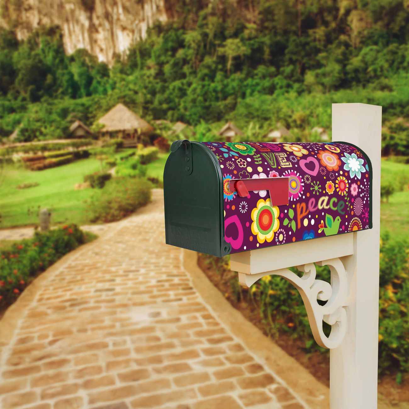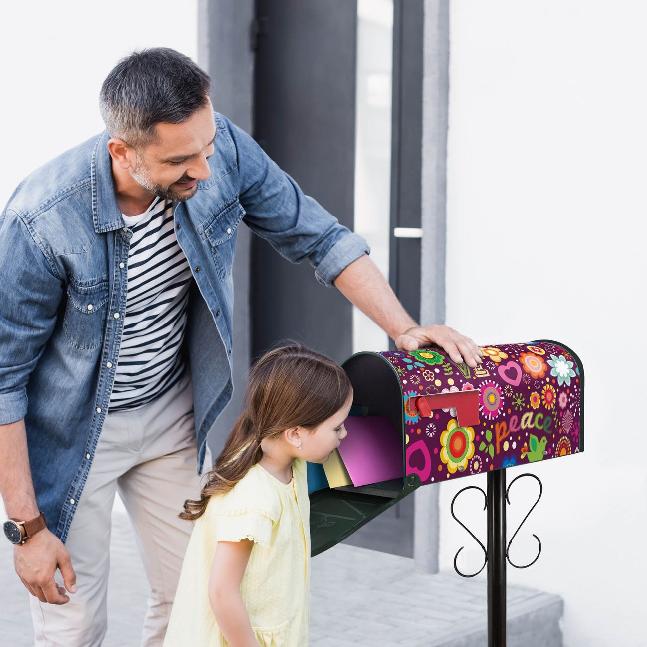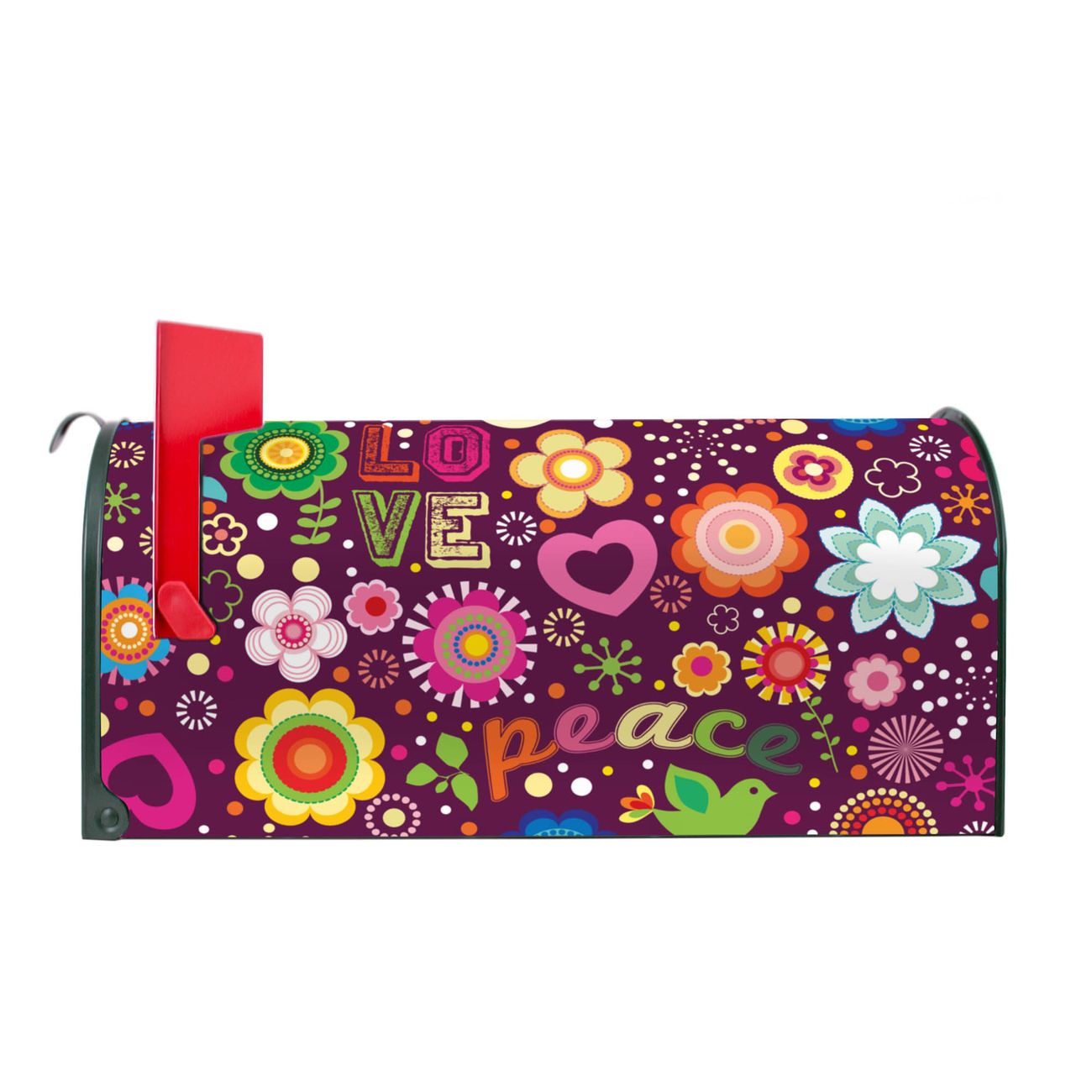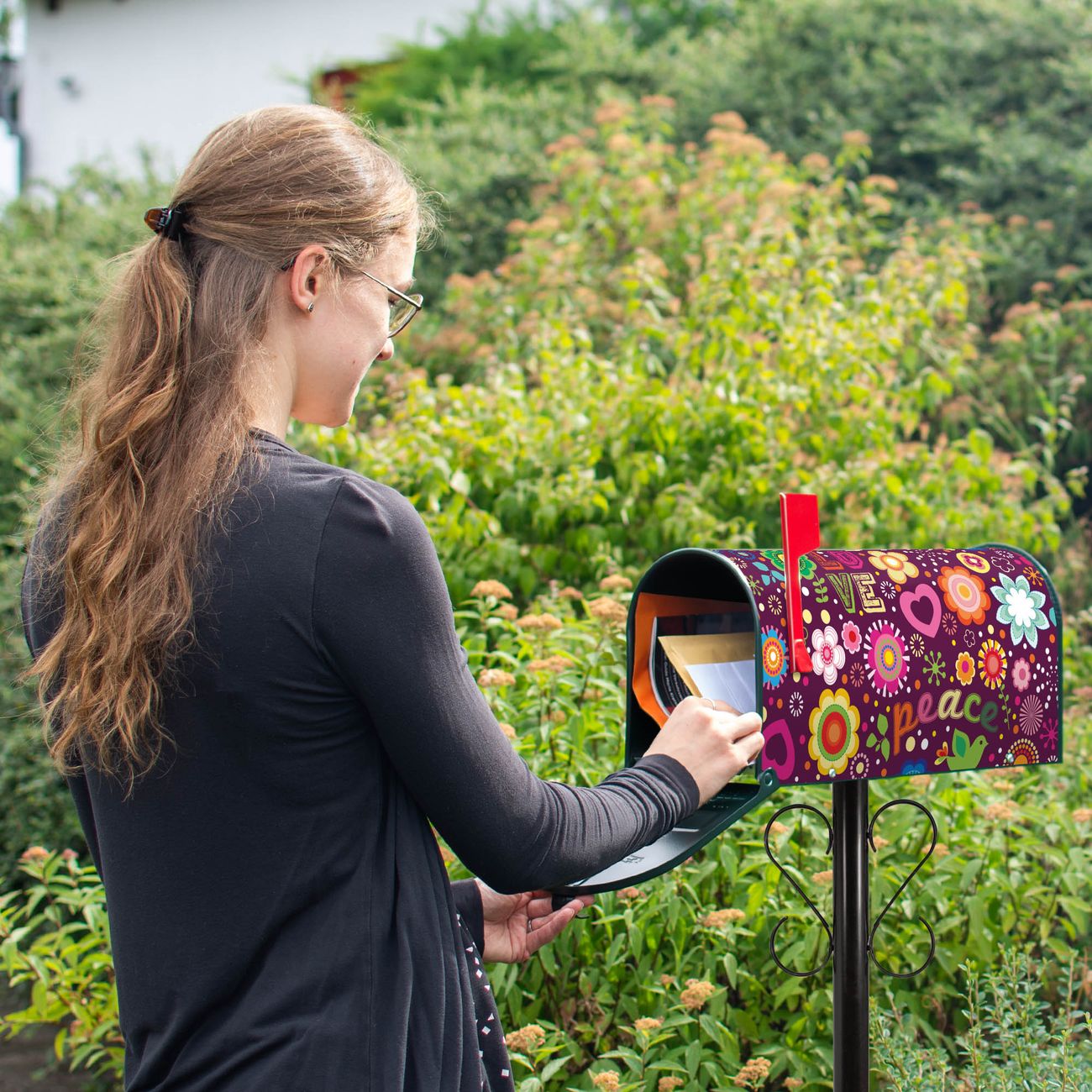 Der amerikanische Briefkasten von banjado mit Love and Peace Motiv bietet Ihnen ausreichend Fassungsvermögen, um große A4 Sendungen und Zeitschriften zu empfangen. Die typisch amerikanische rote Fahne zeigt Ihnen an, wenn Sie Post erhalten haben. Die US-Mailbox besteht aus verzinktem Stahlblech welches lackiert wurde und ist 48 x 22 x 16 CM (BxHxT) groß. Die Folie mit Motiv Love and Peace besteht aus einer wetter- und UV-resistenten Folie, die mit einem Schutzlaminat überzogen ist, sodass die US Mailbox zusätzlich vor Kratzern geschützt ist. An der Unterkante sind 4 Löcher je Seite um die Mailbox, typisch amerikanisch, an einem Holzpfahl oder einem Zaun zu befestigen. Auf Wunsch können Sie bei uns den passenden Standfuß oder die passende Wandhalterung kaufen um die US-Mailbox sicher zu befestigen. Wir bieten Ihnen ebenfalls Namensschilder, bereits beschriftet oder frei zu beschriften, und verschiedene selbst gestaltete Bitte-Keine-Werbung-Aufkleber.