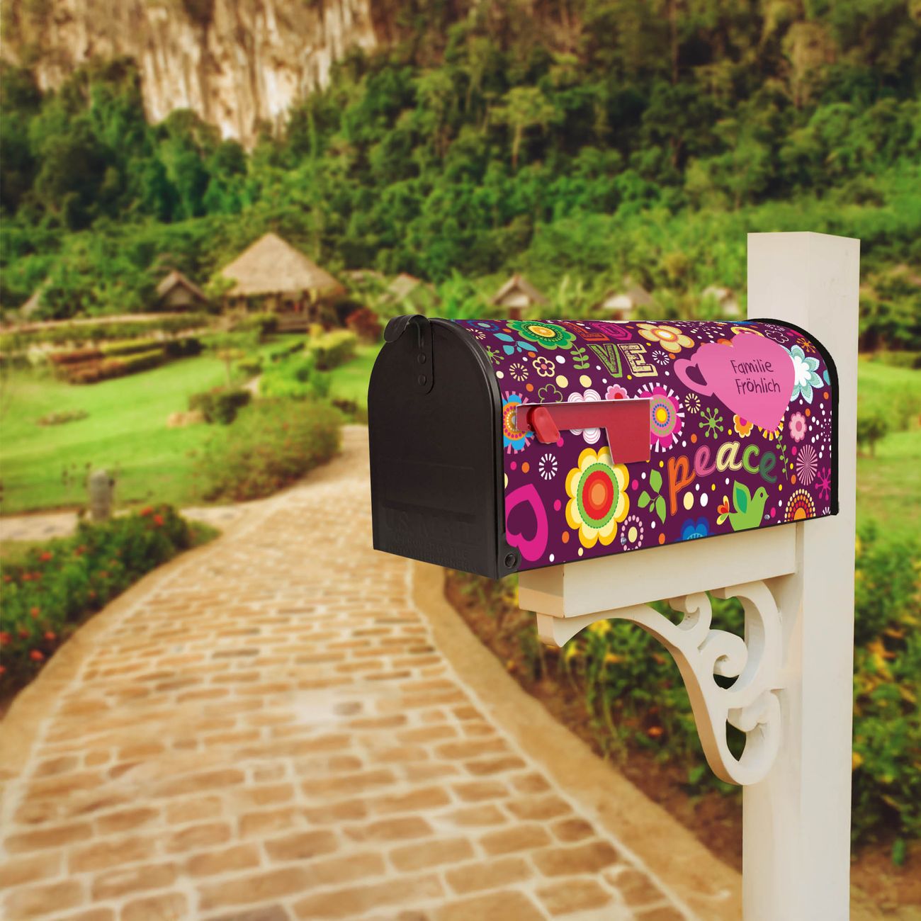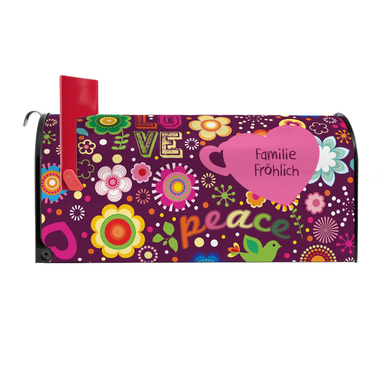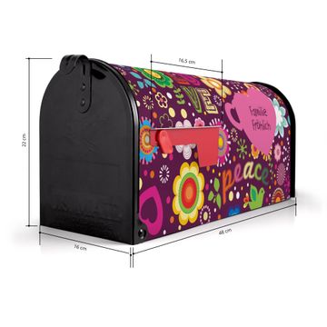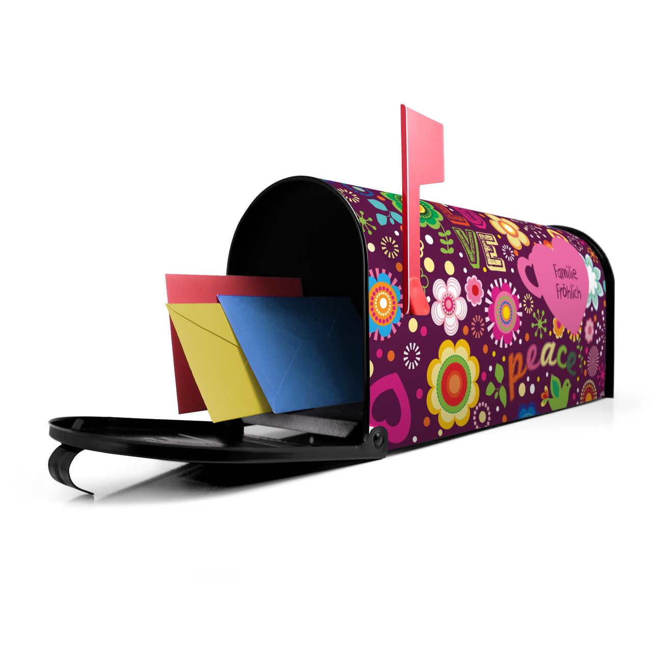 Der amerikanische Briefkasten von banjado mit Love and Peace Motiv bietet Ihnen ausreichend Fassungsvermögen, um große A4 Sendungen und Zeitschriften zu empfangen. Die typisch amerikanische rote Fahne zeigt Ihnen an, wenn Sie Post erhalten haben. Die US-Mailbox besteht aus verzinktem Stahlblech welches lackiert wurde und ist 48 x 22 x 16 CM (BxHxT) groß. Die Folie mit Motiv Love and Peace besteht aus einer wetter- und UV-resistenten Folie, die mit einem Schutzlaminat überzogen ist, sodass die US Mailbox zusätzlich vor Kratzern geschützt ist. An der Unterkante sind 4 Löcher je Seite um die Mailbox, typisch amerikanisch, an einem Holzpfahl oder einem Zaun zu befestigen. Auf Wunsch können Sie bei uns den passenden Standfuß oder die passende Wandhalterung kaufen um die US-Mailbox sicher zu befestigen. Wir bieten Ihnen ebenfalls Namensschilder, bereits beschriftet oder frei zu beschriften, und verschiedene selbst gestaltete Bitte-Keine-Werbung-Aufkleber.