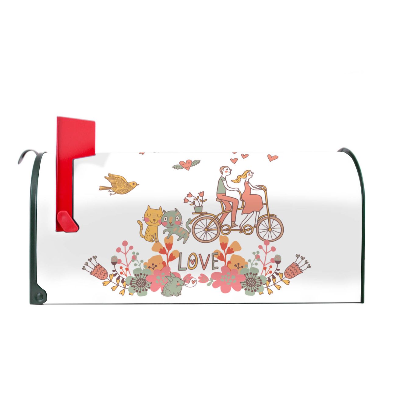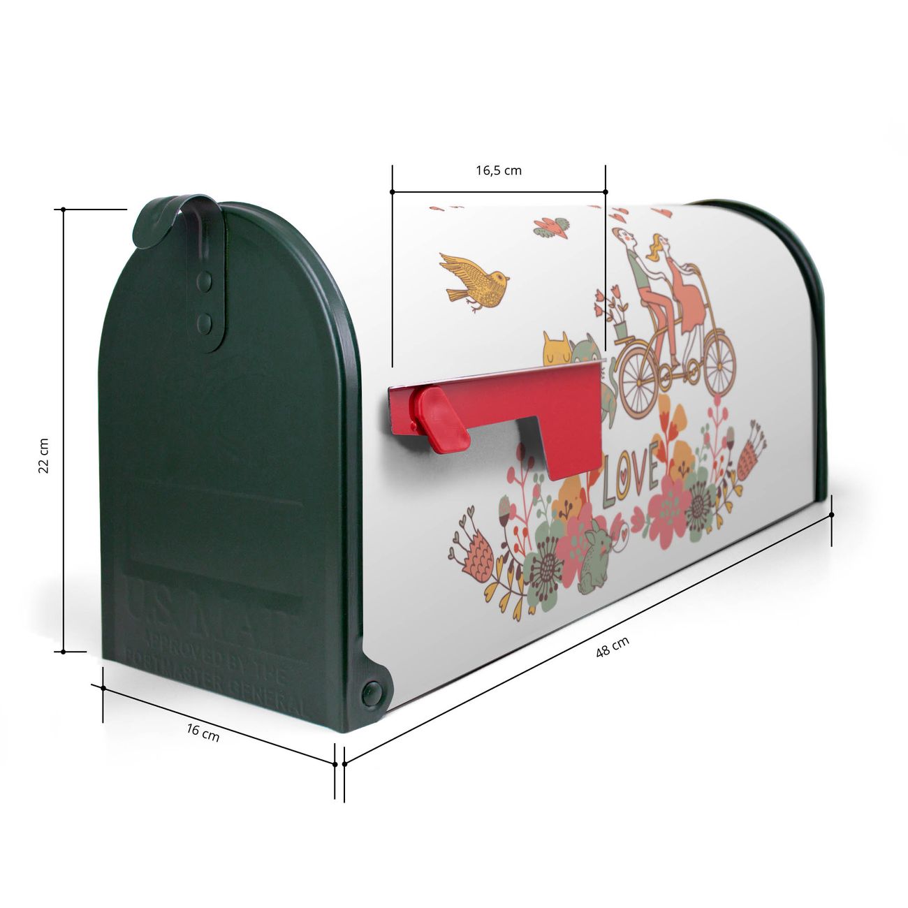 Der amerikanische Briefkasten von banjado mit Love Motiv bietet Ihnen ausreichend Fassungsvermögen, um große A4 Sendungen und Zeitschriften zu empfangen. Die typisch amerikanische rote Fahne zeigt Ihnen an, wenn Sie Post erhalten haben. Die US-Mailbox besteht aus verzinktem Stahlblech welches lackiert wurde und ist 48 x 22 x 16 CM (BxHxT) groß. Die Folie mit Motiv Love besteht aus einer wetter- und UV-resistenten Folie, die mit einem Schutzlaminat überzogen ist, sodass die US Mailbox zusätzlich vor Kratzern geschützt ist. An der Unterkante sind 4 Löcher je Seite um die Mailbox, typisch amerikanisch, an einem Holzpfahl oder einem Zaun zu befestigen. Auf Wunsch können Sie bei uns den passenden Standfuß oder die passende Wandhalterung kaufen um die US-Mailbox sicher zu befestigen. Wir bieten Ihnen ebenfalls Namensschilder, bereits beschriftet oder frei zu beschriften, und verschiedene selbst gestaltete Bitte-Keine-Werbung-Aufkleber.