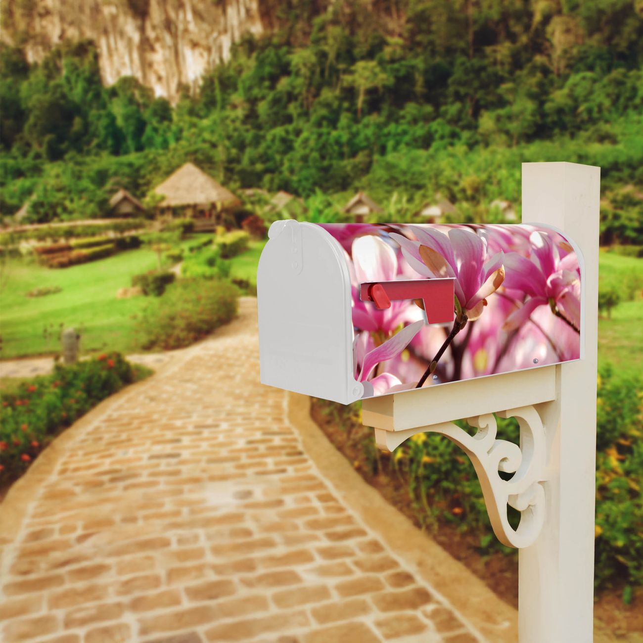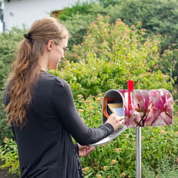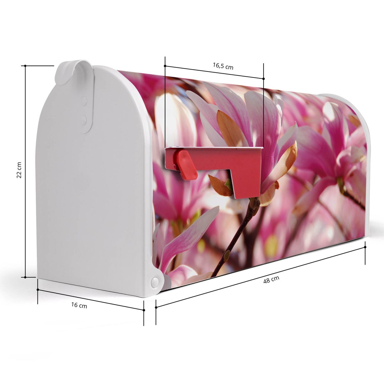 Der amerikanische Briefkasten von banjado mit Magnolia Motiv bietet Ihnen ausreichend Fassungsvermögen, um große A4 Sendungen und Zeitschriften zu empfangen. Die typisch amerikanische rote Fahne zeigt Ihnen an, wenn Sie Post erhalten haben. Die US-Mailbox besteht aus verzinktem Stahlblech welches lackiert wurde und ist 48 x 22 x 16 CM (BxHxT) groß. Die Folie mit Motiv Magnolia besteht aus einer wetter- und UV-resistenten Folie, die mit einem Schutzlaminat überzogen ist, sodass die US Mailbox zusätzlich vor Kratzern geschützt ist. An der Unterkante sind 4 Löcher je Seite um die Mailbox, typisch amerikanisch, an einem Holzpfahl oder einem Zaun zu befestigen. Auf Wunsch können Sie bei uns den passenden Standfuß oder die passende Wandhalterung kaufen um die US-Mailbox sicher zu befestigen. Wir bieten Ihnen ebenfalls Namensschilder, bereits beschriftet oder frei zu beschriften, und verschiedene selbst gestaltete Bitte-Keine-Werbung-Aufkleber.