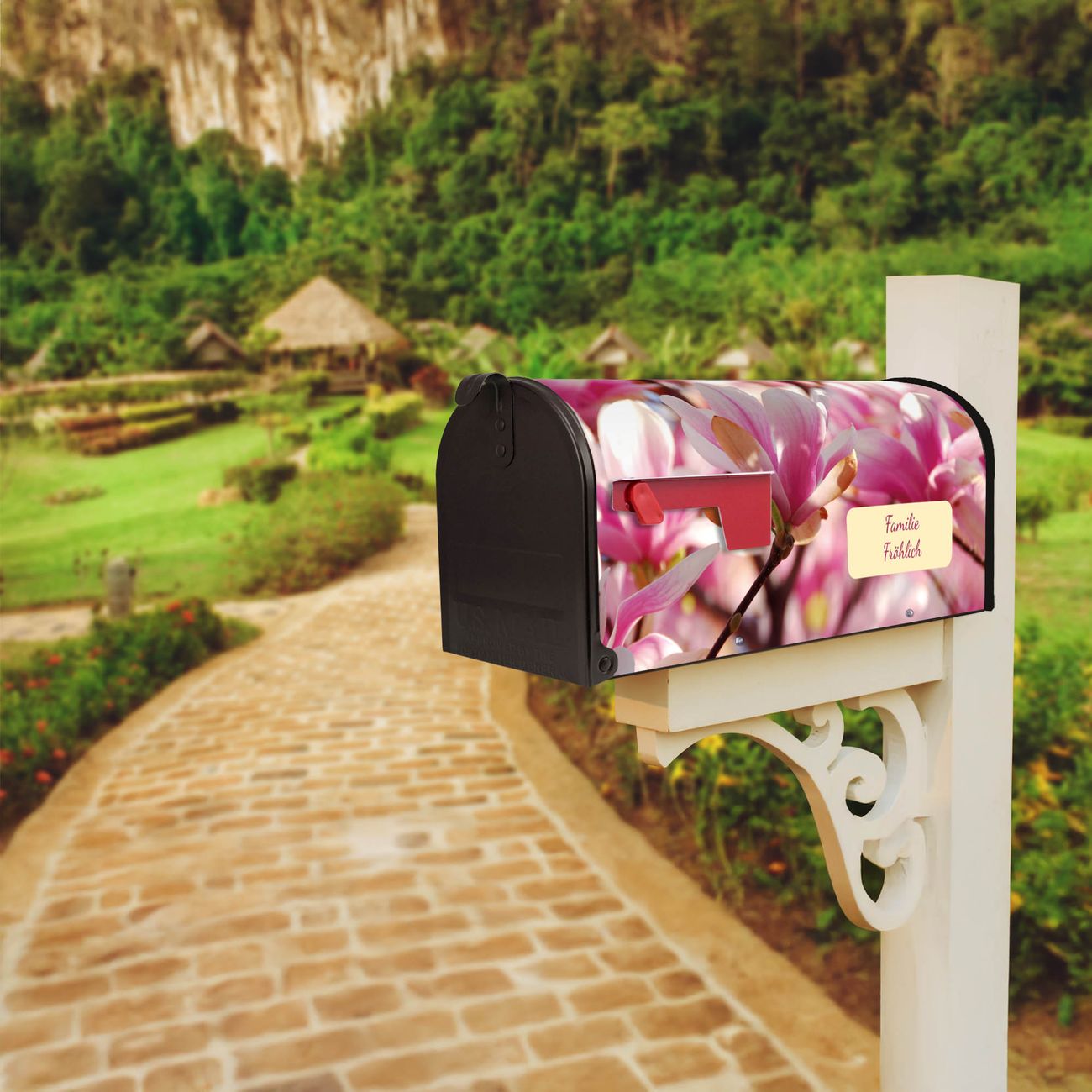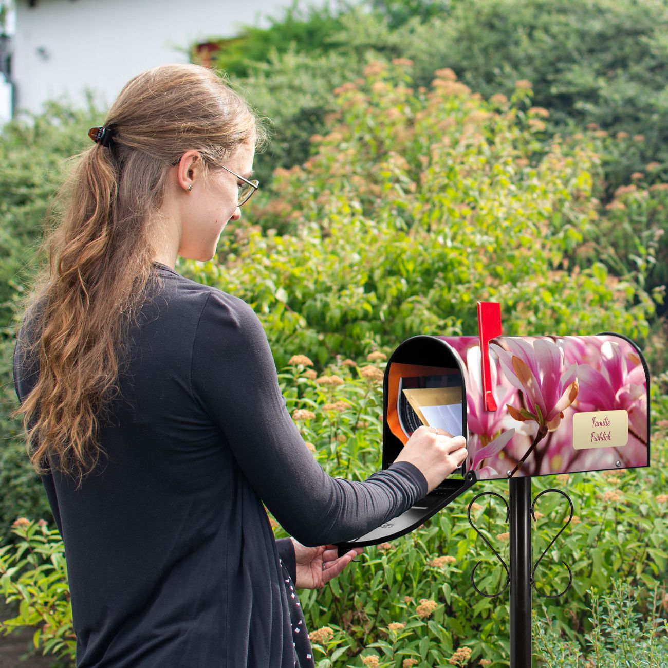 Der amerikanische Briefkasten von banjado mit Magnolia Motiv bietet Ihnen ausreichend Fassungsvermögen, um große A4 Sendungen und Zeitschriften zu empfangen. Die typisch amerikanische rote Fahne zeigt Ihnen an, wenn Sie Post erhalten haben. Die US-Mailbox besteht aus verzinktem Stahlblech welches lackiert wurde und ist 48 x 22 x 16 CM (BxHxT) groß. Die Folie mit Motiv Magnolia besteht aus einer wetter- und UV-resistenten Folie, die mit einem Schutzlaminat überzogen ist, sodass die US Mailbox zusätzlich vor Kratzern geschützt ist. An der Unterkante sind 4 Löcher je Seite um die Mailbox, typisch amerikanisch, an einem Holzpfahl oder einem Zaun zu befestigen. Auf Wunsch können Sie bei uns den passenden Standfuß oder die passende Wandhalterung kaufen um die US-Mailbox sicher zu befestigen. Wir bieten Ihnen ebenfalls Namensschilder, bereits beschriftet oder frei zu beschriften, und verschiedene selbst gestaltete Bitte-Keine-Werbung-Aufkleber.