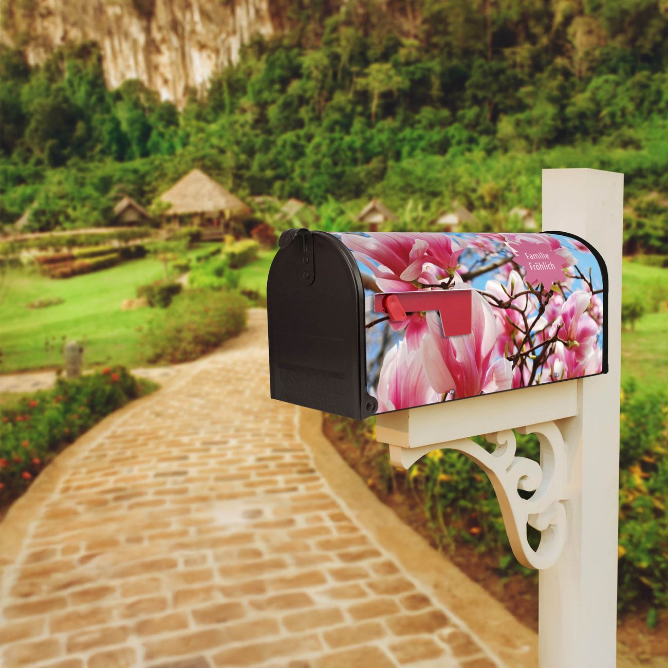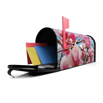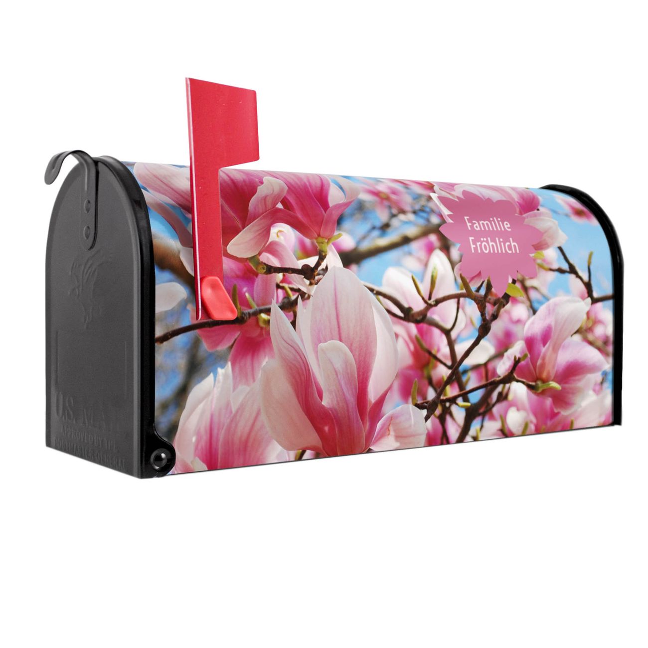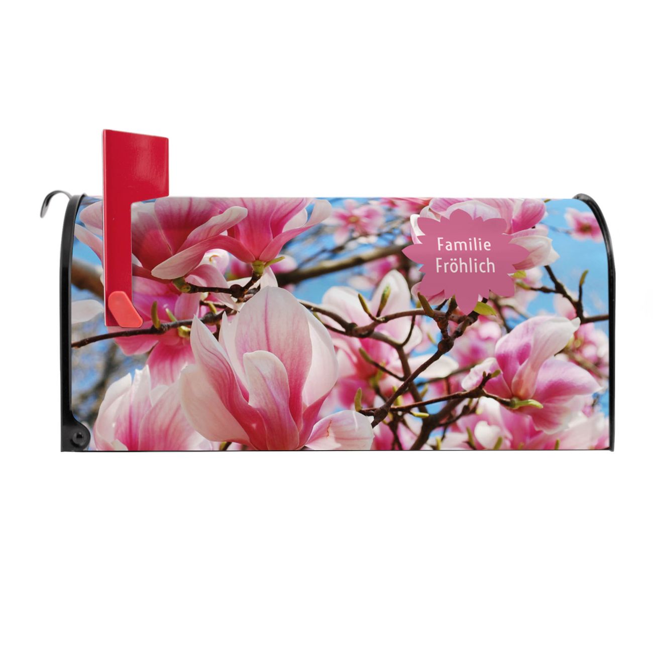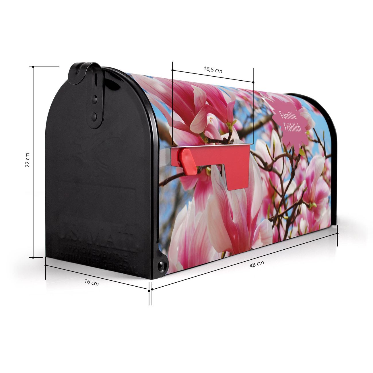 Der amerikanische Briefkasten von banjado mit Magnolienbaum Motiv bietet Ihnen ausreichend Fassungsvermögen, um große A4 Sendungen und Zeitschriften zu empfangen. Die typisch amerikanische rote Fahne zeigt Ihnen an, wenn Sie Post erhalten haben. Die US-Mailbox besteht aus verzinktem Stahlblech welches lackiert wurde und ist 48 x 22 x 16 CM (BxHxT) groß. Die Folie mit Motiv Magnolienbaum besteht aus einer wetter- und UV-resistenten Folie, die mit einem Schutzlaminat überzogen ist, sodass die US Mailbox zusätzlich vor Kratzern geschützt ist. An der Unterkante sind 4 Löcher je Seite um die Mailbox, typisch amerikanisch, an einem Holzpfahl oder einem Zaun zu befestigen. Auf Wunsch können Sie bei uns den passenden Standfuß oder die passende Wandhalterung kaufen um die US-Mailbox sicher zu befestigen. Wir bieten Ihnen ebenfalls Namensschilder, bereits beschriftet oder frei zu beschriften, und verschiedene selbst gestaltete Bitte-Keine-Werbung-Aufkleber.