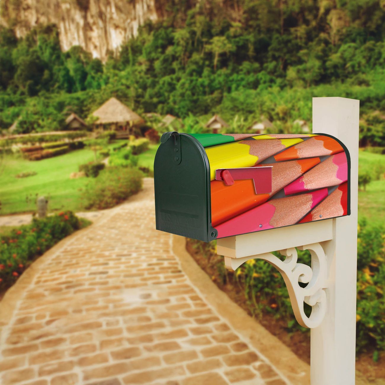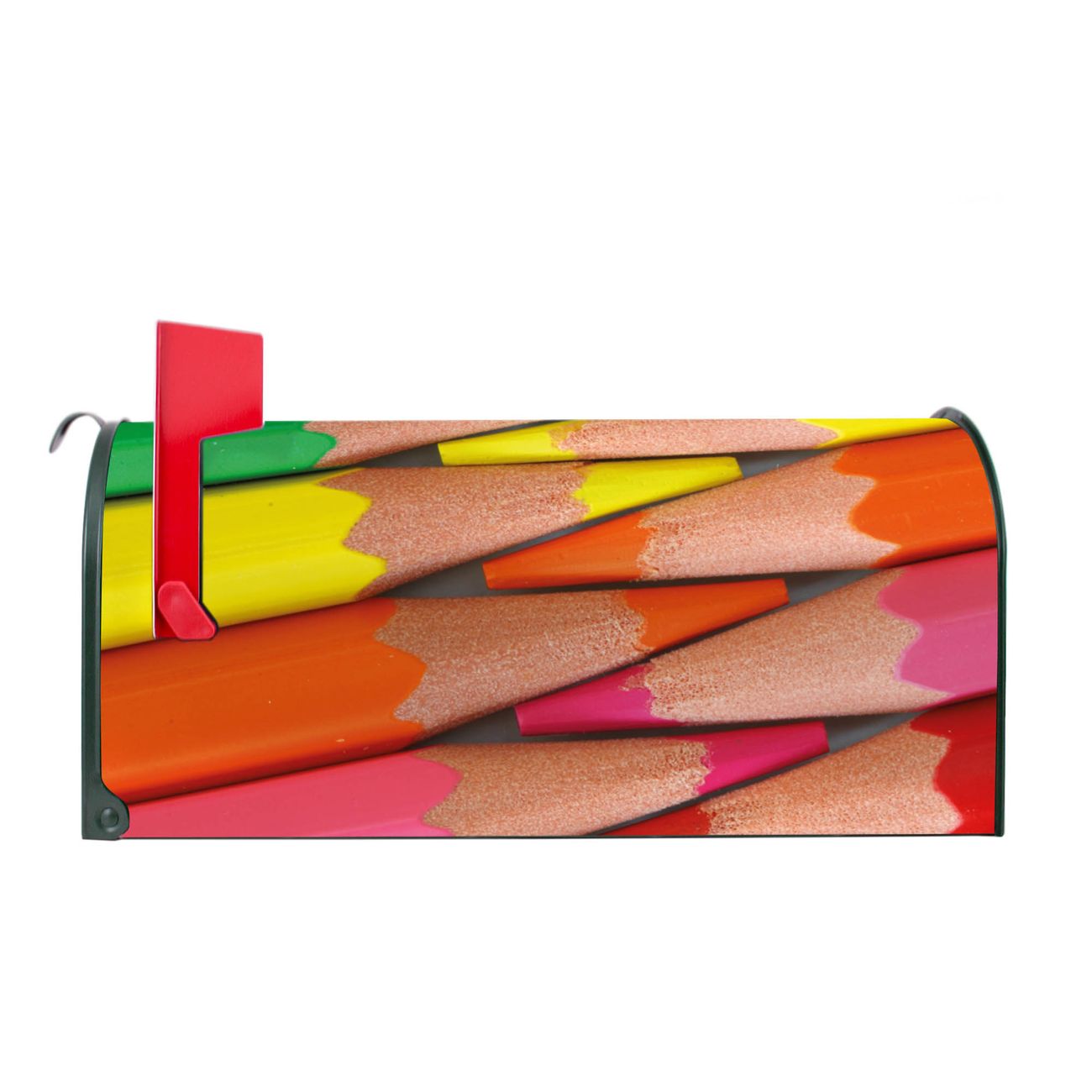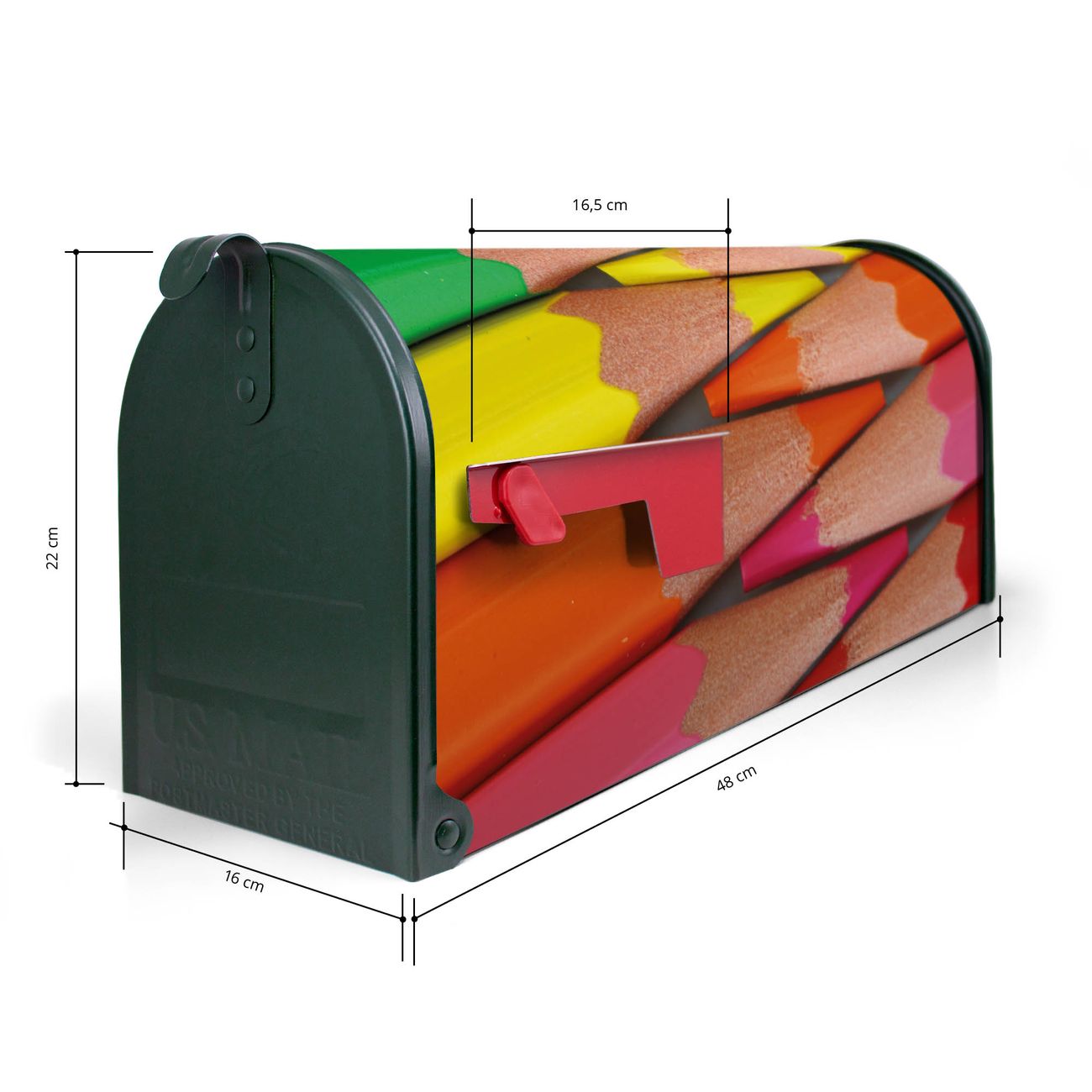 Der amerikanische Briefkasten von banjado mit Malstifte Motiv bietet Ihnen ausreichend Fassungsvermögen, um große A4 Sendungen und Zeitschriften zu empfangen. Die typisch amerikanische rote Fahne zeigt Ihnen an, wenn Sie Post erhalten haben. Die US-Mailbox besteht aus verzinktem Stahlblech welches lackiert wurde und ist 48 x 22 x 16 CM (BxHxT) groß. Die Folie mit Motiv Malstifte besteht aus einer wetter- und UV-resistenten Folie, die mit einem Schutzlaminat überzogen ist, sodass die US Mailbox zusätzlich vor Kratzern geschützt ist. An der Unterkante sind 4 Löcher je Seite um die Mailbox, typisch amerikanisch, an einem Holzpfahl oder einem Zaun zu befestigen. Auf Wunsch können Sie bei uns den passenden Standfuß oder die passende Wandhalterung kaufen um die US-Mailbox sicher zu befestigen. Wir bieten Ihnen ebenfalls Namensschilder, bereits beschriftet oder frei zu beschriften, und verschiedene selbst gestaltete Bitte-Keine-Werbung-Aufkleber.