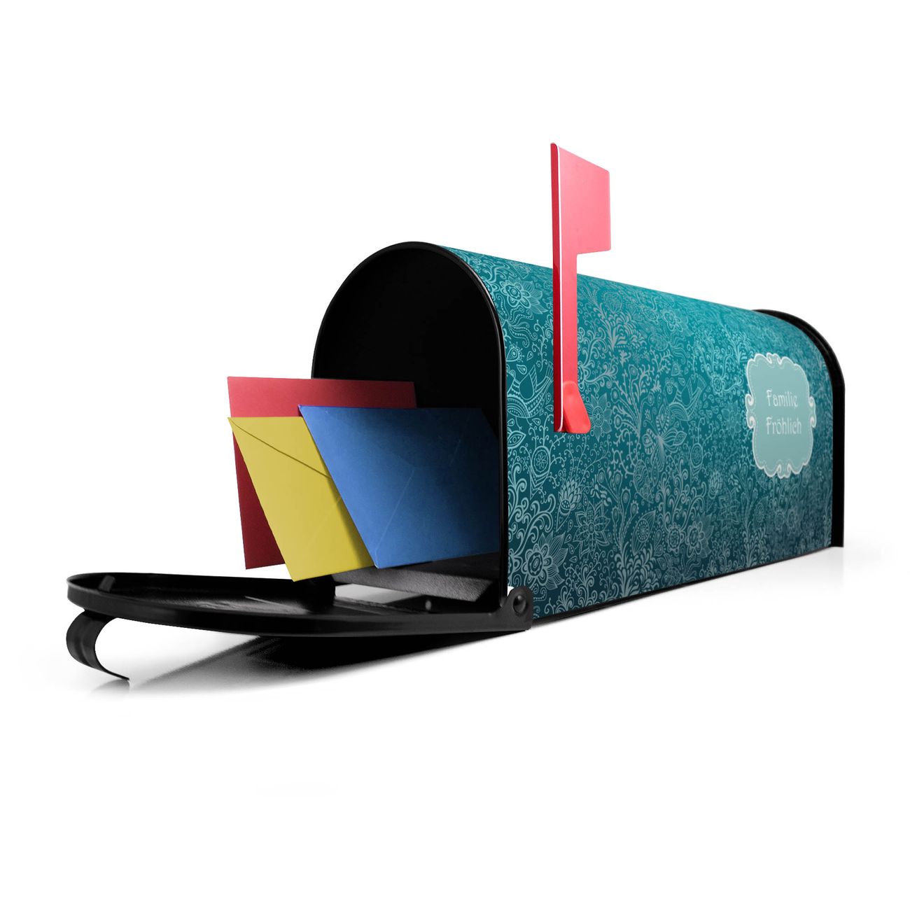 Der amerikanische Briefkasten von banjado mit Mandala Landschaft Motiv bietet Ihnen ausreichend Fassungsvermögen, um große A4 Sendungen und Zeitschriften zu empfangen. Die typisch amerikanische rote Fahne zeigt Ihnen an, wenn Sie Post erhalten haben. Die US-Mailbox besteht aus verzinktem Stahlblech welches lackiert wurde und ist 48 x 22 x 16 CM (BxHxT) groß. Die Folie mit Motiv Mandala Landschaft besteht aus einer wetter- und UV-resistenten Folie, die mit einem Schutzlaminat überzogen ist, sodass die US Mailbox zusätzlich vor Kratzern geschützt ist. An der Unterkante sind 4 Löcher je Seite um die Mailbox, typisch amerikanisch, an einem Holzpfahl oder einem Zaun zu befestigen. Auf Wunsch können Sie bei uns den passenden Standfuß oder die passende Wandhalterung kaufen um die US-Mailbox sicher zu befestigen. Wir bieten Ihnen ebenfalls Namensschilder, bereits beschriftet oder frei zu beschriften, und verschiedene selbst gestaltete Bitte-Keine-Werbung-Aufkleber.