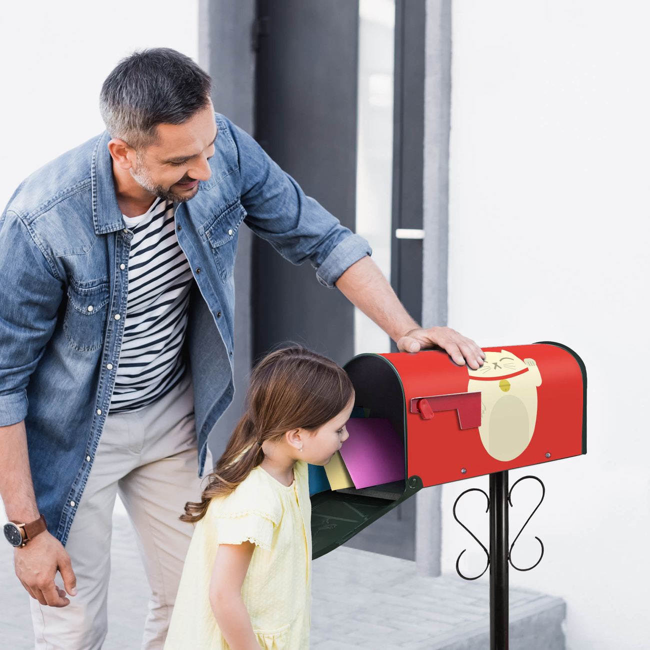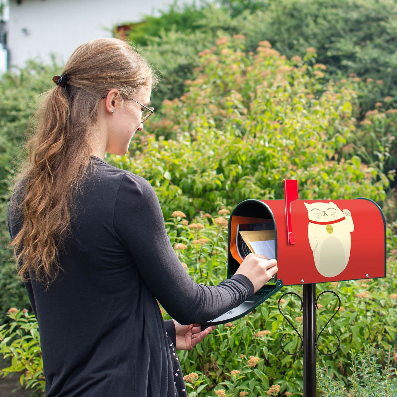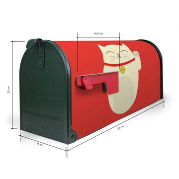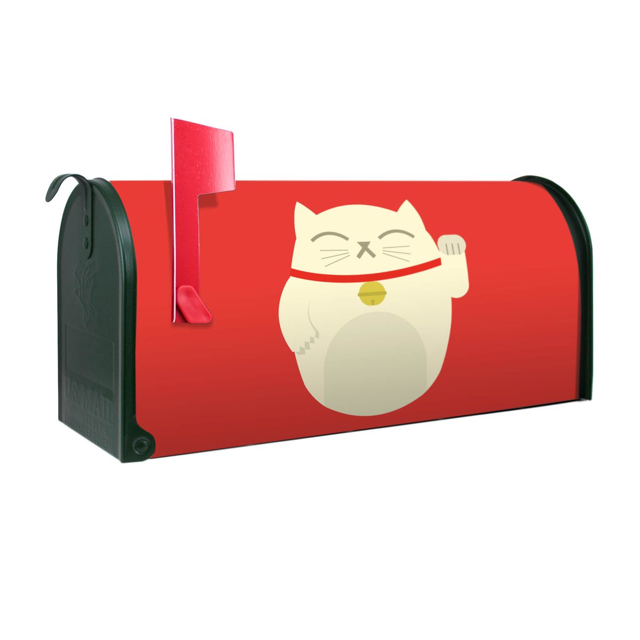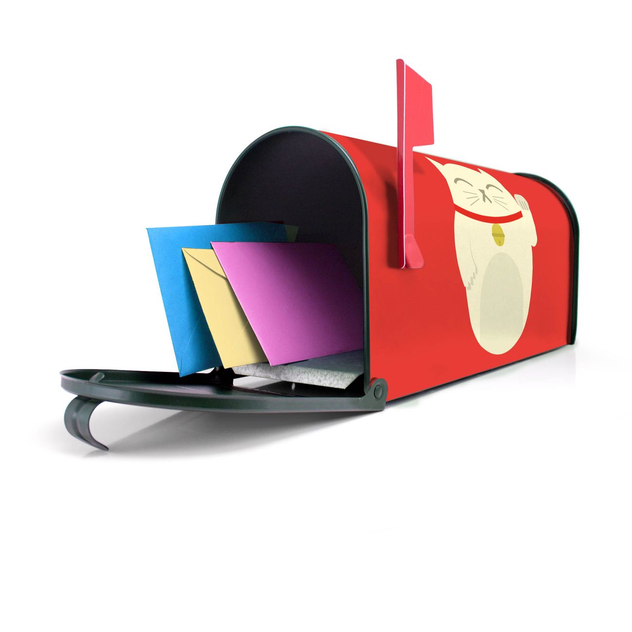 Der amerikanische Briefkasten von banjado mit Manekineko Motiv bietet Ihnen ausreichend Fassungsvermögen, um große A4 Sendungen und Zeitschriften zu empfangen. Die typisch amerikanische rote Fahne zeigt Ihnen an, wenn Sie Post erhalten haben. Die US-Mailbox besteht aus verzinktem Stahlblech welches lackiert wurde und ist 48 x 22 x 16 CM (BxHxT) groß. Die Folie mit Motiv Manekineko besteht aus einer wetter- und UV-resistenten Folie, die mit einem Schutzlaminat überzogen ist, sodass die US Mailbox zusätzlich vor Kratzern geschützt ist. An der Unterkante sind 4 Löcher je Seite um die Mailbox, typisch amerikanisch, an einem Holzpfahl oder einem Zaun zu befestigen. Auf Wunsch können Sie bei uns den passenden Standfuß oder die passende Wandhalterung kaufen um die US-Mailbox sicher zu befestigen. Wir bieten Ihnen ebenfalls Namensschilder, bereits beschriftet oder frei zu beschriften, und verschiedene selbst gestaltete Bitte-Keine-Werbung-Aufkleber.