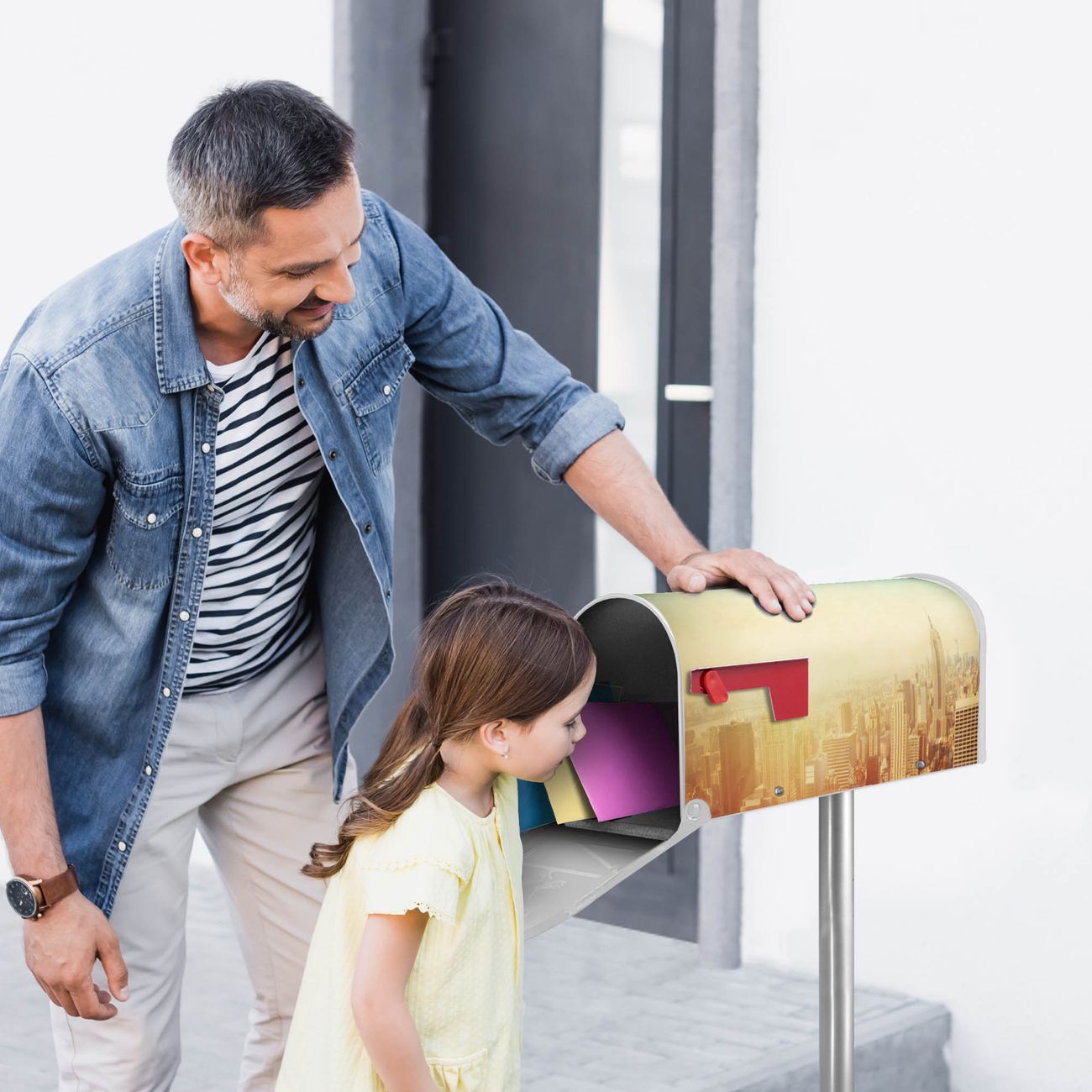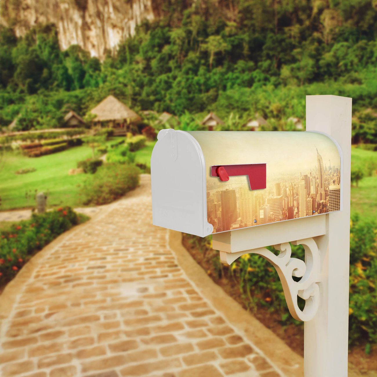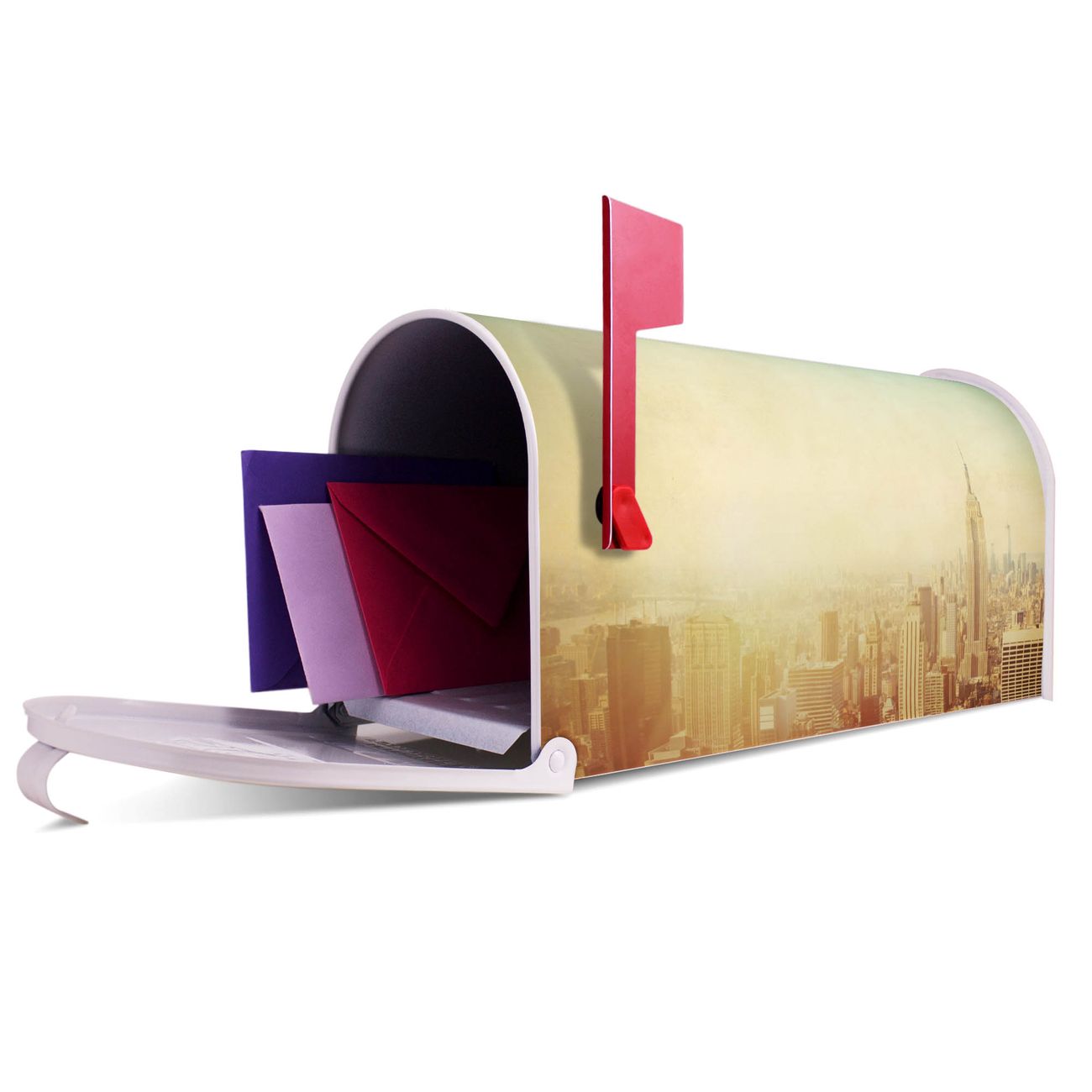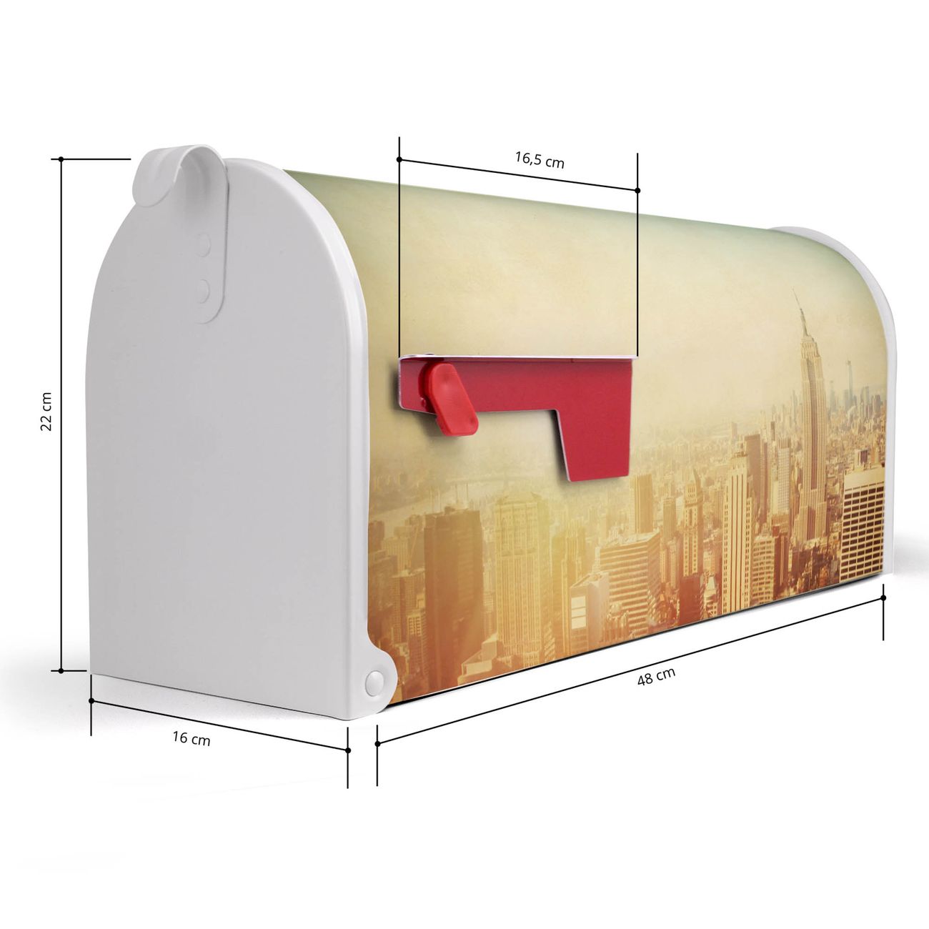 Der amerikanische Briefkasten von banjado mit Manhattan 2 Motiv bietet Ihnen ausreichend Fassungsvermögen, um große A4 Sendungen und Zeitschriften zu empfangen. Die typisch amerikanische rote Fahne zeigt Ihnen an, wenn Sie Post erhalten haben. Die US-Mailbox besteht aus verzinktem Stahlblech welches lackiert wurde und ist 48 x 22 x 16 CM (BxHxT) groß. Die Folie mit Motiv Manhattan 2 besteht aus einer wetter- und UV-resistenten Folie, die mit einem Schutzlaminat überzogen ist, sodass die US Mailbox zusätzlich vor Kratzern geschützt ist. An der Unterkante sind 4 Löcher je Seite um die Mailbox, typisch amerikanisch, an einem Holzpfahl oder einem Zaun zu befestigen. Auf Wunsch können Sie bei uns den passenden Standfuß oder die passende Wandhalterung kaufen um die US-Mailbox sicher zu befestigen. Wir bieten Ihnen ebenfalls Namensschilder, bereits beschriftet oder frei zu beschriften, und verschiedene selbst gestaltete Bitte-Keine-Werbung-Aufkleber.